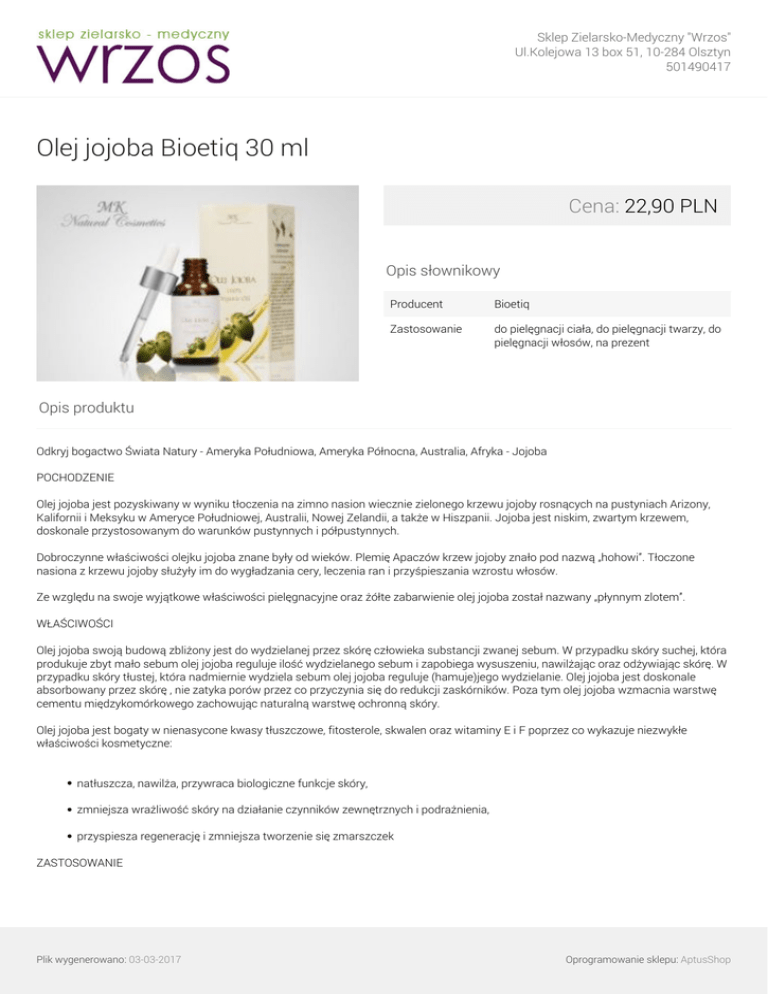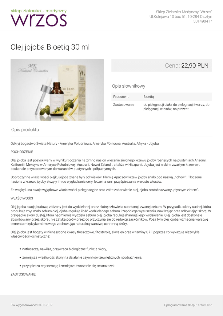 Sklep Zielarsko-Medyczny "Wrzos" Ul.Kolejowa 13 box 51, 10-284 Olsztyn 501490417 Olej jojoba Bioetiq 30 ml Cena: 22,90 PLN Opis słownikowy Producent Bioetiq Zastosowanie do pielęgnacji ciała, do pielęgnacji twarzy, do pielęgnacji włosów, na prezent Opis produktu Odkryj bogactwo Świata Natury - Ameryka Południowa, Ameryka Północna, Australia, Afryka - Jojoba POCHODZENIE Olej jojoba jest pozyskiwany w wyniku tłoczenia na zimno nasion wiecznie zielonego krzewu jojoby rosnących na pustyniach Arizony, Kalifornii i Meksyku w Ameryce Południowej, Australii, Nowej Zelandii, a także w Hiszpanii. Jojoba jest niskim, zwartym krzewem, doskonale przystosowanym do warunków pustynnych i półpustynnych. Dobroczynne właściwości olejku jojoba znane były od wieków. Plemię Apaczów krzew jojoby znało pod nazwą „hohowi”. Tłoczone nasiona z krzewu jojoby służyły im do wygładzania cery, leczenia ran i przyśpieszania wzrostu włosów. Ze względu na swoje wyjątkowe właściwości pielęgnacyjne oraz żółte zabarwienie olej jojoba został nazwany „płynnym zlotem”. WŁAŚCIWOŚCI Olej jojoba swoją budową zbliżony jest do wydzielanej przez skórę człowieka substancji zwanej sebum. W przypadku skóry suchej, która produkuje zbyt mało sebum olej jojoba reguluje ilość wydzielanego sebum i zapobiega wysuszeniu, nawilżając oraz odżywiając skórę. W przypadku skóry tłustej, która nadmiernie wydziela sebum olej jojoba reguluje (hamuje)jego wydzielanie. Olej jojoba jest doskonale absorbowany przez skórę , nie zatyka porów przez co przyczynia się do redukcji zaskórników. Poza tym olej jojoba wzmacnia warstwę cementu międzykomórkowego zachowując naturalną warstwę ochronną skóry. Olej jojoba jest bogaty w nienasycone kwasy tłuszczowe, fitosterole, skwalen oraz witaminy E i F poprzez co wykazuje niezwykłe właściwości kosmetyczne: natłuszcza, nawilża, przywraca biologiczne funkcje skóry, zmniejsza wrażliwość skóry na działanie czynników zewnętrznych i podrażnienia, przyspiesza regenerację i zmniejsza tworzenie się zmarszczek ZASTOSOWANIE Plik wygenerowano: 03-03-2017 Oprogramowanie sklepu: AptusShop Sklep Zielarsko-Medyczny "Wrzos" Ul.Kolejowa 13 box 51, 10-284 Olsztyn 501490417 Olej jojoba zaleca się stosować bezpośrednio na twarz jak również na dłonie, paznokcie i włosy. SKŁADNIKI/ INGREDIENTS: Simmondsia Chinensis (Jojoba) Seed Oil Producent Bioetiq Plik wygenerowano: 03-03-2017 Powered by TCPDF (www.tcpdf.org) Oprogramowanie sklepu: AptusShop