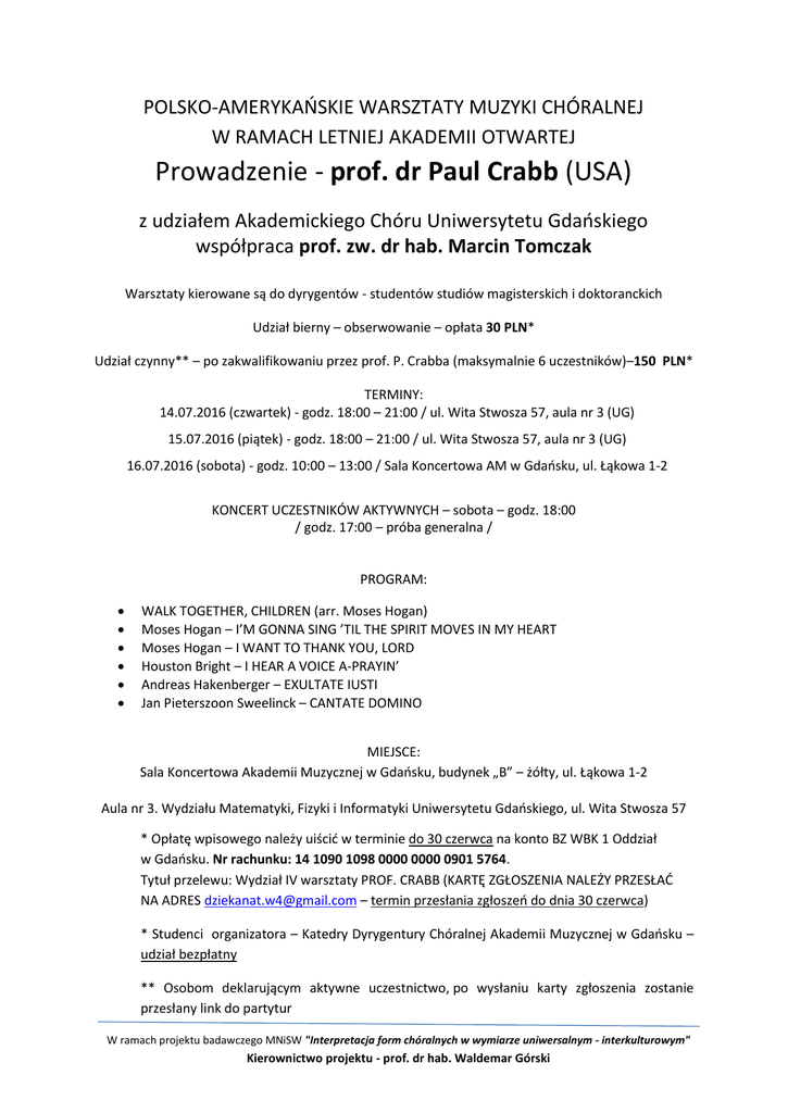 POLSKO-AMERYKAŃSKIE WARSZTATY MUZYKI CHÓRALNEJ W RAMACH LETNIEJ AKADEMII OTWARTEJ Prowadzenie - prof. dr Paul Crabb (USA) z udziałem Akademickiego Chóru Uniwersytetu Gdańskiego współpraca prof. zw. dr hab. Marcin Tomczak Warsztaty kierowane są do dyrygentów - studentów studiów magisterskich i doktoranckich Udział bierny – obserwowanie – opłata 30 PLN* Udział czynny** – po zakwalifikowaniu przez prof. P. Crabba (maksymalnie 6 uczestników)–150 PLN* TERMINY: 14.07.2016 (czwartek) - godz. 18:00 – 21:00 / ul. Wita Stwosza 57, aula nr 3 (UG) 15.07.2016 (piątek) - godz. 18:00 – 21:00 / ul. Wita Stwosza 57, aula nr 3 (UG) 16.07.2016 (sobota) - godz. 10:00 – 13:00 / Sala Koncertowa AM w Gdańsku, ul. Łąkowa 1-2 KONCERT UCZESTNIKÓW AKTYWNYCH – sobota – godz. 18:00 / godz. 17:00 – próba generalna / PROGRAM: WALK TOGETHER, CHILDREN (arr. Moses Hogan) Moses Hogan – I’M GONNA SING ’TIL THE SPIRIT MOVES IN MY HEART Moses Hogan – I WANT TO THANK YOU, LORD Houston Bright – I HEAR A VOICE A-PRAYIN’ Andreas Hakenberger – EXULTATE IUSTI Jan Pieterszoon Sweelinck – CANTATE DOMINO MIEJSCE: Sala Koncertowa Akademii Muzycznej w Gdańsku, budynek „B” – żółty, ul. Łąkowa 1-2 Aula nr 3. Wydziału Matematyki, Fizyki i Informatyki Uniwersytetu Gdańskiego, ul. Wita Stwosza 57 * Opłatę wpisowego należy uiścić w terminie do 30 czerwca na konto BZ WBK 1 Oddział w Gdańsku. Nr rachunku: 14 1090 1098 0000 0000 0901 5764. Tytuł przelewu: Wydział IV warsztaty PROF. CRABB (KARTĘ ZGŁOSZENIA NALEŻY PRZESŁAĆ NA ADRES [email protected] – termin przesłania zgłoszeń do dnia 30 czerwca) * Studenci organizatora – Katedry Dyrygentury Chóralnej Akademii Muzycznej w Gdańsku – udział bezpłatny ** Osobom deklarującym aktywne uczestnictwo, po wysłaniu karty zgłoszenia zostanie przesłany link do partytur W ramach projektu badawczego MNiSW "Interpretacja form chóralnych w wymiarze uniwersalnym - interkulturowym" Kierownictwo projektu - prof. dr hab. Waldemar Górski Prof. Paul Crabb, University of Missouri's Director of Choral Activities, earned degrees in Music Education, Vocal Performance and Choral Music Education. His ensembles have performed at state, regional and national conventions and have traveled extensively in Mexico, Germany, Austria, Italy, Hungary, Slovakia, Czech Republic, Russia, Bulgaria and Australia. Crabb served as assistant conductor at the Russian/American Choral Symposium for two years where his choir was invited as the resident American choir at the Moscow Conservatory. He served for one year as a visiting professor in Salzburg, Austria, where he taught and worked with the choir of the Salzburg Cathedral. He has taught conducting in Taiwan, eighteenth-century music in England, and studied sixteenth century polyphony in Italy with the renowned Peter Phillips. More recently he served as Guest Visiting Choral Professor at the Liszt Academy of Music in Budapest, Hungary - the first American selected for that position. In 2007 he became the first American conductor invited to lecture in the Choral Department at the University of Vienna's Universität für Musik und Darstellende Kunst. In 2008 Crabb accepted the position as Resident Guest Conductor of the Baroque Orchestra of Domenica Cimarosa in Avellino, Italy, where he has conducted performances in the Naples and the Amalfi Coast region for the past several years and recently completed a recording project with the same ensemble. He also accepted a position as the resident conductor for the Dante Music and Arts Festival in Nagoya, Japan during March of 2010. Invitations for 2011-12 included California, New York, Washington, D.C., Italy, Austria and Brazil. In 2015 he was awarded a research leave at MU, using the time to lecture, perform and research choral music in Sweden, including lectures and performances at Lund University, Malmӧ College of Music and the Royal Conservatory in Stockholm. He also presented seminars and workshops in Austria, Italy and Slovakia. Invitations for 2016 include Austria, Italy, China and Poland. Under Crabb's leadership, MU's University Singers have been recognized as one of the premiere university choirs in the United States. In November of 2009, they were invited to perform at the national convention of the National Collegiate Choral Organization at Yale University--one of nine choirs selected by audition from across the U. S. In May of 2010 they accepted an invitation to perform at some of the most prestigious venues in Milan, Bologna, Rome and Salerno, Italy. This tour was sponsored by several institutions in these cities, as well as the office of the U. S. Consulate General in Naples. In January 2011 they performed by invitation at the Missouri Music Educators Association state convention. In March of that same year, they traveled to Chicago following an acceptance of an invitation to perform at the national convention of the American Choral Directors Association during a session on eighteenth-century performance practice. This same ensemble was the featured choir for a residency of Peter Phillips of the Tallis Scholars in April of 2012. In November of 2012, Crabb hosted Dr. Joseph Flummerfelt's residency during which he worked with students and conducted a performance of Choral Union's Lord Nelson Mass. In January of 2013, they returned to Missouri Music Educators Association conference as one of three collegiate choirs featured for the special 75th Anniversary convention. In May 2014 they were invited to perform in Austria and Hungary, including the Liszt Academy of Music in Budapest and performing with the Salzburg Cathedral choir. Crabb has also been recognized for his teaching skills. He was the recipient of the Walker and Doris Allen Teaching Award (Truman State University), was Missouri’s Professor of the Year, and in April of 2012 received the William T. Kemper Award for Teaching Excellence from MU. His published research has ap