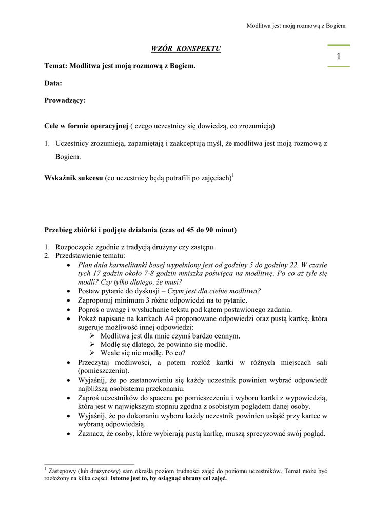 WZÓR KONSPEKTU Temat: Modlitwa jest moją rozmową z Bogiem