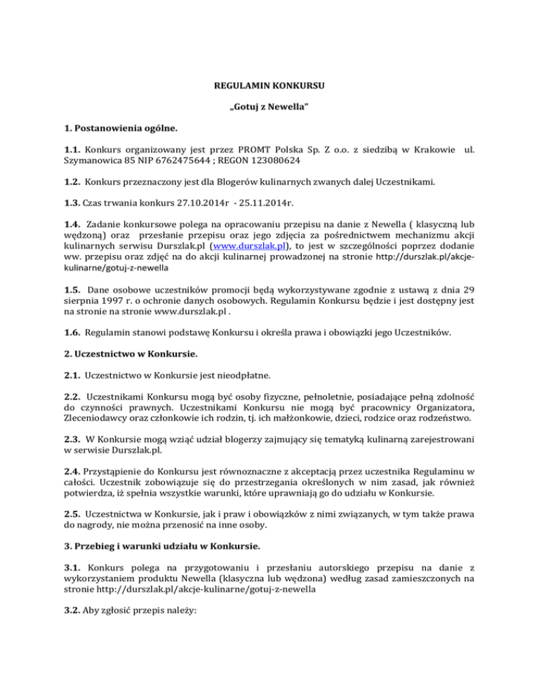 REGULAMIN KONKURSU „Gotuj z Newella” 1. Postanowienia ogólne. 1.1. Konkurs organizowany jest przez PROMT Polska Sp. Z o.o. z siedzibą w Krakowie ul. Szymanowica 85 NIP 6762475644 ; REGON 123080624 1.2. Konkurs przeznaczony jest dla Blogerów kulinarnych zwanych dalej Uczestnikami. 1.3. Czas trwania konkurs 27.10.2014r - 25.11.2014r. 1.4. Zadanie konkursowe polega na opracowaniu przepisu na danie z Newella ( klasyczną lub wędzoną) oraz przesłanie przepisu oraz jego zdjęcia za pośrednictwem mechanizmu akcji kulinarnych serwisu Durszlak.pl (www.durszlak.pl), to jest w szczególności poprzez dodanie ww. przepisu oraz zdjęć na do akcji kulinarnej prowadzonej na stronie http://durszlak.pl/akcjekulinarne/gotuj-z-newella 1.5. Dane osobowe uczestników promocji będą wykorzystywane zgodnie z ustawą z dnia 29 sierpnia 1997 r. o ochronie danych osobowych. Regulamin Konkursu będzie i jest dostępny jest na stronie na stronie www.durszlak.pl . 1.6. Regulamin stanowi podstawę Konkursu i określa prawa i obowiązki jego Uczestników. 2. Uczestnictwo w Konkursie. 2.1. Uczestnictwo w Konkursie jest nieodpłatne. 2.2. Uczestnikami Konkursu mogą być osoby fizyczne, pełnoletnie, posiadające pełną zdolność do czynności prawnych. Uczestnikami Konkursu nie mogą być pracownicy Organizatora, Zleceniodawcy oraz członkowie ich rodzin, tj. ich małżonkowie, dzieci, rodzice oraz rodzeństwo. 2.3. W Konkursie mogą wziąć udział blogerzy zajmujący się tematyką kulinarną zarejestrowani w serwisie Durszlak.pl. 2.4. Przystąpienie do Konkursu jest równoznaczne z akceptacją przez uczestnika Regulaminu w całości. Uczestnik zobowiązuje się do przestrzegania określonych w nim zasad, jak również potwierdza, iż spełnia wszystkie warunki, które uprawniają go do udziału w Konkursie. 2.5. Uczestnictwa w Konkursie, jak i praw i obowiązków z nimi związanych, w tym także prawa do nagrody, nie można przenosić na inne osoby. 3. Przebieg i warunki udziału w Konkursie. 3.1. Konkurs polega na przygotowaniu i przesłaniu autorskiego przepisu na danie z wykorzystaniem produktu Newella (klasyczna lub wędzona) według zasad zamieszczonych na stronie http://durszlak.pl/akcje-kulinarne/gotuj-z-newella 3.2. Aby zgłosić przepis należy: 3.2.1. przygotować przepis na danie z wykorzystaniem produktu Newella ( klasyczna lub wędzona) ze wskazaniem, jaki rodzaj Newelli ( klasyczna lub wędzona) został użyty do przygotowania dania. 3.2.2. zrobić zdjęcie dania i opakowania produktu Newella, który został użyty do przygotowania dania oraz przepisu 3.2.3. opublikować przepis wraz ze zdjęciem w formie wpisu na prowadzonym przez Uczestnika blogu 3.2.4. zgłosić wpisu z daniem konkursowym oraz wraz ze stosownym zdjęciem do Konkursu za pośrednictwem strony http://durszlak.pl/akcje-kulinarne/gotuj-z-newellajeden Uczestnik może zgłosić maksymalnie 3 przepisy. 3.2.5 W przepisie oraz zdjęciach zgłoszonych do konkursu nie mogą być lokowane produkty innych marek 3.3. Poprzez zgłoszenie przepisu do Konkursu w sposób wyżej określony, Uczestnik Konkursu oświadcza, że treść i forma każdej z zamieszczonych wypowiedzi konkursowych nie narusza przepisów prawa, ani prawem chronionych dóbr osób trzecich, a uczestnik Konkursu jest w pełni uprawniony do zgłoszenia każdej z wypowiedzi konkursowych. 3.4. Z tytułu złożonego powyżej oświadczenia Uczestnik przyjmuje na siebie pełną odpowiedzialność prawną. W przypadku jakichkolwiek roszczeń ze strony osób trzecich Uczestnik, po zawiadomieniu go przez Organizatora, nie uchyli się od niezwłocznego przystąpienia do wyjaśnienie wyjaśnienia sprawy oraz wystąpi przeciwko takim roszczeniom na własny koszt i ryzyko, a nadto zaspokoi wszelkie uzasadnione roszczenia, a w razie ich zasądzenia od Organizatora, regresowo zwróci całość pokrytych roszczeń oraz wszelkie związane z tym wydatki i opłaty, włączając w to koszty procesu i obsługi prawnej, a także naprawi wszelkie inne szkody wynikające z wyżej opisanych roszczeń osób trzecich. 3.5. Uczestnicy konkursu wyrażają zgodę na korzystanie z autorskich praw majątkowych do zgłoszonego przepisu przez Organizatora konkursu i Zleceniodawcę a także wszelkich Utworów będących składnikami Zgłoszenia (w szczególności takich jak zdjęcia), w sytuacji gdy ich przepisy zostaną nagrodzone, bez ograniczeń terytorialnych i czasowych na następujących polach eksploatacji: 3.5.1. wprowadzanie do pamięci komputera, publiczne wykonanie albo publiczne odtwarzanie, publikacja w Internecie na następujących stronach: www.facebook.pl fanpage Newelli (https://www.facebook.com/pages/Newella/738047106236358?fref=ts)) oraz na stronie: www.newella.pl a także na stronie www.durszlak.pl 3.6. Powyższa zgoda określona w pkt. 3.5. jest równoznaczna z przekazaniem praw autorskich w zakresie jak wyżej przez Uczestnika, w zamian za otrzymaną nagrodę w konkursie. Dodatkowo, Uczestnicy wyrażają zgodę na użycie ich wizerunków w zakresie wskazanym powyżej w wypadku przyznania im nagrody głównej określonej w pkt. 4.3.1. 4. Zasady wyłaniania zwycięzców w konkursie, skład Jury oraz Nagrody 4.1. Finalistów Konkursu wybiera jury konkursowe. 4.2. Ocenie w konkursie podlegać będą: fantazyjność oraz oryginalność przepisu. 4.3. Zwycięzca będzie wyłoniony na podstawie niezależnej, kolegialnej decyzji Jury, wydanej nie później niż 10 dni po dacie zakończenia konkursu. Decyzja zostanie ogłoszona w ww. przewidzianym terminie za pośrednictwem strony www.facebook.com/Durszlak.pl Nagrody będą następujące: 4.3.1. I miejsce - Karta przedpłacona VISA na kwotę 2000 zł. Do realizacji w każdym sklepie. Oraz komplet noży Toiro o wartości 643 zł 4.2.2. II miejsce– Piec do Pizzy Optima Electra o wartości 549 zł oraz Bread Maker naczynie żaroodporne o wartości 125,80 zł 4.2.3. III miejsce – Honk Kong Wok o wartości 480,25 zł oraz wędzarnia z term
