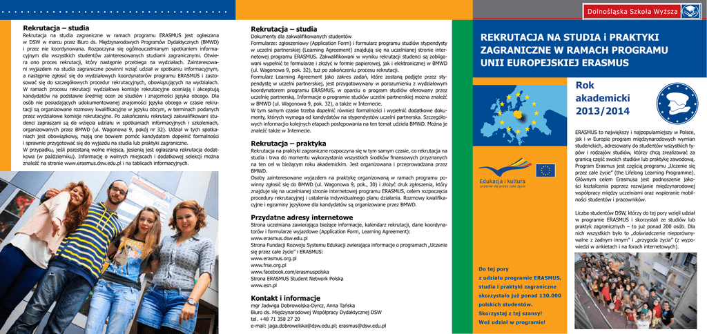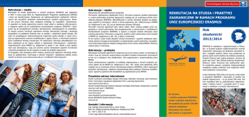 Rekrutacja na studia zagraniczne w ramach programu ERASMUS jest ogłaszana w DSW w marcu przez Biuro ds. Międzynarodowych Programów Dydaktycznych (BMWD) i przez nie koordynowana. Rozpoczyna się ogólnouczelnianym spotkaniem informacyjnym dla wszystkich studentów zainteresowanych studiami zagranicznymi. Otwiera ono proces rekrutacji, który następnie przebiega na wydziałach. Zainteresowani wyjazdem na studia zagraniczne powinni wziąć udział w spotkaniu informacyjnym, a następnie zgłosić się do wydziałowych koordynatorów programu ERASMUS i zastosować się do szczegółowych procedur rekrutacyjnych, obowiązujących na wydziałach. W ramach procesu rekrutacji wydziałowe komisje rekrutacyjne oceniają i akceptują kandydatów na podstawie średniej ocen ze studiów i znajomości języka obcego. Dla osób nie posiadających udokumentowanej znajomości języka obcego w czasie rekrutacji są organizowane rozmowy kwalifikacyjne w języku obcym, w terminach podanych przez wydziałowe komisje rekrutacyjne. Po zakończeniu rekrutacji zakwalifikowani studenci zapraszani są do wzięcia udziału w spotkaniach informacyjnych i szkoleniach, organizowanych przez BMWD (ul. Wagonowa 9, pokój nr 32). Udział w tych spotkaniach jest obowiązkowy, mają one bowiem pomóc kandydatom dopełnić formalności i sprawnie przygotować się do wyjazdu na studia lub praktyki zagraniczne. W przypadku, jeśli pozostaną wolne miejsca, jesienią jest ogłaszana rekrutacja dodatkowa (w październiku). Informację o wolnych miejscach i dodatkowej selekcji można znaleźć na stronie www.erasmus.dsw.edu.pl i na tablicach informacyjnych. www.dsw.edu.pl Rekrutacja – studia REKRUTACJA NA STUDIA i PRAKTYKI ZAGRANICZNE W RAMACH PROGRAMU UNII EUROPEJSKIEJ ERASMUS Dokumenty dla zakwalifikowanych studentów Formularze: zgłoszeniowy (Application Form) i formularz programu studiów stypendysty w uczelni partnerskiej (Learning Agreement) znajdują się na uczelnianej stronie internetowej programu ERASMUS. Zakwalifikowani w wyniku rekrutacji studenci są zobligowani wypełnić te formularze i złożyć w formie papierowej, jak i elektronicznej w BMWD (ul. Wagonowa 9, pok. 32), tuż po zakończeniu procesu rekrutacji. Formularz Learning Agreement jako zakres zadań, które zostaną podjęte przez stypendystę w uczelni partnerskiej, jest przygotowywany w porozumieniu z wydziałowym koordynatorem programu ERASMUS, w oparciu o program studiów oferowany przez uczelnię partnerską. Informacje o programie studiów uczelni partnerskiej można znaleźć w BMWD (ul. Wagonowa 9, pok. 32), a także w Internecie. W tym samym czasie trzeba dopełnić również formalności i wypełnić dodatkowe dokumenty, których wymaga od kandydatów na stypendystów uczelni partnerska. Szczegółowych informacjio kolejnych etapach postępowania na ten temat udziela BMWD. Można je znaleźć także w Internecie. Rok akademicki 2013/2014 Rekrutacja – praktyka Rekrutacja na praktyki zagraniczne rozpoczyna się w tym samym czasie, co rekrutacja na studia i trwa do momentu wykorzystania wszystkich środków finansowych przyznanych na ten cel w bieżącym roku akademickim. Jest organizowana i przeprowadzana przez BMWD. Osoby zainteresowane wyjazdem na praktykę organizowaną w ramach programu powinny zgłosić się do BMWD (ul. Wagonowa 9, pok., 30) i złożyć druk zgłoszenia, który znajduje się na uczelnianej stronie internetowej programu ERASMUS, celem rozpoczęcia procedury rekrutacyjnej i ustalenia indywidualnego planu działania. Rozmowy kwalifikacyjne i egzaminy językowe dla kandydatów są organizowane przez BMWD. uczenie się przez całe życie Strona uczelniana zawierająca bieżące informacje, kalendarz rekrutacji, dane koordynatorów i formularze wyjazdowe (Application Form, Learning Agreement): www.erasmus.dsw.edu.pl Strona Fundacji Rozwoju Systemu Edukacji zwierająca informacje o programach „Uczenie się przez całe życie” i ERASMUS: www.erasmus.org.pl www.frse.org.pl www.facebook.com/erasmuspolska Strona ERASMUS Student Network Polska www.esn.pl Kontakt i informacje mgr Jadwiga Dobrowolska-Dyrcz, Anna Tańska Biuro ds. Międzynarodowej Współpracy Dydaktycznej DSW tel. +48 71 358 27 20 e-mail: [email protected]; [email protected] ERASMUS to największy i najpopularniejszy w Polsce, jak i w Europie program międzynarodowych wymian studenckich, adresowany do studentów wszystkich typów i rodzajów studiów, którzy chcą zrealizować za granicą część swoich studiów lub praktykę zawodową. Program Erasmus jest częścią programu „Uczenie się przez całe życie” (the Lifelong Learning Programme). Głównym celem Erasmusa jest podnoszenie jakości kształcenia poprzez rozwijanie międzynarodowej współpracy między uczelniami oraz wspieranie mobilności studentów i pracowników. Liczba studentów DSW, którzy do tej pory wzięli udział w programie ERASMUS i skorzystali ze studiów lub praktyk zagranicznych – to już ponad 200 osób. Dla nich wszystkich było to „doświadczenie nieporównywalne z żadnym innym” i „przygoda życia” (z wypowiedzi w ankietach i na forach internetowych). Przydatne adresy internetowe Do tej pory z udziału programie ERASMUS, studia i praktyki zagraniczne BP UE/AM/11/03/2013 Rekrutacja – studia skorzystało już ponad 130.000 polskich studentów. Skorzystaj z tej szansy! Weź udział w programie! AUSTRIA AUSTRIA stosunki międzynarodowe praca socjalna pedagogika media cyfrowe kulturoznawstwo nazwa uczelni partnerskiej dziennikarstwo kraj administracja Legenda: 2 – liczba przewidzianych miejsc dla studentów DSW bezpieczeństwo narodowe 2 FH OÖ STUDIENBETRIEBS GMBH PÄDAGOGISCHE HOCHSCHULE STEIERMARK HISZPANIA UNIVERSIDAD CATOLICA DE VALENCIA 2 HISZPANIA UNIVERSIDAD SAN JORGE 2 2 LITWA LIETUVOS EDUKOLOGIJOS UNIVERSITETAS 4 UNIVERSITÄT BERLIN 2 2 2 2 FACHHOCHSCHULE DÜSSELDORF 1 UNIVERSITÄT FLENSBURG 2 2 1 CZECHY UNIVERZITA HRADEC KRÁLOVÉ 1 2 2 2 1 1 1 EUROPA 