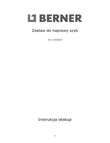 Zestaw do naprawy szyb Art. nr 010215 Instrukcja obsługi 1 Z pomocą niniejszego zestawu możecie Pstwo szybko i tanio naprawiać uszkodzenia szyb samochodowych spowodowane uderzeniem kamieni. • Demontaż szyby przed podjęciem naprawy nie jest konieczny. • Naprawa zatrzymuje, bądź znacząco ogranicza proces powstawania rys na szybie (w zależności od stopnia uszkodzenia). • Prosta i jasna instrukcja postępowania zapewnia szybką i bezproblemową naprawę. Zastosowanie: Do naprawy szyb samochodowych ze szkła bezpiecznego (przezroczystego lub przyciemnianego) w samochodach osobowych i pojazdach użytkowych. Skład zestawu: 010210 010226 010205 010218 010224 103652 010229 010220 122295 010207 010209 115595 Uchwyt Lusterko na przegubie Folia utwardzalna 45m Żel montażowy 30ml Politura 30ml Ostrze 5 szt. Uchwyt ostrza Lampa UV 12V Sztyft polerski Żywica naprawcza 2 szt. Żywica wykończ. 1 szt. Zapalniczka Wyposażenie dodatkowe: 010200 Zestaw wierteł 010204 Zestaw wierteł do szkła 1. Wstęp Aby osiągnąć zamierzony efekt należy zapoznać się z niniejszą instrukcją i wielokrotnie przećwiczyć poszczególne etapy procesu. 2. Przygotowanie do naprawy 2.1. Czyszczenie Powierzchnię wokół uszkodzonego miejsca należy wytrzeć suchą szmatką. Nie należy przecierać miejsca uszkodzenia. Luźne kawałki szkła należy usunąć za pomocą szpikulca, ostrożnie bez zwiększania uszkodzonej powierzchni. Uwaga: im większa wyrwa w powierzchni szyby, tym trudniej uzyskać optymalny wygląd naprawianej powierzchni. 2 2.2. Montaż lusterka kontrolnego (na przegubie) Lusterko mocowane od wewnętrznej strony pojazdu pozwala na kontrolę przebiegu prac. 2.3. Mocowanie narzędzi Na wewnętrznej powierzchni przyssawki uchwytu rozprowadzić żel montażowy. Żel pozwala na dokonanie korekty położenia uchwytu na szybie. Następnie przymocować uchwyt za pomocą przyssawki, tak aby otwór injektora znajdował się dokładnie nad uszkodzonym miejscem. 2.4. Napełnianie injektora Otworzyć opakowanie i wyjąc injektor oraz tubę z żywicą. Zwrócić uwagę na datę napełnienia tuby. Wykręcić tłok na 4-5 mm z iniektora i napełnić komorę całkowicie żywicą. Uwaga: Po napełnieniu tubę z żywicą należy bezzwłocznie schować do pudełka, aby uchronić ją przed promieniowaniem UV. Injektor wkręcić w uchwyt montażowy i wyregulować tak, aby był dokładnie pionowo w stosunku do naprawianej powierzchni. 3. Naprawa Nie prowadzić naprawy promieniowaniem UV. 3.1. w pełnym słońcu. Chronić żywicę przed Wypełnianie Pokręcać tłokiem injektora (podczas pokręcania trzymać cylinder w palcach) tak długo, aż otwór w uszczelnieniu zwiększy się do ok. 1 mm. Ciśnienie w komorze roboczej spowoduje wciśnięcie żywicy w uszkodzone miejsce szyby. W lusterku 3 kontrolnym należy przejrzystość). 3.2. sprawdzić wypełnienie uszkodzenia (wypełnienie szczelin i Odsysanie Odkręcić tłok (podczas odkręcania trzymać cylinder w palcach) o ok. 10 mm tak aby gwint stał się widoczny. Pozostawić w tej pozycji na 5 minut. W komorze roboczej powstanie podciśnienie, które spowoduje odessanie pęcherzy powietrza z naprawianego obszaru. W lusterku kontrolnym będą widoczne czarne punkciki (powietrze) przesuwające się w kierunku injektora. Faza wypełniania i odsysanie powinny być powtarzane tak długo, dopóki z naprawianego obszaru powietrze nie zostanie odessane całkowicie. 3.3. Podgrzewanie Lekkie podgrzanie uszkodzonego miejsca przyspiesza wypełnianie ubytków oraz usuwanie pęcherzy powietrza. Dlatego podczas odsysania powietrza dobrze jest podgrzewać naprawiane miejsce zapalniczką (3-5 s.). Podgrzewanie podczas wypełniania spowoduje wzrost ciśnienia powietrza wewnątrz uszkodzenia i brak możliwości jego późniejszego usunięcia. 4. Utwardzanie W momencie gdy uszkodzone miejsce jest już w pełni wypełnione żywicą, a powietrze jest całkowicie usunięte należy przystąpić do utwardzania żywicy. Należy usunąć uchwyt narzędziowy. 4.1. Folia Pasek folii o długości 4-5 cm należy swobodnie (bez nacisku) połozyć na naprawianym miejscu. 4.2. Żywica wykończeniowa Pasek folii podnieść możliwie blisko miejsca uszkodzenia. Na naprawiane miejsce położyć kroplę żywicy wykończeniowej i ponownie położyć folię. 4.3. Utwardzanie lampą UV Zamocować lampę na przyssawkach i naświetlać uszkodzone miejsce prze 5-6 minut. 5. Obróbka końcowa 5.1. Wykończenie wypełnienia Zerwać folię z naprawianego miejsca i ostrzem usunąć nadmiar żywicy. W przypadku gdy okaże się, że naprawiane miejsce nie jest wypełnione całkowicie należy powtórzyć czynności opisane w punkcie 4. 5.2. Polerowanie Na zakończenie naprawiane miejsce należy wypolerować czystą szmatką z dodatkiem pasty polerskiej (ręcznie lub polerką). Uwaga: Długie polerowanie może spowodować, iż naprawiana powierzchnia nie będzie płaska. 4 Po zakończeniu naprawy wszystkie elementy zestawu przetrzeć czystą szmatką. Resztki żywicy należy usunąć z injektora poprzez maksymalne dokręcenie tłoka. Berner Polska Sp. z o.o. nie odpowiada za szkody spowodowane niestosowaniem się do niniejszej instrukcji lub stosowaniem żywic nie wchodzących w skład kompletu. Rozwiercanie Uszkodzenia z ze szczelinami (max. 5 cm) łatwiej i szybciej jest wypełniać po uprzednim rozwierceniu. Rozwiercanie Nawiercić otwór o głębokości 1 mm w centralnym punkcie uszkodzenia. Uwaga: Podczas wiercenia trzymać wiertarkę obiema rękami w celu utrzymania optymalnej pozycji wiertła. Podczas wiercenia robić przerwy w celu uniknięcia przegrzania wiertła. Wskazówki Naprawa dopuszczalna jest tylko pod następującymi warunkami: 1. Tylko uszkodzenia zewnętrznej powierzchni szyby mogą podlegać naprawie. 2. Naprawa powinna zostać wykonana możliwie szybko z uwagi na penetrację wilgoci i zanieczyszczeń. 3. Wielkość (średnica) uszkodzenia nie powinna przekraczać 5 mm. 4. Szczeliny 