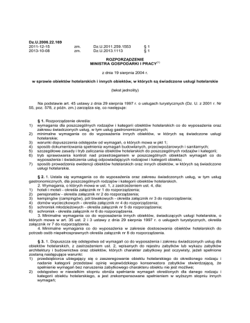 Dz.U.2006.22.169 2011-12-15 2013-10-08 zm. zm. Dz.U.2011.259.1553 Dz.U.2013.1113 §1 §1 ROZPORZĄDZENIE MINISTRA GOSPODARKI I PRACY(1) z dnia 19 sierpnia 2004 r. w sprawie obiektów hotelarskich i innych obiektów, w których są świadczone usługi hotelarskie (tekst jednolity) Na podstawie art. 45 ustawy z dnia 29 sierpnia 1997 r. o usługach turystycznych (Dz. U. z 2001 r. Nr 55, poz. 578, z późn. zm.) zarządza się, co następuje: 1) 2) 3) 4) 5) 6) 7) § 1. Rozporządzenie określa: wymagania dla poszczególnych rodzajów i kategorii obiektów hotelarskich co do wyposażenia oraz zakresu świadczonych usług, w tym usług gastronomicznych; minimalne wymagania co do wyposażenia innych obiektów, w których są świadczone usługi hotelarskie; warunki dopuszczenia odstępstw od wymagań, o których mowa w pkt 1; sposób dokumentowania spełnienia wymagań budowlanych, przeciwpożarowych i sanitarnych; szczegółowe zasady i tryb zaliczania obiektów hotelarskich do poszczególnych rodzajów i kategorii; tryb sprawowania kontroli nad przestrzeganiem w poszczególnych obiektach wymagań co do wyposażenia i świadczenia usług odpowiadających rodzajowi i kategorii obiektu; sposób prowadzenia ewidencji obiektów hotelarskich oraz innych obiektów, w których są świadczone usługi hotelarskie. § 2. 1. Ustala się wymagania co do wyposażenia oraz zakresu świadczonych usług, w tym usług gastronomicznych, dla poszczególnych rodzajów i kategorii obiektów hotelarskich. 2. Wymagania, o których mowa w ust. 1, z zastrzeżeniem ust. 4, dla: 1) hoteli i moteli - określa załącznik nr 1 do rozporządzenia; 2) pensjonatów - określa załącznik nr 2 do rozporządzenia; 3) kempingów (campingów), pól biwakowych - określa załącznik nr 3 do rozporządzenia; 4) domów wycieczkowych - określa załącznik nr 4 do rozporządzenia; 5) schronisk młodzieżowych - określa załącznik nr 5 do rozporządzenia; 6) schronisk - określa załącznik nr 6 do rozporządzenia. 3. Minimalne wymagania co do wyposażenia innych obiektów, świadczących usługi hotelarskie, o których mowa w art. 35 ust. 2 i 3 ustawy z dnia 29 sierpnia 1997 r. o usługach turystycznych, określa załącznik nr 7 do rozporządzenia. 4. Minimalne wymagania co do wyposażenia w zakresie dostosowania obiektów hotelarskich do potrzeb osób niepełnosprawnych określa załącznik nr 8 do rozporządzenia. § 3. 1. Dopuszcza się odstępstwa od wymagań co do wyposażenia i zakresu świadczonych usług dla obiektów hotelarskich, z zastrzeżeniem ust. 2, wpisanych do rejestru zabytków lub wykazu zabytków architektury i budownictwa oraz obiektów, których charakter zabytkowy jest oczywisty, jeżeli spełnione zostaną następujące warunki: 1) przedsiębiorca ubiegający się o zaszeregowanie obiektu hotelarskiego do określonego rodzaju i nadanie kategorii przedstawi opinię wojewódzkiego konserwatora zabytków stwierdzającą, że spełnienie wymagań bez naruszenia zabytkowego charakteru obiektu nie jest możliwe; 2) odstępstwo w niewielkim stopniu obniża spełnianie wymagań określonych dla danego rodzaju i kategorii obiektu hotelarskiego, a jest zrekompensowane spełnieniem w wyższym stopniu innych wymagań; 3) w materiałach informacyjnych dotyczących obiektu hotelarskiego zostanie zamieszczona informacja o zabytkowym charakterze obiektu i związanych z tym odstępstwach od wymagań co do wyposażenia i zakresu świadczonych usług. 2. Dopuszcza się odstępstwa od wymagań co do wyposażenia i zakresu świadczonych usług dla pól biwakowych zlokalizowanych na terenie gospodarstw rolnych, pod warunkiem zapewnienia możliwości korzystania z wody do picia i urządzeń sanitarnych. (2) § 4. 1. Spełnianie w obiektach hotelarskich wymagań określonych w art. 35 ust. 1 pkt 2 ustawy z dnia 29 sierpnia 1997 r. o usługach turystycznych dokumentuje się w zakresie wymagań: 1) budowlanych: a) przez wszystkie obiekty - książką obiektu budowlanego, o której mowa w art. 64 ustawy z dnia 7 lipca 1994 r. - Prawo budowlane (Dz. U. z 2010 r. Nr 243, poz. 1623, z późn. zm.), przedstawioną do wglądu organowi dokonującemu kontroli lub oceny obiektu budowlanego, w przypadku obiektów budowlanych, w stosunku do których obowiązek posiadania książki obiektu budowlanego istnieje na podstawie tej ustawy, oraz b) przez obiekty hotelarskie należące odpowiednio do XIV, XVII lub IX kategorii obiektów budowlanych, o ile obiekt budowlany składa się z kilku części, z których każda zostaje zakwalifikowana do określonej kategorii obiektów budowlanych, zgodnie z załącznikiem do ustawy z dnia 7 lipca 1994 r. - Prawo budowlane - ostateczną decyzją o pozwoleniu na budowę wraz z zaświadczeniem właściwego organu administracji architektoniczno-budowlanej o dokonanym zgłoszeniu zmiany sposobu użytkowania obiektu budowlanego lub jego części, w stosunku do którego właściwy organ nie wniósł sprzeciwu, lub ostateczną decyzją o pozwoleniu na użytkowanie obiektu budowlanego, a w przypadku obiektów budowlanych wzniesionych przed dniem 1 kwietnia 1995 r., które utraciły wymienione dokumenty - opinią rzeczoznawcy budowlanego stwierdzającą bezpieczeństwo użytkowania obiektu budowlanego; 2) przeciwpożarowych - opinią właściwego miejscowo komendanta powiatowego (miejskiego) Państwowej Straży Pożarnej; 3) sanitarnych - opinią właściwego miejscowo państwowego powiatowego inspektora sanitarnego, a w obiektach hotelarskich, które znajdują się na terenie jednostki organizacyjnej podległej ministrowi właściwemu do spraw wewnętrznych lub przez niego nadzorowanej lub na terenie administrowanym przez organ podległy ministrowi właściwemu do spraw wewnętrznych lub przez niego nadzorowany opinią właściwego miejscowo państwowego inspektora sanitarnego Ministerstwa Spraw Wewnętrznych i Administracji. 2. Spełnianie w innych obiektach, w których są świadczone usługi hotelarskie, wymaga