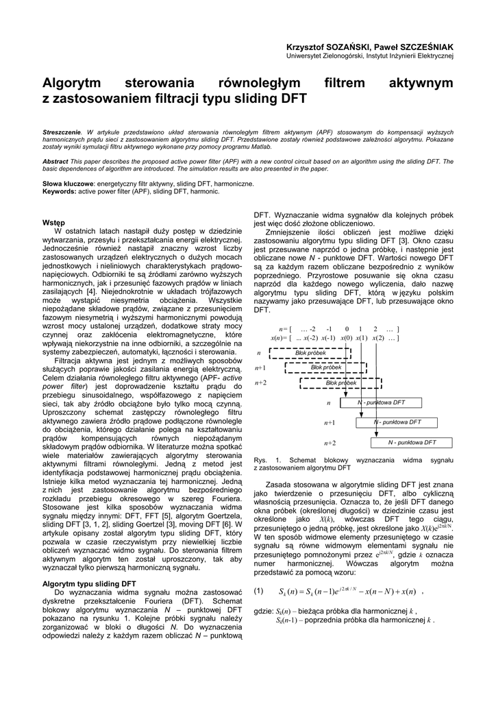 Krzysztof SOZAŃSKI, Paweł SZCZEŚNIAK Uniwersytet Zielonogórski, Instytut Inżynierii Elektrycznej Algorytm sterowania równoległym z zastosowaniem filtracji typu sliding DFT filtrem aktywnym Streszczenie. W artykule przedstawiono układ sterowania równoległym filtrem aktywnym (APF) stosowanym do kompensacji wyższych harmonicznych prądu sieci z zastosowaniem algorytmu sliding DFT. Przedstawione zostały również podstawowe zależności algorytmu. Pokazane zostały wyniki symulacji filtru aktywnego wykonane przy pomocy programu Matlab. Abstract This paper describes the proposed active power filter (APF) with a new control circuit based on an algorithm using the sliding DFT. The basic dependences of algorithm are introduced. The simulation results are also presented in the paper. Słowa kluczowe: energetyczny filtr aktywny, sliding DFT, harmoniczne. Keywords: active power filter (APF), sliding DFT, harmonic. Wstęp W ostatnich latach nastąpił duży postęp w dziedzinie wytwarzania, przesyłu i przekształcania energii elektrycznej. Jednocześnie również nastąpił znaczny wzrost liczby zastosowanych urządzeń elektrycznych o dużych mocach jednostkowych i nieliniowych charakterystykach prądowonapięciowych. Odbiorniki te są źródłami zarówno wyższych harmonicznych, jak i przesunięć fazowych prądów w liniach zasilających [4]. Niejednokrotnie w układach trójfazowych może wystąpić niesymetria obciążenia. Wszystkie niepożądane składowe prądów, związane z przesunięciem fazowym niesymetrią i wyższymi harmonicznymi powodują wzrost mocy ustalonej urządzeń, dodatkowe straty mocy czynnej oraz zakłócenia elektromagnetyczne, które wpływają niekorzystnie na inne odbiorniki, a szczególnie na systemy zabezpieczeń, automatyki, łączności i sterowania. Filtracja aktywna jest jednym z możliwych sposobów służących poprawie jakości zasilania energią elektryczną. Celem działania równoległego filtru aktywnego (APF- active power filter) jest doprowadzenie kształtu prądu do przebiegu sinusoidalnego, współfazowego z napięciem sieci, tak aby źródło obciążone było tylko mocą czynną. Uproszczony schemat zastępczy równoległego filtru aktywnego zawiera źródło prądowe podłączone równolegle do obciążenia, którego działanie polega na kształtowaniu prądów kompensujących równych niepożądanym składowym prądów odbiornika. W literaturze można spotkać wiele materiałów zawierających algorytmy sterowania aktywnymi filtrami równoległymi. Jedną z metod jest identyfikacja podstawowej harmonicznej prądu obciążenia. Istnieje kilka metod wyznaczania tej harmonicznej. Jedną z nich jest zastosowanie algorytmu bezpośredniego rozkładu przebiegu okresowego w szereg Fouriera. Stosowane jest kilka sposobów wyznaczania widma sygnału między innymi: DFT, FFT [5], algorytm Goertzela, sliding DFT [3, 1, 2], sliding Goertzel [3], moving DFT [6]. W artykule opisany został algorytm typu sliding DFT, który pozwala w czasie rzeczywistym przy niewielkiej liczbie obliczeń wyznaczać widmo sygnału. Do sterowania filtrem aktywnym algorytm ten został uproszczony, tak aby wyznaczał tylko pierwszą harmoniczną sygnału. Algorytm typu sliding DFT Do wyznaczania widma sygnału można zastosować dyskretne przekształcenie Fouriera (DFT). Schemat blokowy algorytmu wyznaczania N – punktowej DFT pokazano na rysunku 1. Kolejne próbki sygnału należy zorganizować w bloki o długości N. Do wyznaczenia odpowiedzi należy z każdym razem obliczać N – punktową DFT. Wyznaczanie widma sygnałów dla kolejnych próbek jest więc dość złożone obliczeniowo. Zmniejszenie ilości obliczeń jest możliwe dzięki zastosowaniu algorytmu typu sliding DFT [3]. Okno czasu jest przesuwane naprzód o jedna próbkę, i następnie jest obliczane nowe N - punktowe DFT. Wartości nowego DFT są za każdym razem obliczane bezpośrednio z wyników poprzedniego. Przyrostowe posuwanie się okna czasu naprzód dla każdego nowego wyliczenia, dało nazwę algorytmu typu sliding DFT, którą w języku polskim nazywamy jako przesuwające DFT, lub przesuwające okno DFT. n= [ … -2 -1 0 1 2 … ] x(n)= [ ... x(-2) x(-1) x(0) x(1) x(2) … ] n n+1 n+2 Blok próbek Blok próbek Blok próbek n n+1 n+2 N - punktowa DFT N - punktowa DFT N - punktowa DFT Rys. 1. Schemat blokowy wyznaczania z zastosowaniem algorytmu DFT widma sygnału Zasada stosowana w algorytmie sliding DFT jest znana jako twierdzenie o przesunięciu DFT, albo cykliczną własnością przesunięcia. Oznacza to, że jeśli DFT danego okna próbek (określonej długości) w dziedzinie czasu jest określone jako X(k), wówczas DFT tego ciągu, przesuniętego o jedną próbkę, jest określone jako X(k)ej2πk/N. W ten sposób widmowe elementy przesuniętego w czasie sygnału są równe widmowym elementami sygnału nie przesuniętego pomnożonymi przez ej2πk/N, gdzie k oznacza numer harmonicznej. Wówczas algorytm można przedstawić za pomocą wzoru: (1) S k (n) = S k (n − 1)e j 2πk / N − x(n − N ) + x(n) , gdzie: Sk(n) – bieżąca próbka dla harmonicznej k , Sk(n-1) – poprzednia próbka dla harmonicznej k . Wartość Sk(n) obliczamy odejmując od poprzedniej wartości Sk(n-1) pomnożonego przez ej2πk/N wartość próbki x(n-N) sygnału wejściowego i dodając aktualną wartość próbki x(n) tego sygnału. Zatem algorytm typu sliding DFT wymaga dla każdej harmonicznej dwóch mnożeń liczb zespolonych i dwóch dodawań składników rzeczywistych, aby otrzymać próbkę wyjściową. Schemat blokowy układu realizującego równanie 1 pokazano na rysunku 2. Transmitancję dla k - tego elementu widma można więc przedstawić jako: (2) H SDFT ( z ) = Bank Filtrów Analizy S0(z) + z-1 Filtr typu Comb ej2π0/N=1 S1(z) X(z) 1 − z −N 1 − e j 2πk / N z −1 + + z-1 z-N Filtr z rysunku 2 ma N zer równomiernie rozmieszczonych dookoła okręgu jednostkowego na płaszczyźnie zespolonej Z, o