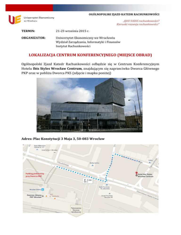 OGÓLNOPOLSKI ZJAZD KATEDR RACHUNKOWOŚCI „QUO VADIS rachunkowości? Kierunki rozwoju rachunkowości” TERMIN: 21-23 września 2015 r. ORGANIZATOR: Uniwersytet Ekonomiczny we Wrocławiu Wydział Zarządzania, Informatyki i Finansów Instytut Rachunkowości LOKALIZACJA CENTRUM KONFERENCYJNEGO (MIEJSCE OBRAD) Ogólnopolski Zjazd Katedr Rachunkowości odbędzie się w Centrum Konferencyjnym Hotelu Ibis Styles Wrocław Centrum, znajdującym się naprzeciwko Dworca Głównego PKP oraz w pobliżu Dworca PKS (zdjęcie i mapka poniżej) Adres: Plac Konstytucji 3 Maja 3, 50-083 Wrocław Tymczasowy Dworzec Autobusowy OGÓLNOPOLSKI ZJAZD KATEDR RACHUNKOWOŚCI „QUO VADIS rachunkowości? Kierunki rozwoju rachunkowości” DOJAZD DO CENTRUM KONFERENCYJNEGO 1. Informacja dla uczestników Zjazdu, którzy pragną przybyć komunikacją zbiorową: z Portu Lotniczego im. Mikołaja Kopernika we Wrocławiu o autobusem – linia 406 do Dworca Głównego PKP (przystanek „Dworcowa”) o taksówką – ZTP Radio Taxi Wrocław, tel. 71 19622 z Dworca Głównego PKP – pieszo (trasę zaznaczono na mapce powyżej) z Dworca PKS – pieszo Gości, którzy przybędą do Wrocławia autobusem, informujemy, że Dworzec Główny PKS przy ul. Suchej 1-11 jest obecnie zamknięty ze względu na budowę nowego dworca we Wrocławiu. Tymczasowy Dworzec Autobusowy znajduje się przy ulicy Joannitów 13 (bezpośrednio za Dworcem PKP między ul. Suchą, Joannitów i Dyrekcyjną) 2. Informacja dla uczestników Zjazdu, którzy pragną przybyć samochodem: Najbliższy parking znajduje się w podziemiach Dworca Głównego PKP. Doba parkingowa kosztuje 40 złotych. Lokalizacja parkingu została zaznaczona na mapce powyżej. REJESTRACJA UCZESTNIKÓW Rejestracja uczestników Ogólnopolskiego Zjazdu Katedr Rachunkowości odbywać się będzie od poniedziałku tj. 21.09.2015 od godziny 12:00 w recepcji Hotelu Ibis Styles Wrocław Centrum przy pl. Konstytucji 3 Maja 3 i będzie otwarta do zakończenia obrad. Gości nocujących we Wrocławiu, prosimy o uprzednie zameldowanie się w hotelach. Każdy z uczestników otrzymał informację o miejscu zakwaterowania w imiennym liście z zaproszeniem. Doba hotelowa rozpoczyna się od godz. 14:00. Pokoje będą udostępniane dla uczestników od godziny 12:00 w miarę możliwości hotelu. Istnieje możliwość przechowania bagażu w recepcji hotelowej. OGÓLNOPOLSKI ZJAZD KATEDR RACHUNKOWOŚCI „QUO VADIS rachunkowości? Kierunki rozwoju rachunkowości” ZAKWATEROWANIE 1. Hotel Ibis Styles Wrocław Centrum – hotel, w którym mieści się Centrum Konferencyjne, adres: Plac Konstytucji 3 Maja 3, 50-083 Wrocław 2. Hotel Europejski – adres: ul. Piłsudskiego 88/90, 50-017 Wrocław (zdjęcie i mapka poniżej) KONTAKT DO ORGANIZATORÓW Dr Katarzyna Piotrowska, tel. 609 122 590, [email protected]