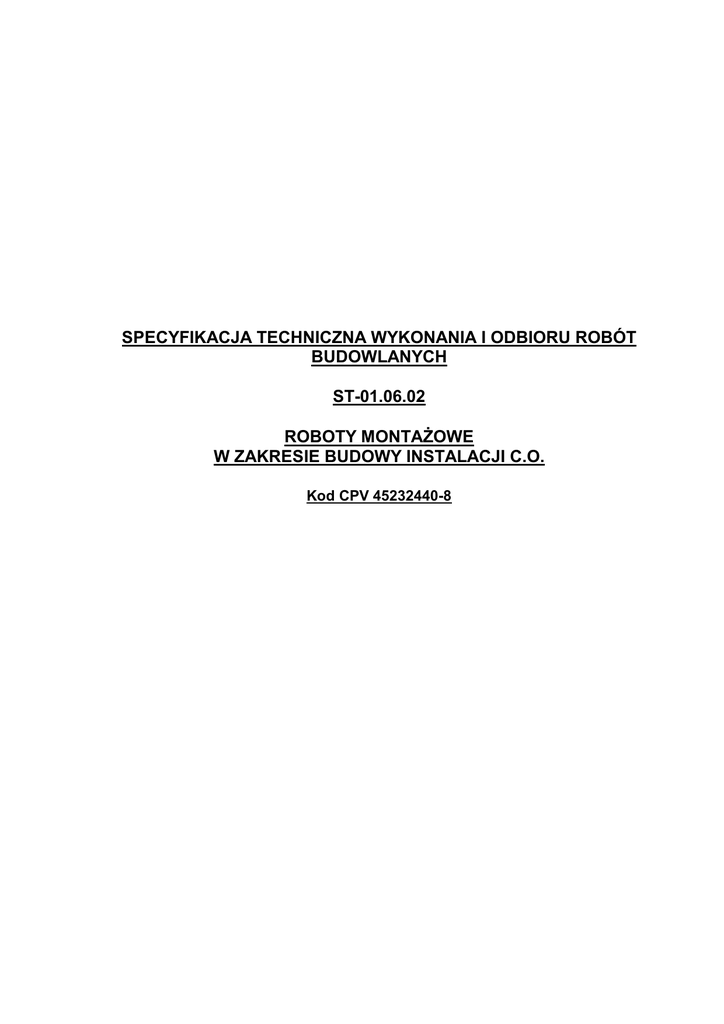 SPECYFIKACJA TECHNICZNA WYKONANIA I ODBIORU ROBÓT BUDOWLANYCH ST-01.06.02 ROBOTY MONTAŻOWE W ZAKRESIE BUDOWY INSTALACJI C.O. Kod CPV 45232440-8 ST-00.05 Specyfikacje Techniczne wykonania i odbioru robót budowlanych – Roboty montażowe w zakresie budowy instalacji c.o.. 1. WSTĘP 1.1. Przedmiot Szczegółowej Specyfikacji Technicznej Przedmiotem niniejszej Specyfikacji Technicznej są wymagania dotyczące wykonania i odbioru robót w zakresie wymiany grzejników instalacji centralnego ogrzewania w sali gimnastycznej Szkoły Podstawowej nr 3 w Chojnicach 1.2. Zakres stosowania Szczegółowej Specyfikacji Technicznej Specyfikacja Techniczna jest stosowana jako dokument przetargowy i kontraktowy przy zlecaniu i realizacji robót 1.3. Zakres robót objętych Szczegółową Specyfikacją Techniczną Roboty, których dotyczy specyfikacja, obejmują wszystkie czynności umożliwiające i mające na celu wymianę grzejników w sali gimnastycznej Szkoły Podstawowej nr 3 w Chojnicach. Niniejsza specyfikacja techniczna związana z wykonaniem niżej wymienionych robót: • montaż rurociągów, • montaż armatury, • montaż urządzeń grzejnych • badania instalacji, • regulacja działania instalacji. 1.3. Ogólne wymagania • Wykonawca jest odpowiedzialny za realizację robót zgodnie ze zleceniem, specyfikacją techniczną oraz zgodnie z art. 5. 22, 23 i 28 ustawy Prawo budowlane. „Warunkami technicznymi wykonania i odbioru instalacji ogrzewczych – zeszyt 6”. COBRTI INSTAL Warszawa 2003, „Warunkami technicznymi wykonania i odbioru robót budowlano-montażowych. Tom II Instalacje sanitarne i przemysłowe". Arkady, Warszawa 1988. • Odstępstwa od zlecenia mogą dotyczyć jedynie zastąpienia zaprojektowanych materiałów - w przypadku niemożliwości ich uzyskania - przez inne materiały lub elementy o zbliżonych charakterystykach i trwałości. Wszelkie zmiany i odstępstwa od zatwierdzonej dokumentacji technicznej nie mogą powodować obniżenia wartości funkcjonalnych i użytkowych instalacji, a jeżeli dotyczą zamiany materiałów i elementów określonych w dokumentacji technicznej na inne, nie mogą powodować zmniejszenia trwałości eksploatacyjnej. Roboty montażowe należy realizować zgodnie z „Warunkami technicznymi wykonania i odbioru robót budowlanomontażowych. Tom II Instalacje sanitarne i przemysłowe", Polskimi Normami, oraz innymi przepisami dotyczącymi przedmiotowej instalacji. 2. MATERIAŁY • Do wykonania instalacji centralnego ogrzewania mogą być stosowane wyroby producentów krajowych i zagranicznych. 2.1. Przewody • Instalacja centralnego ogrzewania wykonana będzie: • z rur stalowych, czarnych łączonych przez spawanie; • Dostarczone na budowę rury powinny być proste, czyste od zewnątrz i wewnątrz, bez widocznych wżerów i ubytków spowodowanych uszkodzeniami. 2.2. Grzejniki • Jako elementy grzejne instalacji należy zastosować grzejniki stalowe płytowe typ FKO ( boczne) wg PN-EN 442:1999 typ 33 900x3000 , proponuje się grzejniki prod. Kermi. 2.3. Armatura • Na podejściach do grzejników płytowych zamontować zawory odcinające typu RLV-KS • Na gałązkach zasilających zamontować zawory termostatyczne RTD-N z głowicami termostatycznymi , należy wykorzystać istniejące zawory termostatyczne • Grzejniki łączyć krzyżowo. 3. SPRZĘT • Wykonawca jest zobowiązany do używania jedynie takiego sprzętu, który nie spowoduje niekorzystnego wpływu na jakość wykonywanych robót, zarówno w miejscu tych robót, jak też przy wykonywaniu czynności pomocniczych oraz w czasie transportu. załadunku i wyładunku materiałów. 4. TRANSPORT l SKŁADOWANIE 4.1. Rury • Rury w wiązkach muszą być transportowane na samochodach o odpowiedniej długości, zgodnie z obowiązującymi przepisami transportowymi. Kształtki należy przewozić w odpowiednich pojemnikach. Podczas transportu, przeładunku i magazynowania rur i kształtek należy unikać ich zanieczyszczenia. 4.2. Grzejniki • Transport grzejników powinien odbywać się krytymi środkami transportu, zgodnie z obowiązującymi przepisami transportowymi. Zaleca się transportowanie grzejników na paletach dostosowanych do ich wymiaru. Na każdej palecie powinny być pakowane grzejniki jednego typu i wielkości. Palety z grzejnikami powinny być ustawione i zabezpieczone, aby w czasie ruchu środka transportu nie nastąpiło ich przemieszczanie i uszkodzenie grzejników. Dopuszcza się transportowanie grzejników luzem, ułożonych w warstwy, zabezpieczonych przed przemieszczaniem i uszkodzeniem. str. 46 ST-00.05 Specyfikacje Techniczne wykonania i odbioru robót budowlanych – Roboty montażowe w zakresie budowy instalacji c.o.. str. 47 4.3. Armatura • Transport armatury powinien odbywać się krytymi środkami transportu, zgodnie z obowiązującymi przepisami transportowymi. Armatura transportowana luzem powinna być zabezpieczona przed przemieszczaniem i uszkodzeniami mechanicznymi. Armatura drobna (≤ DN25) powinna być pakowana w skrzynie lub pojemniki. 5. WYKONANIE ROBÓT 5.1. Montaż rurociągów • Rurociągi stalowe łączone będą poprzez spawanie zgodnie z Wymaganiami Technicznymi COBRTI INSTAL zeszyt 2: „Wytyczne projektowania centralnego ogrzewania". Rurociągi z rur polipropylenowych Stabi Glass łączyć poprzez zgrzewanie. • Przed układaniem przewodów należy sprawdzić trasę oraz usunąć przeszkody (możliwe do wyeliminowania), mogące powodować uszkodzenie przewodów (np. pręty, wystające elementy zaprawy betonowej i muru). • Przed zamontowaniem należy sprawdzić, czy elementy przewidziane do zamontowania nie posiadają uszkodzeń mechanicznych oraz czy w przewodach nie ma zanieczyszczeń (ziemia, papiery i inne elementy). Rur pękniętych lub w inny sposób uszkodzonych nie wolno używać. • Kolejność wykonywania robót: • wyznaczenie miejsca ułożenia rur, • wykonanie gniazd i osadzenie uchwytów, • przecinanie r
