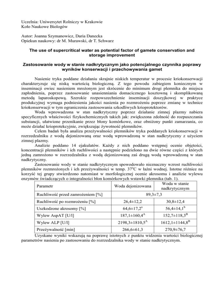 Uczelnia: Uniwersytet Rolniczy w Krakowie Koło Naukowe Biologów Autor: Joanna Szymanowicz, Daria Danecka Opiekun naukowy: dr M. Murawski, dr T. Schwarz The use of supercritical water as potential factor of gamete conservation and storage improvement Zastosowanie wody w stanie nadkrytycznym jako potencjalnego czynnika poprawy wyników konserwacji i przechowywania gamet Nasienie tryka poddane działaniu skrajnie niskich temperatur w procesie kriokonserwacji charakteryzuje się niską wartością biologiczną. Z tego powodu zabiegiem koniecznym w inseminacji owiec nasieniem mrożonym jest skrócenie do minimum drogi plemnika do miejsca zapłodnienia, poprzez zastosowanie unasienniania domacicznego kosztowną i skomplikowaną metodą laparoskopową. Szerokie rozpowszechnienie inseminacji doszyjkowej w praktyce produkcyjnej wymaga podniesienia jakości nasienia po rozmrożeniu poprzez zmianę w technice kriokonserwacji w tym ograniczenia zastosowania szkodliwych krioprotektorów. Woda wprowadzona w stan nadkrytyczny poprzez działanie zimnej plazmy nabiera specyficznych właściwości fizykochemicznych takich jak: zwiększona zdolność do rozpuszczania substancji, ułatwione przenikanie przez błony komórkowe, oraz obniżony punkt zamarzania, co może działać krioprotekcyjnie, zwiększając żywotność plemników. Celem badań była analiza przeżywalności plemników tryka poddanych kriokonserwacji w rozrzedzalniku z wodą dejonizowaną oraz wodą wprowadzoną w stan nadkrytyczny z użyciem zimnej plazmy. Analizie poddano 14 ejakulatów. Każdy z nich poddano wstępnej ocenie objętości, koncentracji plemników i ich ruchliwości a następnie podzielono na dwie równe części z których jedną zamrożono w rozrzedzalniku z wodą dejonizowaną zaś drugą wodą wprowadzoną w stan nadkrytyczny. Zastosowanie wody w stanie nadkrytycznym spowodowało nieznaczny wzrost ruchliwości plemników rozmrożonych i ich przeżywalności w temp. 37oC w łaźni wodnej. Istotne różnice na korzyść tej grupy stwierdzono natomiast w morfologicznej ocenie akrosomu i analizie wylewu enzymów świadczących o integralności błon komórkowych wstawki plemnika (tab. 1). Woda w stanie Parametr Woda dejonizowana nadkrytycznym Ruchliwość przed zamrożeniem [%] 89,3±7,3 Ruchliwość po rozmrożeniu [%] 26,4±12,2 30,8±12,4 Uszkodzone akrosomy [%] 64,6±17,2a 56,4±14,1b 187,1±160,4A 152,7±118,3B 2198,3±1810,5A 1612,1±1144,8B Wylew AspAT [U/l] Wylew ALP [U/l] Przeżywalność [min] 266,6±61,3 270,9±76,7 Uzyskane wyniki wskazują na poprawę istotnych z punktu widzenia wartości biologicznej parametrów nasienia po zastosowaniu do rozrzedzalnika wody w stanie nadkrytycznym.