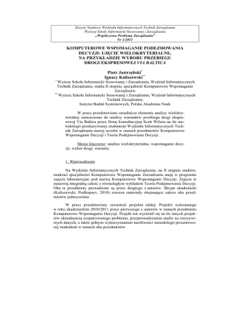 Zeszyty Naukowe Wydziału Informatycznych Technik Zarządzania Wyższej Szkoły Informatyki Stosowanej i Zarządzania „Współczesne Problemy Zarządzania” Nr 1/2011 KOMPUTEROWE WSPOMAGANIE PODEJMOWANIA DECYZJI: UJĘCIE WIELOKRYTERIALNE, NA PRZYKŁADZIE WYBORU PRZEBIEGU DROGI EKSPRESOWEJ VIA BALTICA Piotr Jastrzębski* Ignacy Kaliszewski** * Wyższa Szkoła Informatyki Stosowanej i Zarzadzania, Wydział Informatycznych Technik Zarządzania, studia II stopnia, specjalność Komputerowe Wspomaganie Zarządzania ** Wyższa Szkoła Informatyki Stosowanej i Zarządzania, Wydział Informatycznych Technik Zarządzania; Instytut Badań Systemowych, Polska Akademia Nauk W pracy przedstawiono zasadnicze elementy analizy wielokryterialnej zastosowane do analizy wariantów przebiegu drogi ekspresowej Via Baltica przez firmę konsultacyjną Scott Wilson na tle metodologii przekazywanej studentom Wydziału Informatycznych Technik Zarządzania naszej uczelni w ramach przedmiotów Komputerowe Wspomaganie Decyzji i Teoria Podejmowania Decyzji. Słowa kluczowe: analiza wielokryterialna, wspomaganie decyzji, wybór drogi, warianty 1. Wprowadzenie Na Wydziale Informatycznych Technik Zarządzania, na II stopniu studiów, studenci specjalności Komputerowe Wspomaganie Zarzadzania mają w programie zajęcia laboratoryjne pod nazwą Komputerowe Wspomaganie Decyzji. Zajęcia te stanowią integralną całość z równoległym wykładem Teoria Podejmowania Decyzji. Oba te przedmioty prowadzone są przez drugiego z autorów. Skrypt akademicki (Kaliszewski, Podkopaev, 2010) zawiera materiały obejmujące zakres obu przedmiotów jednocześnie. W pracy przedstawimy zawartość projektu (dalej: Projekt) wykonanego w roku akademickim 2010/2011 przez pierwszego z autorów w ramach przedmiotu Komputerowe Wspomaganie Decyzji. Projekt ten wyróżnił się na tle innych projektów aktualnością rozpatrywanego problemu, przeprowadzeniem analiz na rzeczywistych danych, a także pełnym wykorzystaniem możliwości metodologii prezentowanej studentom w ramach obu przedmiotów. Piotr Jastrzębski i Ignacy Kaliszewski W szczególności, interesować nas będzie, jak metodologia analizy wielokryterialnej przekazywana studentom w ramach obu przedmiotów może wzbogacić takie analizy przeprowadzane w odniesieniu do rzeczywistych, bieżących problemów decyzyjnych występujących w gospodarce, i jak uniknąć związanych z taką analizą możliwych pułapek. Przywołany tu Projekt pierwszego z autorów stanowi dobrą tego ilustrację. 2 Droga ekspresowa Via Baltica Przebieg drogi ekspresowej Via Baltica przez terytorium Polski na odcinku od granicy litewskiej do Warszawy wzbudzał przez szereg lat gorące kontrowersje. Forsowany początkowo przez Generalną Dyrekcję Dróg Krajowych i Autostrad wariant przebiegu, zakładający przecięcie przez tę drogę Doliny Rospudy (Wariant 1), wzbudzał gorący sprzeciw ekologów. W sprawę zaangażowała się nawet Unia Europejska, stając po stronie ekologów i wytykając rządowi polskiemu próbę naruszenia regulacji unijnych. Ostatecznie, pod zmasowanym naciskiem krajowej i europejskiej opinii publicznej, rząd podjął decyzję o takim przebiegu drogi, który omija prawnie chronione obszary przyrody. Trzeba to podkreślić, że przebieg drogi w okolicach Doliny Rospudy był tylko jednym z wielu, choć najbardziej nagłośnionych przez media, odcinków drogi, wokół przebiegu których istniały gorące spory.1 Na pewnym etapie prac, znajdująca się wówczas w ogniu krytyki Generalna Dyrekcja Dróg Krajowych i Autostrad, zleciła wskazanie firmie doradczej Scott Wilson wariantów przebiegu drogi ekspresowej Via Baltica i przedstawienia rekomendacji. W lipcu 2008 roku firma przedstawiła dokument Strategia rozwoju … (2011), w którym między innymi dokonano analizy wielokryterialnej rozważanych wariantów. W tym artykule odniesiemy się jedynie do tego aspektu dokumentu. 3. Analiza wielokryterialna według firmy Scott Wilson Analiza wielokryterialna dokonana przez firmę Scott Wilson została przeprowadzona w odniesieniu do 40 wariantów przebiegu drogi ekspresowej Via Baltica ocenianych względem czterech kryteriów. Czytelnika zainteresowanego sposobem ustalenia poszczególnych wariantów jak i sposobem uzyskania wartości kryteriów, odsyłamy do wspomnianego wyżej dokumentu. Tutaj skupimy się wyłącznie na metodologii analizy wielokryterialnej zastosowanej przez firmę Scott Wilson w odniesieniu do wykorzystanych przez firmę w analizie wariantów i wartości kryteriów. Dane wykorzystane przez firmę przedstawia Tabela 1 (oznaczenia wariantów jak w dokumencie Strategia rozwoju…, 2011, wartości kryteriów odwzorowane zostały na wspólną skalę punktową o wartościach z przedziału od 0 do 10 punktów). 1 Jak wiadomo sprawa zakończyła się rządową decyzją o zmianie wcześniej zaakceptowanego przebiegu trasy, z pominięciem Doliny Rospudy. 64 Komputerowe wspomaganie podejmowania decyzji: ujęcie wielokryterialne Tabela 1. Wartości kryteriów dla wariantów przebiegu Via Baltica Kryterium Kryterium Kryterium Kryterium śroWariant ruchowoekonomiczne społeczne dowiskowe sieciowe Wariant 1 9,0 4,7 4,0 0,0 Wariant 1a 8,4 5,2 3,3 0,7 Wariant 1b 8,8 0,0 4,4 2,0 Wariant 1c 9,4 0,5 6,7 2,7 Wariant 2 10,0 5,5 7,5 4,4 Wariant 2a 9,4 6,4 7,0 5,1 Wariant 2b 8,8 4,4 6,6 5,3 Wariant 2c 8,6 6,9 7,2 6,0 Wariant 2d 7,6 2,8 4,4 5,2 Wariant 2e 6,9 3,6 3,6 5,9 Wariant 2f 8,9 2,2 7,4 1,9 Wariant 2g 7,5 3,1 4,3 2,6 Wariant 2h 7,4 3,9 5,2 4,4 Wariant 2i 6,8 4,8 4,6 5,0 Wariant 2j 6,5 2,3 4,4 4,3 Wariant 2k 6,1 3,2 4,4 5,0 Wariant 3 6,6 5,8 8,7 6,0 Wariant 3a 6,2 6,7 7,2 6,7 Wariant 3b 6,4 4,2 7,8 5,9 Wariant 3c 6,1 5,1 6,9 6,6 Wariant 4 5,4 10,0 2,5 6,6 Wariant 4a 6,2 8,4 2,1 6,5 Wariant 4b 1,1 7,7 4,6 10,0 Wariant 4c 0,1 6,1 4,0 9,9 Wariant 24 4,8 6,6 0,7 3,6 Wariant 24a 4,1 7,4 0,0 4,3 Wariant 24b 5,9 5,0 1,4 3,5 Wariant 24c 4,9 5,8 1,0 4,2 Wariant 24d 1,4 4,2 5,0 7,0 Wariant 24e 0,1
