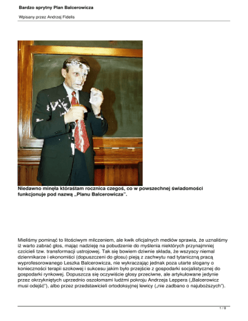 Bardzo sprytny Plan Balcerowicza Wpisany przez Andrzej Fidelis Niedawno minęła któraśtam rocznica czegoś, co w powszechnej świadomości funkcjonuje pod nazwą „Planu Balcerowicza”. Mieliśmy pominąć to litościwym milczeniem, ale kwik oficjalnych mediów sprawia, że uznaliśmy iż warto zabrać głos, mając nadzieję na pobudzenie do myślenia niektórych przynajmniej czcicieli tzw. transformacji ustrojowej. Tak się bowiem dziwnie składa, że wszyscy niemal dziennikarze i ekonomiści (dopuszczeni do głosu) pieją z zachwytu nad tytaniczną pracą wyprofesorowanego Leszka Balcerowicza, nie wykraczając jednak poza utarte slogany o konieczności terapii szokowej i sukcesu jakim było przejście z gospodarki socjalistycznej do gospodarki rynkowej. Dopuszcza się oczywiście głosy przeciwne, ale artykułowane jedynie przez okrzykniętych uprzednio oszołomami ludźmi pokroju Andrzeja Leppera („Balcerowicz musi odejść”), albo przez przedstawicieli ortodoksyjnej lewicy („nie zadbano o najuboższych”). 1/8 Bardzo sprytny Plan Balcerowicza Wpisany przez Andrzej Fidelis Prawica może wypowiadać się negatywnie o Planie Balcerowicza tylko gdy jest skrajna, albo gdy ma inny dyskredytujący ją atrybut (np. jest pisowska). Rzeczowa dyskusja, a szczególnie rzeczowe argumenty są niedopuszczalne. Balcerowicz powinien przecież dostać Nobla… co patrząc na ostatnie wybryki Komitetu, nie jest wykluczone. Całościowe ujęcie tematu wymagałoby oczywiście wielostronicowego opracowania, skupimy się zatem na kilku przemilczanych, lub zafałszowanych kwestiach. Postawimy też kilka niewygodnych pytań, na które czytelnik może spróbować znaleźć samodzielną odpowiedź. Aby to było możliwe nie należy zapominać o najprostszym fakcie, a mianowicie że wolny rynek jest naturalną emanacją działalności człowieka i w niemal każdej sytuacji tworzy się samoistnie. Zacznijmy więc od początku. Co to jest inflacja? Podobno wie to każde dziecko, mamy jednak wątpliwość czy jest to wiedza dostępna profesorom. Początkowo bowiem Leszek Balcerowicz (fakt, był wtedy tylko adiunktem) tłumacz ył społeczeństwu, że inflacja powstaje gdy na rynku są niedobory produktów i producenci mogą podnosić ich ceny. Niby prawda, ale już po dziesięciu latach ten sam Leszek Balcerowicz (fakt, już jako profesor) tłumaczył, że inflacja powstaje gdy na rynku jest za dużo pieniędzy i konsumenci mogą płacić więcej za produkty, których wprawdzie nie brakuje, ale producenci znowu mogą podnosić ich ceny (zwłaszcza gdy nie mają konkurencji). Niby też prawda, bo obie definicje są jakby dwiema stronami tego samego problemu i nie mogą działać w odosobnieniu. Pojawia się jednak drobne pytanie: skąd u licha na rynku brały się nieprzebrane ilości pieniędzy w początkach transformacji (rosły bowiem nie tylko ceny, ale i wynagrodzenia), gdy napływ 2/8 Bardzo sprytny Plan Balcerowicza Wpisany przez Andrzej Fidelis kapitału zagranicznego był praktycznie zerowy? Czyżby jednak działała tylko druga część definicji? Czyżby nadmiar pieniądza był generowany celowo przez NBP i rząd? Powie ktoś, że Balcerowicz właśnie zaczął dusić inflację. Trudno jednak uznać za sukces obniżenie jej do kilkudziesięciu procent rocznie. Wygląda raczej na to, że uznano ją za zjawisko pożyteczne dla wielu, o ile pozostaje w przewidywalnych ryzach, a Plan Balcerowicza dawał takie gwarancje. Czemu to miało służyć? No cóż, przy wysokiej inflacji wysokie jest też oprocentowanie depozytów i kredytów, a to daje szerokie pole do kręcenia lodów… Bony, dolary, kupię! Każda wolnorynkowa gospodarka ma wymienialną walutę. Za komuny mieliśmy kurs oficjalny (nie mający nic wspólnego z wartością złotówki) i kurs czarnorynkowy (substytut wolnorynkowego). W czerwcu 1989 roku kurs czarnorynkowy dolara oscylował w okolicy 1800 starych złotych (miesięczne wynagrodzenie wynosiło w przeliczeniu ok. 25 dolarów). Potem zaczęło się istne szaleństwo. Dość powiedzieć, że sięgnęliśmy kursu w okolicach 4-7 tys. starych złotych, który został przez Leszka Balcerowicza dodatkowo zdewaluowany do 9500 zł i uznany za sztywny (!) kurs oficjalny. Jeśli ktoś myśli, że osiągnęliśmy w ten sposób wymienialność złotówki, to się niestety myli. Wielu odczuło to bardzo dotkliwie. Złotówka nie mogła być wymieniona za granicą, a jedynie w NBP. Kurs był ustalany arbitralnie w odniesieniu do jakiegoś koszyka walut i taka sytuacja trwała do roku 2001, a w pewnym sensie trwa do dziś (wymienialność złotówki jest raczej kwestią umowy między NBP i EBC). I tu ocieramy się o odpowiedź na postawione wcześniej pytanie, skąd u licha te nieprzebrane ilości pieniędzy generujących inflację w gospodarce niedoboru? Jeśli bowiem NBP w początkowej fazie płaciło zagranicznym spekulantom walutowym niebotyczne ceny za jednego dolara, to wystarczyło niewiele owych dolarów żeby zalać rynek coraz mniej wartymi złotówkami. Skupmy się jednak na naszym bohaterze. Mocą swojego nazwiska udaje mu się utrzymać niemal stały kurs dolara i marki niemieckiej przez całą dekadę (po okresie krótkotrwałej hiperinflacji za jedną markę niemiecką płaciło się z drobnymi wahaniami ok. 2 nowych złotych, a zarobki oscylują w okolicy 200 DM miesięcznie). Jego liberalizm nie sięga jednak tak daleko aby uwolnić rynek walut, pytanie drugie narzuca się zatem samo: Jak nasz niedoszły jeszcze profesor obliczył wyżej wymieniony kurs wymiany i czy się przy tych wyliczeniach nie kopnął? Ponieważ pomysłowość polaków nie zna granic, do końca lat dziewięćdziesiątych obywatele polscy mają zakaz zakładania rachunków 3/8 Bardzo sprytny Plan Balcerowicza Wpisany przez Andrzej Fidelis bankowych za granicą, zakaz przywożenia do kraju większej ilości dewiz i zakaz brania kredytów walutowych! Mogą brać kredyty w złotówkach… oprocentowane 