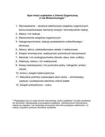 Spis treści wykładów z Chemii Organicznej (I rok Biotechnologii) * 1. Wprowadzenie – struktura elektronowa związków organicznych, teoria kwasów/zasad; elementy kinetyki i termodynamiki reakcji. 2. Alkany i ich reakcje. 3. Stereochemia związków organicznych. 4. Halogenopochodne; reakcje podstawienia nukleofilowego i eliminacji. 5. Alkeny; alkiny; zdelokalizowane układy π elektronowe. 6. Związki aromatyczne; reaktywność pochodnych benzylowych. 7. Alkohole I ich analogi/pochodne (fenole, etery, tiole, sulfidy). 8. Aldehydy, ketony i ich reaktywność 9. Kwasy karboksylowe i ich pochodne (estry, halogenki, amidy i nitryle) 10. Aminy i związki heterocykliczne. 11. Naturalne polimery zawierające atom azotu – aminokwasy, peptydy i podstawowe elementy chemii białek. 12. Związki policykliczne – cukry. * Pojawiające się na mojej stronie internetowej „treści wykładów” są tylko podstawą do słuchania i łatwiejszego przyswajania wykładów. Zamieszczone mechanizmy reakcji są niepełne i nie zawierają oznaczenia kierunku przepływu elektronów, co należy uzupełnić podczas słuchania wykładów.