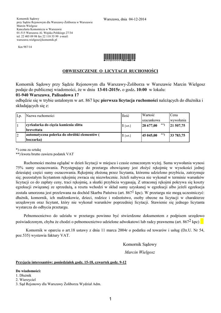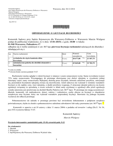 Komornik Sądowy przy Sądzie Rejonowym dla Warszawy-Żoliborza w Warszawie Marcin Wielgosz Kancelaria Komornicza w Warszawie 01-515 Warszawa Al. Wojska Polskiego 27/34 tel. 22 405 09 98 fax 22 118 55 99 e-mail: [email protected] Warszawa, dnia 04-12-2014 Km 987/14 *0020000162480* OBWIESZCZENIE O LICYTACJI RUCHOMOŚCI Komornik Sądowy przy Sądzie Rejonowym dla Warszawy-Żoliborza w Warszawie Marcin Wielgosz podaje do publicznej wiadomości, że w dniu 13-01-2015r. o godz. 10:00 w lokalu: 01-940 Warszawa, Palisadowa 17 odbędzie się w trybie ustalonym w art. 867 kpc pierwsza licytacja ruchomości należących do dłużnika i składających się z: Lp. Nazwa ruchomości Ilość 1 cyrkularka do cięcia kamienia slitta brevettata automatyczna polerka do obróbki elementów ( boczarka) 1 [szt.] Wartość szacunkowa 28 677,00 **) 1 [szt.] 45 045,00 2 **) Cena wywołania 21 507,75 33 783,75 *) cena za sztukę **) kwota brutto zawiera podatek VAT Ruchomości można oglądać w dzień licytacji w miejscu i czasie oznaczonym wyżej. Suma wywołania wynosi 75% sumy oszacowania. Przystępujący do przetargu obowiązany jest złożyć rękojmię w wysokości jednej dziesiątej części sumy oszacowania. Rękojmię złożoną przez licytanta, któremu udzielono przybicia, zatrzymuje się; pozostałym licytantom rękojmię zwraca się niezwłocznie. Jeżeli nabywca nie wykonał w terminie warunków licytacji co do zapłaty ceny, traci rękojmię, a skutki przybicia wygasają. Z utraconej rękojmi pokrywa się koszty egzekucji związanej ze sprzedażą, a reszta wchodzi w skład sumy uzyskanej w egzekucji albo jeżeli egzekucja została umorzona jest przelewana na dochód Skarbu Państwa (art. 8671 kpc). W przetargu nie mogą uczestniczyć: dłużnik, komornik, ich małżonkowie, dzieci, rodzice i rodzeństwo, osoby obecne na licytacji w charakterze urzędowym oraz licytant, który nie wykonał warunków poprzedniej licytacji. Stawienie się jednego licytanta wystarcza do odbycia przetargu. Pełnomocnictwo do udziału w przetargu powinno być stwierdzone dokumentem z podpisem urzędowo poświadczonym, chyba że chodzi o pełnomocnictwo udzielone adwokatowi lub radcy prawnemu (art. 8672 kpc) Komornik w oparciu o art.18 ustawy z dnia 11 marca 2004r o podatku od towarów i usług (Dz.U. Nr 54, poz.535) wystawia faktury VAT. Komornik Sądowy Marcin Wielgosz Przyjęcia interesantów: poniedziałek godz. 15-18, czwartek godz. 9-12 Do wiadomości: 1. Dłużnik 2. Wierzyciel 3. Sąd Rejonowy dla Warszawy Żoliborza Wydział Adm. 1