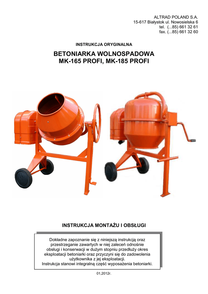 ALTRAD POLAND S.A. 15-617 Białystok ul. Nowosielska 6 tel. (...85) 661 32 61 fax. (...85) 661 32 60 INSTRUKCJA ORYGINALNA BETONIARKA WOLNOSPADOWA MK-165 PROFI, MK-185 PROFI INSTRUKCJA MONTAŻU I OBSŁUGI Dokładne zapoznanie się z niniejszą instrukcją oraz przestrzeganie zawartych w niej zaleceń odnośnie obsługi i konserwacji w dużym stopniu przedłuży okres eksploatacji betoniarki oraz przyczyni się do zadowolenia użytkownika z jej eksploatacji. Instrukcja stanowi integralną część wyposażenia betoniarki. 01,2012r. SPIS TREŚCI 1. UWAGI OGÓLNE 2. PRZEZNACZENIE 3. DANE TECHNICZNE 4. OPIS TECHNICZNY 5. POZIOM CIŚNIENIA AKUSTYCZNEGO DZIAŁAJĄCY NA OBSŁUGĘ 6. BEZPIECZEŃSTWO UŻYTKOWANIA 7. TRANSPORT I PRZECHOWYWANIE 8. WYKAZ CZĘŚCI ZAMIENNYCH 9. INSTRUKCJA OBSŁUGI 10. INSTRUKCJA KONSERWACJI I NAPRAW 11. SPECYFIKACJA 12. DEMONTAŻ I KASACJA 13. SPOSÓB PRZYGOTOWANIA ZAPRAWY KARTA GWARANCYJNA DEKLARACJA ZGODNOŚCI WE 1. UWAGI OGÓLNE 1. Typ oraz podstawowe dane betoniarki zamieszczono na tabliczce znamionowej. Umieszczona jest ona na osłonie napędu. 2. Betoniarka z napędem elektrycznym podlega Dyrektywie Europejskiej 2002/96/E dotyczącej zużytego sprzętu elektrycznego i elektronicznego, w związku z tym : a) posiada na tabliczce znamionowej oznaczenie zgodnie z w/w dyrektywą (przekreślony kosz) w sprawie zużytego sprzętu elektrycznego i elektronicznego (WEEE). b) przed wyrzuceniem (złomowaniem) betoniarki należy wyjąć z niej silnik elektryczny i wyłącznik z przewodami, które podlegają selektywnej zbiórce zużytego sprzętu elektrycznego i elektronicznego w celu ich utylizacji. Silnika i wyłącznika z przewodami nie wolno umieszczać razem z innymi ogólnymi odpadami. Miejsce ich zbiórki powinno być określone przez służby miejskie lub gminne. c) pozostałe elementy betoniarki podlegają normalnej zbiórce odpadów, głównie jako złom stalowy. d) tabliczki z przekreślonym koszem nie wolno niszczyć ani odrywać. 3. Niniejsza instrukcja jest bardzo ważną częścią składową betoniarki. Dokładne zapoznanie się z jej treścią, szczególnie w zakresie montażu, podłączenia zasilania i użytkowania zapewni bezpieczną i bezawaryjną pracę betoniarki. 4. Nabywając betoniarkę należy sprawdzić jej kompletność wg pkt. 11 niniejszej instrukcji oraz adnotację o dacie sprzedaży w karcie gwarancyjnej. 5. Zastosowany do załączania betoniarki wyłącznik samoczynnie odłącza napęd w przypadku zaniku prądu. W celu uruchomienia betoniarki należy ponownie go włączyć. 6. Do podłączenia betoniarki wymagany jest przedłużacz wykonany z przewodu OWY lub OPL 3 x 2,5 mm2 zakończonego gniazdem wtykowym z uziemieniem. Zalecana długość przedłużacza – 10 - 20 mb. 7. Zalecana temperatura zewnętrzna przy wykonywaniu zapraw murarskich od +5 do 400C. 8. Przy zgłaszaniu uwag, zamawianiu części zamiennych, reklamacji należy podawać typ betoniarki, datę produkcji i numer fabryczny. 9. W przypadku wystąpienia niejasności lub kłopotów z podłączeniem lub użytkowaniem, należy zwrócić się do: • Producenta – adres i telefony na stronie tytułowej • Sprzedawcy – dystrybutora betoniarki 10. Podczas użytkowania betoniarka powinna stać na równym i twardym podłożu. Dopuszczalna nierówność podłoża ÷ 2°. 11. Producent zastrzega sobie prawo zmian konstrukcyjnych wyrobów nie powodujących pogorszenia parametrów technicznych, które nie będą wykazane w instrukcji, przy czym zasadnicze cechy wyrobu zostaną zachowane. 12. Nie wolno eksploatować betoniarki z otwartą osłoną napędu. 2. PRZEZNACZENIE Wolno-spadowa betoniarka bębnowa o napędzie elektrycznym przeznaczona jest do produkcji mieszanek betonowych o konsystencji ciekłej, półciekłej i plastycznej oraz zapraw cementowych i cementowo-wapiennych. Może być używana do mieszania materiałów sypkich. Użytkowanie ich do innych celów będzie rozumiane jako użytkowanie niezgodne z przeznaczeniem. 3. DANE TECHNICZNE Wyszczególnienie Pojemność bębna Pojemność zasypowa max Zapotrzebowanie mocy P1 Rodzaj prądu Obroty bębna Gabaryty: Długość Szerokość Wysokość Wysokość załadunku Wysokość wyładunku Masa Miano MK-165 PROFI MK-185 PROFI dm3 165 180 dm3 130 145 kW 0,9 V/Hz 230/50 min-1 23±1 mm 1265 1265 mm 735 735 mm 1280 1280 mm 900 mm 600 kg 84 86 4. OPIS TECHNICZNY Betoniarka składa się z następujących zasadniczych zespołów : • Stojaka kompletnego wykonanego z kształtowników odpowiednio pospawanych. Do stojaka przykręcone są również pozostałe zespoły. • Pałąka nośnego z ułożyskowanym na jego osi bębnem, do którego przymocowane są łapy mieszające i wieniec zębaty żeliwny, • Mechanizmu przechyłu i ustalenia pozycji bębna betoniarki do mieszania, składającego się z: o koła przechyłu, tarczy ryglującej oraz cięgna ze sprężyną. o W odmianie mk-185 - przekładni ślimakowej osadzonej na czopie pałąka i przykręconej korpusem do stojaka oraz korby do obracania ślimaka, a przez to i bębna betoniarki, • Napędu bębna składającego się z 1-fazowego silnika elektrycznego, przekładni pasowej i przekładni zębatej. Przekładnię zębatą stanowi : -koło atakujące z12 i wieniec żeliwny Z144 (Z130) • Zespołu instalacji elektrycznej, której podstawowymi elementami są : silnik elektryczny, wyłącznik, przewody, wtyczka, obudowa. Praca betoniarki ma charakter okresowy tzn.,że kolejność pracy jest następująca : • załadowanie składników • mieszanie • opróżnianie Kąt ustawienia bębna do poziomu podczas mieszania winien wynosić 22 ÷ 30o. Betoniarka załączana jest do pracy za pomocą wyłącznika przyciskowego umieszczonego na obudowie napędu. 5. POZIOM CIŚNIENIA AKUSTYCZNEGO DZIAŁAJĄCY NA OBSŁUGĘ • • maksymalny, równoważny poziom ciśnienia, mierzony od strony napędu, podczas mieszania – LpAeq,T=81 dB ±2,5dB równoważny poziom ciśnienia, mierzony od strony 
