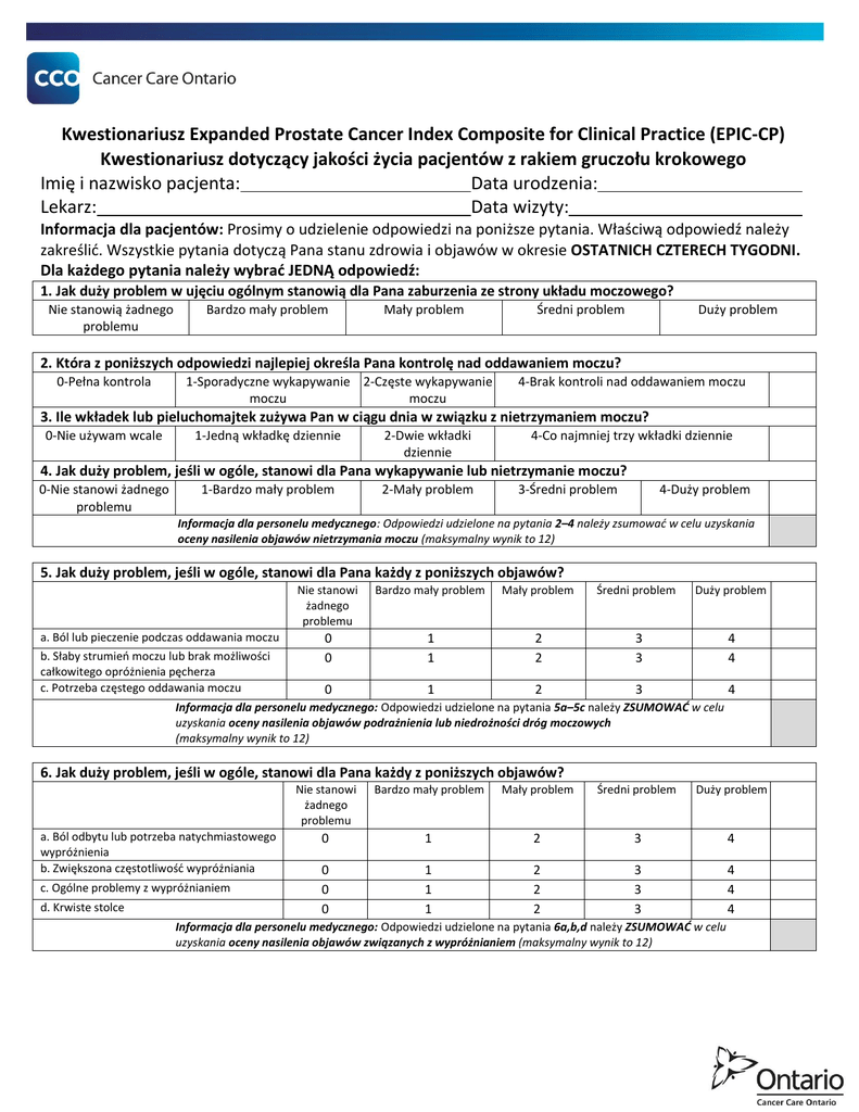 Kwestionariusz Expanded Prostate Cancer Index Composite for Clinical Practice (EPIC-CP) Kwestionariusz dotyczący jakości życia pacjentów z rakiem gruczołu krokowego Imię i nazwisko pacjenta: Data urodzenia: Lekarz: Data wizyty: Informacja dla pacjentów: Prosimy o udzielenie odpowiedzi na poniższe pytania. Właściwą odpowiedź należy zakreślić. Wszystkie pytania dotyczą Pana stanu zdrowia i objawów w okresie OSTATNICH CZTERECH TYGODNI. Dla każdego pytania należy wybrać JEDNĄ odpowiedź: 1. Jak duży problem w ujęciu ogólnym stanowią dla Pana zaburzenia ze strony układu moczowego? Nie stanowią żadnego problemu Bardzo mały problem Mały problem Średni problem Duży problem 2. Która z poniższych odpowiedzi najlepiej określa Pana kontrolę nad oddawaniem moczu? 0-Pełna kontrola 1-Sporadyczne wykapywanie 2-Częste wykapywanie moczu moczu 4-Brak kontroli nad oddawaniem moczu 3. Ile wkładek lub pieluchomajtek zużywa Pan w ciągu dnia w związku z nietrzymaniem moczu? 0-Nie używam wcale 1-Jedną wkładkę dziennie 2-Dwie wkładki dziennie 4-Co najmniej trzy wkładki dziennie 4. Jak duży problem, jeśli w ogóle, stanowi dla Pana wykapywanie lub nietrzymanie moczu? 0-Nie stanowi żadnego problemu 1-Bardzo mały problem 2-Mały problem 3-Średni problem 4-Duży problem Informacja dla personelu medycznego: Odpowiedzi udzielone na pytania 2–4 należy zsumować w celu uzyskania oceny nasilenia objawów nietrzymania moczu (maksymalny wynik to 12) 5. Jak duży problem, jeśli w ogóle, stanowi dla Pana każdy z poniższych objawów? a. Ból lub pieczenie podczas oddawania moczu b. Słaby strumień moczu lub brak możliwości całkowitego opróżnienia pęcherza c. Potrzeba częstego oddawania moczu Nie stanowi żadnego problemu Bardzo mały problem Mały problem Średni problem Duży problem 0 0 1 1 2 2 3 3 4 4 0 1 2 3 4 Informacja dla personelu medycznego: Odpowiedzi udzielone na pytania 5a–5c należy ZSUMOWAĆ w celu uzyskania oceny nasilenia objawów podrażnienia lub niedrożności dróg moczowych (maksymalny wynik to 12) 6. Jak duży problem, jeśli w ogóle, stanowi dla Pana każdy z poniższych objawów? a. Ból odbytu lub potrzeba natychmiastowego wypróżnienia b. Zwiększona częstotliwość wypróżniania c. Ogólne problemy z wypróżnianiem d. Krwiste stolce Nie stanowi żadnego problemu Bardzo mały problem Mały problem Średni problem Duży problem 0 1 2 3 4 0 0 0 1 1 1 2 2 2 3 3 3 4 4 4 Informacja dla personelu medycznego: Odpowiedzi udzielone na pytania 6a,b,d należy ZSUMOWAĆ w celu uzyskania oceny nasilenia objawów związanych z wypróżnianiem (maksymalny wynik to 12) 7. Jak ocenia Pan swoją zdolność do osiągnięcia szczytowania (orgazmu)? 0-Bardzo dobra 1-Dobra 2-Całkiem dobra 3-Słaba 4-Bardzo słaba do żadnej 8. Jak określiłby Pan typową jakość swoich erekcji? 0-Wystarczająca do odbycia stosunku 1-Wystarczająca do masturbowania się lub prowadzenia gry wstępnej 2-Niewystarczająca do podjęcia jakiejkolwiek aktywności seksualnej 4-W ogóle nie osiągam erekcji 9. Jak duży problem w ujęciu ogólnym stanowią dla Pana zaburzenia funkcji seksualnych lub ich brak? 0-Nie stanowią żadnego problemu 1-Bardzo mały problem 2-Mały problem 3-Średni problem 4-Duży problem 10. Jak duży problem, jeśli w ogóle, stanowi dla Pana każdy z poniższych objawów? Nie stanowi żadnego problemu a. Uderzenia gorąca albo tkliwość lub powiększenie sutków b. Uczucie przygnębienia c. Brak energii Bardzo mały problem Mały problem Średni problem Duży problem 0 1 2 3 4 0 0 1 1 2 2 3 3 4 4 Informacja dla personelu medycznego: Odpowiedzi udzielone na pytania 10a–10c należy ZSUMOWAĆ w celu uzyskania oceny witalności lub nasilenia objawów ze strony układu hormonalnego (maksymalny wynik to 12) Informacja dla personelu medycznego: Oceny cząstkowe uzyskane w pięciu dziedzinach życia należy ZSUMOWAĆ w celu obliczenia ogólnej oceny jakości życia pacjenta z rakiem gruczołu krokowego (maksymalny wynik to 60)