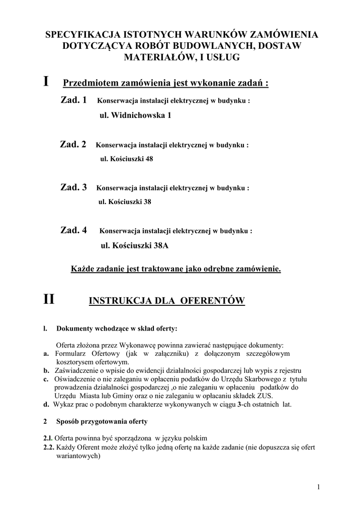 SPECYFIKACJA ISTOTNYCH WARUNKÓW ZAMÓWIENIA DOTYCZĄCYA ROBÓT BUDOWLANYCH, DOSTAW MATERIAŁÓW, I USŁUG I Przedmiotem zamówienia jest wykonanie zadań : Zad. 1 Konserwacja instalacji elektrycznej w budynku : ul. Widnichowska 1 Zad. 2 Konserwacja instalacji elektrycznej w budynku : ul. Kościuszki 48 Zad. 3 Konserwacja instalacji elektrycznej w budynku : ul. Kościuszki 38 Zad. 4 Konserwacja instalacji elektrycznej w budynku : ul. Kościuszki 38A Każde zadanie jest traktowane jako odrębne zamówienie. II l. a. b. c. d. 2 INSTRUKCJA DLA OFERENTÓW Dokumenty wchodzące w skład oferty: Oferta złożona przez Wykonawcę powinna zawierać następujące dokumenty: Formularz Ofertowy (jak w załączniku) z dołączonym szczegółowym kosztorysem ofertowym. Zaświadczenie o wpisie do ewidencji działalności gospodarczej lub wypis z rejestru Oświadczenie o nie zaleganiu w opłaceniu podatków do Urzędu Skarbowego z tytułu prowadzenia działalności gospodarczej ,o nie zaleganiu w opłaceniu podatków do Urzędu Miasta lub Gminy oraz o nie zaleganiu w opłacaniu składek ZUS. Wykaz prac o podobnym charakterze wykonywanych w ciągu 3-ch ostatnich lat. Sposób przygotowania oferty 2.l. Oferta powinna być sporządzona w języku polskim 2.2. Każdy Oferent może złożyć tylko jedną ofertę na każde zadanie (nie dopuszcza się ofert wariantowych) 1 2.3. Wymagane dokumenty należy przedstawić w formie oryginałów albo kserokopii. Dokumenty złożone w formie oryginałów muszą być parafowane. Dokumenty złożone w formie kserokopii muszą być opatrzone klauzulą „za zgodność z oryginałem" i poświadczone zgodności z oryginałem przez Oferenta. 2.4. Koszty przygotowania oferty ponosi Oferent. 2.5. W ofercie należy podać koszt i termin wykonania zamówienia dla każdego zadania jak w punkcie I SIWZ . 2.6. Termin wykonania prac : - Zad. 1 Termin wykonania 6 tygodni od daty podpisania umowy - Zad. 2 Termin wykonania 8 tygodni od daty podpisania umowy - Zad. 3 Termin wykonania 4 tygodnie od daty podpisania umowy - Zad. 4 Termin wykonania 6 tygodni od daty podpisania umowy 2.6. Ofertę należy złożyć w zaklejonej kopercie zaadresowanej na adres Zamawiającego Spółdzielnia Mieszkaniowa Lokatorsko – Własnościowa “NASZ DOM” ul. Lipowa 4 w Ostrowi Maz. z zaznaczeniem „OFERTA NA............................................................... .” Nie o otwierać przed terminem przetargu ! 3. Miejsce i termin składania oferty 3.1.Ofertę należy złożyć w siedzibie Spółdzielni Mieszkaniowej Lokatorsko Własnościowej „Nasz Dom" w Ostrowi Mazowieckiej ul Lipowa 4 (sekretariat) do dnia 19.05.2015r.do godz.1000 3.2. Oferty złożone po terminie zostaną zwrócone bez otwierania. 4. Osoby uprawnione przez Zamawiającego do kontaktu z Oferentami Osobami uprawnionymi przez Zamawiającego do kontaktu z Oferentami są pracownicy sekcji technicznej tel .(29) 7462008 wew. 51 kom. 502-149-219 ( Karol Dąbrowski) 5. Termin związania ofertą Oferent jest związany ofertą przez okres 30 dni kalendarzowych liczonych od daty składania ofert 6. Modyfikacja i wycofanie oferty 6.1. Żadna z ofert nie może być zmodyfikowana po terminie składania ofert 6.2. Modyfikacje lub wycofanie oferty, można składać wyłącznie przed upływem terminu składania ofert, w zaklejonej kopercie, oznaczonej zgodnie z punktem 2.6. z dopiskiem „Modyfikacja" lub „Wycofanie" 6.3. Modyfikacje ofert składane między terminem składania ofert i terminem związania ofertą nie będą uwzględniane. 7. Otwarcie ofert 7.1. Otwarcie ofert nastąpi w dniu 19.05.2015r.o godz.1030 w siedzibie Spółdzielni Mieszkaniowej Lokatorsko - Własnościowej „Nasz Dom” w Ostrowi Mazowieckiej ul. Lipowa 4 2 7.2. Podczas publicznego otwarcia ofert, będą odczytywane nazwa Oferenta oraz cena ofertowa. 8. Cena ofertowa 8.1 Wszystkie podatki i inne koszty, które będą opłacane przez Wykonawcę w ramach Umowy, powinny być dołączone do stawek, cen jednostkowych i uwzględnione przy obliczeniu ostatecznej ceny oferty złożonej przez Oferenta. 8.2 Wadium za każde zadanie należy wpłacić na konto spółdzielni , a ksero dowodu wpłaty dołączyć do oferty. UWAGA : Wadium należy wpłacać na konto spółdzielni PKO BP S.A O/Ostrów Maz. nr rach. 98-1020-3802-0000-1802-0007-9251 Bank Spółdzielczy Ostrów Maz. nr rach. 91-8923-0008-0000-1456-2000-0009 Zad. 1 Wadium w wysokości Zad. 2 Wadium w wysokości Zad. 3 Wadium w wysokości Zad. 4 Wadium w wysokości 1.000,00 zł PLN 1.000,00 zł PLN 1.000,00 zł PLN 1.000,00 zł PLN Dla ofert nie wybranych zwrot wadium nastąpi w terminie 7 dni roboczych od daty wyłonienia zwycięscy. 8.3 Dla wybranej oferty zwrot wadium nastąpi po podpisaniu umowy. 9. Ocena i porównanie ofert 9.1 Aby oferta mogła być uznana za ważną, powinny być spełnione następujące minimalne wymagania: - Oferta będzie kompletna ( dołączone będą wszystkie wymagane dokumenty) 9.2. Oferta powinna zawierać cenę ostateczną z podaniem cen jednostkowych i wskaźników do kosztorysowania a stwierdzone błędy arytmetyczne wykluczają ofertę o ile miałyby wpływ na zmianę ceny ostatecznej a oferent nie byłby w stanie dokonać niezwłocznej korekty w dostarczonym kosztorysie ofertowym, utrzymując cenę ostateczną. 9.3. Kryteria oceny oferty Opis kryteriów, którymi Zamawiający będzie się kierował przy wyborze ofert: - cena wykonania przedmiotu zamówienia – 100% 10. Prawo Zamawiającego do swobodnego wyboru oferty oraz do odstąpienia od przetargu lub jego unieważnienia 10.1. Zamawiający zastrzega sobie prawo do swobodnego wyboru oferty oraz prawo do odstąpienia od przetargu lub jego unieważnienia bez podania przyczyny. 10.2. Zamawiający zastrzega sobie prawo zmniejszenia lub rozszerzenia zakresu robót. 10.3. W przypadku odstąpienia od przetargu lub jego unieważnienia Zamawiający zawiadomi o tym Wykonawców biorących udział w postępowaniu . 3 10.4. Wyniki przetargu