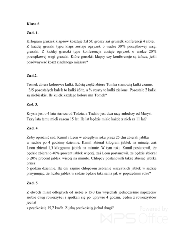 Klasa 6 Zad. 1. Kilogram gruszek klapsów kosztuje 3zł 50 groszy zaś gruszek konferencji 4 złote. Z każdej gruszki typu klaps zostaje ogryzek o wadze 30% początkowej wagi gruszki. Z każdej gruszki typu konferencja zostaje ogryzek o wadze 20% początkowej wagi gruszki. Które gruszki: klapsy czy konferencje są tańsze, jeśli porównywać koszt zjadanego miąższu? Zad.2. Tomek zbiera kolorowe kulki. Szóstą część zbioru Tomka stanowią kulki czarne, 3/5 pozostałych kulek to kulki żółte, a ¾ reszty to kulki zielone. Pozostałe 2 kulki są niebieskie. Ile kulek każdego koloru ma Tomek? Zad. 3. Krysia jest o 4 lata starsza od Tadzia, a Tadzio jest dwa razy młodszy od Marysi. Trzy lata temu mieli razem 15 lat. Ile lat będzie miało każde z nich za 11 lat? Zad. 4. Żeby opróżnić sad, Kamil i Leon w ubiegłym roku przez 25 dni zbierali jabłka w sadzie po 4 godziny dziennie. Kamil zbierał kilogram jabłek na minutę, zaś Leon zbierał 1,5 kilograma jabłek na minutę. W tym roku Kamil postanowił, że będzie zbierał o 40% procent jabłek więcej, zaś Leon postanowił, że będzie zbierał o 20% procent jabłek więcej na minutę. Chłopcy postanowili także zbierać jabłka przez 6 godzin dziennie. Ile dni zajmie chłopcom zebranie wszystkich jabłek w sadzie przyjmując, że liczba jabłek w sadzie będzie taka sama jak w poprzednim roku? Zad. 5. Z dwóch miast odległych od siebie o 150 km wyjechali jednocześnie naprzeciw siebie dwaj rowerzyści i spotkali się po upływie 4 godzin. Jeden z rowerzystów jechał z prędkością 15,2 km/h. Z jaką prędkością jechał drugi?