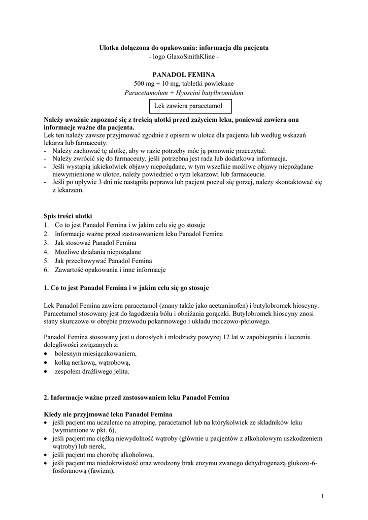 Ulotka dołączona do opakowania: informacja dla pacjenta - logo GlaxoSmithKline PANADOL FEMINA 500 mg + 10 mg, tabletki powlekane Paracetamolum + Hyoscini butylbromidum Lek zawiera paracetamol Należy uważnie zapoznać się z treścią ulotki przed zażyciem leku, ponieważ zawiera ona informacje ważne dla pacjenta. Lek ten należy zawsze przyjmować zgodnie z opisem w ulotce dla pacjenta lub według wskazań lekarza lub farmaceuty. - Należy zachować tę ulotkę, aby w razie potrzeby móc ją ponownie przeczytać. - Należy zwrócić się do farmaceuty, jeśli potrzebna jest rada lub dodatkowa informacja. - Jeśli wystąpią jakiekolwiek objawy niepożądane, w tym wszelkie możliwe objawy niepożądane niewymienione w ulotce, należy powiedzieć o tym lekarzowi lub farmaceucie. - Jeśli po upływie 3 dni nie nastąpiła poprawa lub pacjent poczuł się gorzej, należy skontaktować się z lekarzem. Spis treści ulotki 1. Co to jest Panadol Femina i w jakim celu się go stosuje 2. Informacje ważne przed zastosowaniem leku Panadol Femina 3. Jak stosować Panadol Femina 4. Możliwe działania niepożądane 5. Jak przechowywać Panadol Femina 6. Zawartość opakowania i inne informacje 1. Co to jest Panadol Femina i w jakim celu się go stosuje Lek Panadol Femina zawiera paracetamol (znany także jako acetaminofen) i butylobromek hioscyny. Paracetamol stosowany jest do łagodzenia bólu i obniżania gorączki. Butylobromek hioscyny znosi stany skurczowe w obrębie przewodu pokarmowego i układu moczowo-płciowego. Panadol Femina stosowany jest u dorosłych i młodzieży powyżej 12 lat w zapobieganiu i leczeniu dolegliwości związanych z: bolesnym miesiączkowaniem, kolką nerkową, wątrobową, zespołem drażliwego jelita. 2. Informacje ważne przed zastosowaniem leku Panadol Femina Kiedy nie przyjmować leku Panadol Femina jeśli pacjent ma uczulenie na atropinę, paracetamol lub na którykolwiek ze składników leku (wymienione w pkt. 6), jeśli pacjent ma ciężką niewydolność wątroby (głównie u pacjentów z alkoholowym uszkodzeniem wątroby) lub nerek, jeśli pacjent ma chorobę alkoholową, jeśli pacjent ma niedokrwistość oraz wrodzony brak enzymu zwanego dehydrogenazą glukozo-6fosforanową (fawizm), 1 jeśli pacjent ma miastenię (osłabienie mięśni), jeśli pacjent ma jaskrę (choroba oczu z postępującym uszkodzeniem nerwu wzrokowego), jeśli pacjent ma przerost gruczołu krokowego powodujący zatrzymywanie moczu, jeśli pacjent ma przewężenia w przewodzie pokarmowym, jeśli pacjent ma zaburzenia rytmu serca przebiegające z przyspieszeniem czynności serca. Ostrzeżenia i środki ostrożności Przed rozpoczęciem przyjmowania leku Panadol Femina pacjent powinien poinformować lekarza, jeśli: ma dolegliwości serca (zwężenie zastawki mitralnej, chorobę tętnic wieńcowych) lub ostry zawał serca, ma owrzodzenie jelit (lek może osłabiać ruchy jelit i powodować zaparcia), jeśli ma refluks żołądkowo-przełykowy (cofanie się zawartości żołądka do przełyku), inne przewlekłe zaburzenia ruchomości mięśni gładkich górnego odcinka przewodu pokarmowego lub zwężenie odźwiernika, jest w podeszłym wieku (powyżej 65 lat), ponieważ lek może powodować zaburzenia ośrodkowego układu nerwowego, suchość w jamie ustnej oraz zatrzymanie moczu (szczególnie mężczyzn), ma niewydolność wątroby i (lub) nerek, głodzi się i regularnie pije alkohol, ponieważ jest szczególnie narażony na uszkodzenie wątroby, jest uczulony na pochodne kwasu acetylosalicylowego (pochodne aspiryny), ponieważ może być również uczulony na paracetamol. Jeśli pacjent stwierdzi jakiekolwiek zaburzenia ostrości widzenia lub ból w gałce ocznej spowodowany podwyższeniem ciśnienia, powinien przerwać przyjmowanie leku i skontaktować się z lekarzem. Inne leki i Panadol Femina Należy powiedzieć lekarzowi lub farmaceucie o wszystkich lekach przyjmowanych obecnie lub ostatnio, a także o lekach, które pacjent planuje przyjmować. Niewskazane jest jednoczesne stosowanie kilku leków zawierających paracetamol, ponieważ może dojść do jego przedawkowania. Paracetamol nasila działanie leków przeciwzakrzepowych z grupy kumaryny i indandionu oraz działanie kofeiny. Przedłużone, codzienne stosowanie paracetamolu wraz z lekami przeciwzakrzepowymi może zwiększyć ryzyko krwawień; sporadyczne stosowanie leku nie ma takiego wpływu. Metoklopramid (lek przeciwwymiotny) przyspiesza, a skopolamina (stosowana w okulistyce do rozszerzania źrenicy oka) opóźnia wchłanianie paracetamolu z przewodu pokarmowego. Salicylamid (lek przeciwzapalny, przeciwgorączkowy i przeciwbólowy) wydłuża czas wydalania paracetamolu. Inhibitory MAO (leki stosowane w leczeniu depresji i choroby Parkinsona), trójpierścieniowe leki przeciwdepresyjne, chinidyna, dyzopiramid (leki przeciwarytmiczne), amantadyna (lek przeciwwirusowy, stosowany też w leczeniu choroby Parkinsona) i butyrofenon (lek przeciwpsychotyczny) stosowane razem z paracetamolem mogą wywołać stan pobudzenia i wysoką gorączkę. Ryfampicyna (antybiotyk stosowany w leczeniu gruźlicy), leki przeciwpadaczkowe, leki nasenne i alkohol stosowane z paracetamolem, mogą spowodować uszkodzenie wątroby. Paracetamol stosowany jednocześnie z niesteroidowymi lekami przeciwzapalnymi (NLPZ) (jak np. diklofenak, ibuprofen, kwas acetylosalicylowy) może nasilać chorobę nerek u pacjentów z niewydolnością nerek. 2 Butylobromek hioscyny, osłabiając ruchomość jelit i wydzielanie w przewodzie pokarmowym, może zmniejszać wchłanianie i działanie lecznicze innych równocześnie stosowanych doustnie leków. Leki z grupy zwanej antagonistami dopaminy, np. metoklopramid, mogą zmniejszać działanie leku Panadol Femina na przewód pokarmowy. Panadol Femina z alkoholem W czasie stosowania leku Panadol Femina nie należy pić alkoholu. Ciąża i karmienie piersią W ciąży i w okresie karmienia piersią lub gdy istnieje 