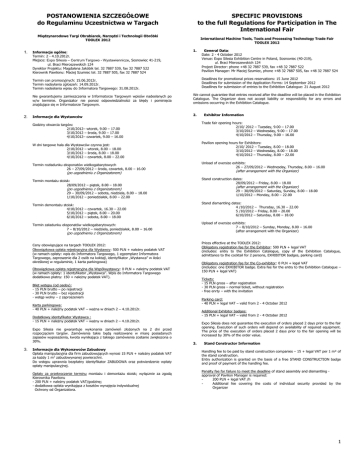 POSTANOWIENIA SZCZEGÓŁOWE do Regulaminu Uczestnictwa w Targach SPECIFIC PROVISIONS to the full Regulations for Participation in The International Fair Międzynarodowe Targi Obrabiarek, Narzędzi i Technologii Obróbki TOOLEX 2012 1. Informacje ogólne: Termin: 2 - 4.10.2012r. Miejsce: Expo Silesia – Centrum Targowo - Wystawiennicze, Sosnowiec 41-219, ul. Braci Mieroszewskich 124 Dyrektor Projektu: Magdalena Jakóbik tel. 32 7887 539, fax 32 7887 522 Kierownik Pawilonu: Maciej Szumiec tel. 32 7887 505, fax 32 7887 524 International Machine Tools, Tools and Processing Technology Trade Fair TOOLEX 2012 1. Deadlines for promotional prices reservations: 15 June 2012 Deadlines for submission of the Application Forms: 14 September 2012 Deadlines for submission of entries to the Exhibition Catalogue: 21 August 2012 Termin cen promocyjnych: 15.06.2012r. Termin nadsyłania zgłoszeń: 14.09.2012r. Termin nadesłania wpisu do Informatora Targowego: 31.08.2012r. Nie gwarantujemy zamieszczenia w Informatorze Targowym wpisów nadesłanych po w/w terminie. Organizator nie ponosi odpowiedzialności za błędy i pominięcia znajdujące się w Informatorze Targowym. 2. Informacje dla Wystawców We cannot guarantee that entries received after the deadline will be placed in the Exhibition Catalogue. The Organizer does not accept liability or responsibility for any errors and omissions occurring in the Exhibition Catalogue. 2. Pavilion opening hours for Exhibitors: 2/10/ 2012 – Tuesday, 8.00 – 18.00 3/10/2012 – Wednesday, 8.00 – 18.00 4/10/2012 – Thursday, 8.00 – 22.00 W dni targowe hala dla Wystawców czynna jest: 2/10/2012 – wtorek, 8.00 – 18.00 3/10/2012 – środa, 8.00 – 18.00 4/10/2012 – czwartek, 8.00 – 22.00 Unload of oversize exhibits: 26 – 27/09/2012 – Wednesday, Thursday, 8.00 – 16.00 Termin rozładunku eksponatów wielkogabarytowych 26 – 27/09/2012 – środa, czwartek, 8.00 – 16.00 (after arrangement with the Organizer) (po uzgodnieniu z Organizatorem) Stand construction dates: 28/09/2012 – Friday, 8.00 – 18.00 Termin montażu stoisk: 28/09/2012 – piątek, 8.00 – 18.00 (after arrangement with the Organizer) (po uzgodnieniu z Organizatorem) 29 – 30/09/2012 – Saturday, Sunday, 8.00 – 18.00 1/10/2012 – Monday, 8.00 – 22.00 29 – 30/09/2012 – sobota, niedziela, 8.00 – 18.00 1/10/2012 – poniedziałek, 8.00 – 22.00 Stand dismantling dates: 4 /10/2012 – Thursday, 16.30 – 22.00 5 /10/2012 – Friday, 8.00 – 20.00 6/10/2012 – Saturday, 8.00 – 18.00 Termin demontażu stoisk: 4/10/2012 – czwartek, 16.30 – 22.00 5/10/2012 – piątek, 8.00 – 20.00 6/10/2012 – sobota, 8.00 – 18.00 Upload of oversize exhibits: 7 – 8/10/2012 – Sunday, Monday, 8.00 – 16.00 (after arrangement with the Organizer) Termin załadunku eksponatów wielkogabarytowych: 7 – 8/10/2012 – niedziela, poniedziałek, 8.00 – 16.00 (po uzgodnieniu z Organizatorem) Prices effective at the TOOLEX 2012: Obligatory registration fee for the Exhibitor: 500 PLN + legal VAT (includes: entry to the Exhibition Catalogue, copy of the Exhibition Catalogue, admittance to the cocktail for 2 persons, EXHIBITOR badges, parking card) Ceny obowiązujące na targach TOOLEX 2012: Obowiązkowa opłata rejestracyjna dla Wystawcy: 500 PLN + należny podatek VAT (w ramach opłaty: wpis do Informatora Targowego, 1 egzemplarz Informatora Targowego, zaproszenie dla 2 osób na koktajl, identyfikator „Wystawca” w ilości określonej w regulaminie, 1 karta parkingowa) Obligatory registration fee for the Co-exhibitor: 0 PLN + legal VAT (includes: one EXHIBITOR badge. Extra fee for the entry to the Exhibition Catalogue – 150 PLN + legal VAT) Obowiązkowa opłata rejestracyjna dla Współwystawcy: 0 PLN + należny podatek VAT (w ramach opłaty: 1 identyfikator „Wystawca”. Wpis do Informatora Targowego dodatkowo płatny: 150 + należny podatek VAT). Tickets: - 15 PLN gross – after registration - 30 PLN gross – normal ticket, without registration - free enrty – with the invitation Bilet wstępu (od osoby): - 15 PLN brutto – po rejestracji - 30 PLN brutto – bez rejestracji - wstęp wolny – z zaproszeniem Parking card: - 40 PLN + legal VAT – valid from 2 - 4 October 2012 Karta parkingowa: - 40 PLN + należny podatek VAT – ważna w dniach 2 – 4.10.2012r. Additional Exhibitor badges: - 15 PLN + legal VAT – valid from 2 - 4 October 2012 Dodatkowy identyfikator Wystawca : - 15 PLN + należny podatek VAT – ważny w dniach 2 – 4.10.2012r. 3. Informacje dla Wykonawców Zabudowy Opłata manipulacyjna dla firm zabudowujących wynosi 15 PLN + należny podatek VAT za każdy 1 m2 zabudowywanej powierzchni. Do wstępu uprawnia bezpłatny identyfikator ZABUDOWA oraz potwierdzenie wpłaty opłaty manipulacyjnej. Opłaty za przekroczenie terminu montażu i demontażu stoisk; wyłącznie za zgodą Kierownika Pawilonu - 200 PLN + należny podatek VAT/godzinę; - dodatkowa opłata wynikająca z kosztów wynajęcia indywidualnej Ochrony od Organizatora. Exhibitor Information Trade fair opening hours: 2/10/ 2012 – Tuesday, 9.00 – 17.00 3/10/2012 – Wednesday, 9.00 – 17.00 4/10/2012 – Thursday, 9.00 – 16.00 Godziny otwarcia targów: 2/10/2012– wtorek, 9.00 – 17.00 3/10/2012 – środa, 9.00 – 17.00 4/10/2012– czwartek, 9.00 – 16.00 Expo Silesia nie gwarantuje wykonania zamówień złożonych na 2 dni przed rozpoczęciem targów. Zamówienia takie będą realizowane w miarę posiadanych zapasów wyposażenia, kwota wynikająca z takiego zamówienia zostanie zwiększona o 30%. General Data: Date: 2 - 4 October 2012 Venue: Expo Silesia Exhibition Centre in Poland, Sosnowiec (40-219), ul. Braci Mieroszewskich 124 Project Director: phone +48 32 7887 539, fax +48 32 7887 522 Pavilion Manager: Mr Maciej Szumiec, phone +48 32 7887 505, fax +48 32 7887 524 Expo Silesia does not guarantee the execution of orders placed 2 days prior to the fair opening. Execution of 