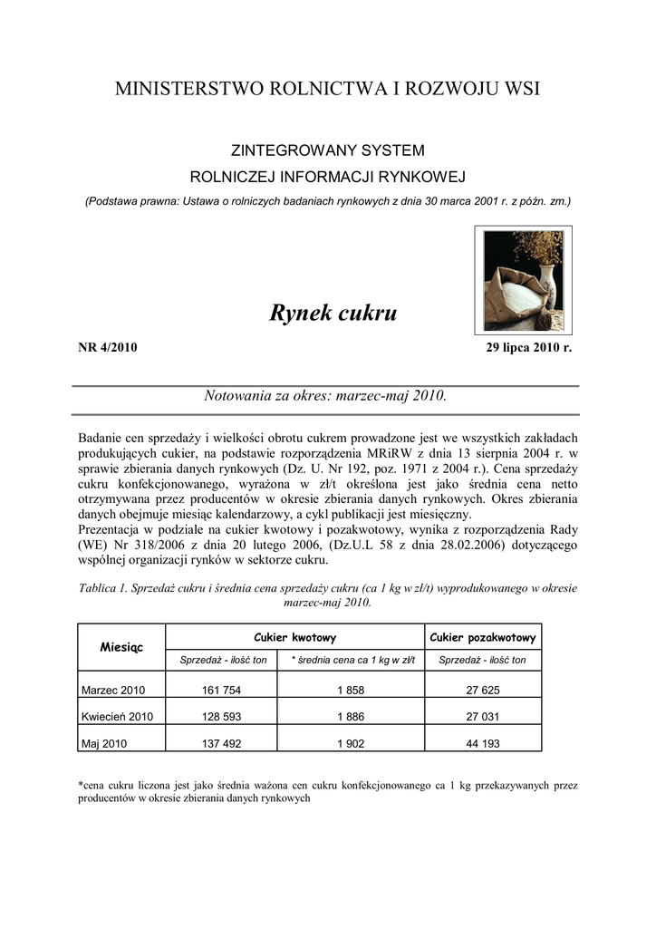 MINISTERSTWO ROLNICTWA I ROZWOJU WSI ZINTEGROWANY SYSTEM ROLNICZEJ INFORMACJI RYNKOWEJ (Podstawa prawna: Ustawa o rolniczych badaniach rynkowych z dnia 30 marca 2001 r. z późn. zm.) Rynek cukru NR 4/2010 29 lipca 2010 r. Notowania za okres: marzec-maj 2010. Badanie cen sprzedaży i wielkości obrotu cukrem prowadzone jest we wszystkich zakładach produkujących cukier, na podstawie rozporządzenia MRiRW z dnia 13 sierpnia 2004 r. w sprawie zbierania danych rynkowych (Dz. U. Nr 192, poz. 1971 z 2004 r.). Cena sprzedaży cukru konfekcjonowanego, wyrażona w zł/t określona jest jako średnia cena netto otrzymywana przez producentów w okresie zbierania danych rynkowych. Okres zbierania danych obejmuje miesiąc kalendarzowy, a cykl publikacji jest miesięczny. Prezentacja w podziale na cukier kwotowy i pozakwotowy, wynika z rozporządzenia Rady (WE) Nr 318/2006 z dnia 20 lutego 2006, (Dz.U.L 58 z dnia 28.02.2006) dotyczącego wspólnej organizacji rynków w sektorze cukru. Tablica 1. Sprzedaż cukru i średnia cena sprzedaży cukru (ca 1 kg w zł/t) wyprodukowanego w okresie marzec-maj 2010. Cukier kwotowy Miesiąc Cukier pozakwotowy Sprzedaż - ilość ton * średnia cena ca 1 kg w zł/t Sprzedaż - ilość ton Marzec 2010 161 754 1 858 27 625 Kwiecień 2010 128 593 1 886 27 031 Maj 2010 137 492 1 902 44 193 *cena cukru liczona jest jako średnia ważona cen cukru konfekcjonowanego ca 1 kg przekazywanych przez producentów w okresie zbierania danych rynkowych Wielkość sprzedaży cukru w badanych zakładach w 2010 roku 161 754 170 000 115 679 137 492 128 593 112 904 120 000 70 000 44 193 27 625 20 082 7 952 27 031 20 000 -30 000 styczeń luty marzec Cukier kw otow y kw iecień maj Cukier pozakw otow y Średnia cena cukru konfekcjonowanego (1 kg) w zł/t w latach 2008 - 2010 w badanych zakładach. [zł/t] 3 000 2 965 2 900 2 871 2 800 2 700 2 635 2 600 2 615 2 547 2 500 2 400 2 481 2 358 2 200 2 306 2 321 2 300 2 216 2 209 2 109 2 100 2 000 2 112 2 027 1 994 2 082 2 035 1 985 1 953 1 975 1 900 2 2 223 198 2 163 1 870 2008 2009 gr ud zi eń li s to pa d pa źd zi er ni k w rz es ie ń si er pi eń li p ie c cz er w ie c m aj kw ie ci eń m ar ze c lu ty st yc ze ń 1 800 2010 Wydawca: Ministerstwo Rolnictwa i Rozwoju Wsi Departament Rynków Rolnych Wydział Informacji Rynkowej i Statystyki Rolnej ul. Wspólna 30, 00-930 Warszawa tel. (0-22) 623-14-07, fax (0-22) 623-27-06 Autor: Marta Wróblewska , e-mail : [email protected] 2