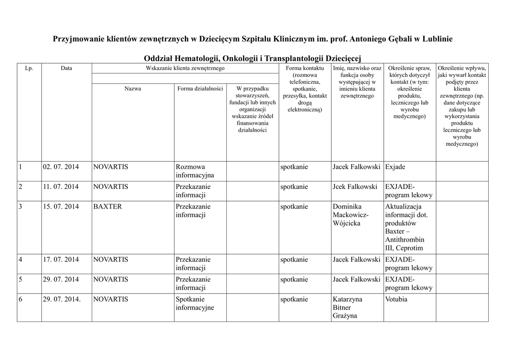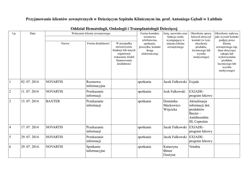 Przyjmowanie klientów zewnętrznych w Dziecięcym Szpitalu Klinicznym im. prof. Antoniego Gębali w Lublinie Oddział Hematologii, Onkologii i Transplantologii Dziecięcej Lp. Data Wskazanie klienta zewnętrznego Nazwa Forma działalności W przypadku stowarzyszeń, fundacji lub innych organizacji wskazanie źródeł finansowania działalności Forma kontaktu (rozmowa telefoniczna, spotkanie, przesyłka, kontakt drogą elektroniczną) Imię, nazwisko oraz funkcja osoby występującej w imieniu klienta zewnętrznego Określenie spraw, których dotyczył kontakt (w tym: określenie produktu, leczniczego lub wyrobu medycznego) 1 02. 07. 2014 NOVARTIS Rozmowa informacyjna spotkanie Jacek Falkowski Exjade 2 11. 07. 2014 NOVARTIS Przekazanie informacji spotkanie Jcek Falkowski EXJADEprogram lekowy 3 15. 07. 2014 BAXTER Przekazanie informacji spotkanie Dominika MackowiczWójcicka Aktualizacja informacji dot. produktów Baxter – Antithrombin III, Ceprotim 4 17. 07. 2014 NOVARTIS Przekazanie informacji spotkanie Jacek Falkowski EXJADEprogram lekowy 5 29. 07. 2014 NOVARTIS Przekazanie informacji spotkanie Jacek Falkowski EXJADEprogram lekowy 6 29. 07. 2014. NOVARTIS Spotkanie informacyjne spotkanie Katarzyna Bitner Grażyna Votubia Określenie wpływu, jaki wywarł kontakt podjęty przez klienta zewnętrznego (np. dane dotyczące zakupu lub wykorzystania produktu leczniczego lub wyrobu medycznego) DzikielewskaBeranek 7 11. 09. 2014. NOVARTIS Spotkanie informacyjne spotkanie Jacek Falkowski Program terapeutyczny dotyczący nadmiaru żelaza w organiźmie 8 11.09. 2014 MSD Spotkanie inforamacyjne Spotkanie Małgorzata Tomkiewicz, Ewa Engelgarot Eryk Kamiński 9 11. 09. 2014 NOVARTIS Spotkanie informacyjne spotkanie Jacek Falkowski Program terapeutyczny – nadmiar żelaza w organiźmie 10 15. 09. 2014 PFIZER POLSKA Spotkanie informacyjne spotkanie Kamil Stepuch 11 16. 09. 2014. NOVARTIS Spotkanie informacyjne spotkanie Jacek Falkowski EXJADEprogram terapeutyczny 12 08. 10. 2014 NOVARTIS prezentacja spotkanie Jacek Falkowski EXJADE – program lekowy 13 03. 11. 2014 PFIZER POLSKA Spotkanie informacyjne spotkanie Dorota Cichocka Nowe wskazania leku ECALTA. 14 12. 11. 2014. VALENTIS POLSKA prezentacja spotkanie Jakub Olchowy Profilaktyka i leczenie inwazyjnych zakażeń grzybiczych – leki Cancidas, Noxafil Program lekowy leczenia krwawień u dzieci z hemofilią Preparat Miramile Tonsil – 7 olejków na gardło. Klinika Otolaryngologii dziecięcej, Foniatrii i Audiologii Lp. Data Wskazanie klienta zewnętrznego Nazwa Forma działalności W przypadku stowarzyszeń, fundacji lub innych organizacji wskazanie źródeł finansowania działalności _ 1 6.10.2014 Sequoia Przedstawiciel firmy farmaceutycznej 2 28.10.2014 GSK Przedstawiciel firmy farmaceutycznej 3 12.11.2014 Valentis Polska Przedstawiciel _ _ Forma kontaktu (rozmowa telefoniczna, spotkanie, przesyłka, kontakt drogą elektroniczną) Imię, nazwisko oraz funkcja osoby występującej w imieniu klienta zewnętrznego Określenie spraw, których dotyczył kontakt (w tym: określenie produktu, leczniczego lub wyrobu medycznego) spotkanie Paulina SerwejukGawłowska spotkanie Krzysztof Siekierski Prezantacja preparatów: Avamys, Ismigen, Augmentin, Zinnat spotkanie Karolina Prezentacja Określenie wpływu, jaki wywarł kontakt podjęty przez klienta zewnętrznego (np. dane dotyczące zakupu lub wykorzystania produktu leczniczego lub wyrobu medycznego) Prezentacja preparatów: Entitis, Omegamed, Sambucol, Solbaby _ - - firmy farmaceutycznej 4 22.12.2014 Tactica Pharmaceuticals Przedstawiciel firmy farmaceutycznej _ spotkanie Niezabitowska Jakub Olszowy preparatu Miramile Tonsil Andrzej Koszałka Prezentacja preparatów: Cetraxal, Larimax, Isonasin - Klinik Pediatrii i Nefrologii ze Stacją Dializ Lp. Data Wskazanie klienta zewnętrznego Nazwa 1. 18.09.2014. Forma działalności W przypadku stowarzyszeń, fundacji lub innych organizacji wskazanie źródeł finansowania działalności Apotex Polska Sp. z o.o. Forma kontaktu (rozmowa telefoniczna, spotkanie, przesyłka, kontakt drogą elektroniczną) osobista Imię, nazwisko oraz funkcja osoby występującej w imieniu klienta zewnętrznego Określenie spraw, których dotyczył kontakt (w tym: określenie produktu, leczniczego lub wyrobu medycznego) Określenie wpływu, jaki wywarł kontakt podjęty przez klienta zewnętrznego (np. dane dotyczące zakupu lub wykorzystania produktu leczniczego lub wyrobu medycznego) Patrycja Prezentacja Ciechan-Gotner produktu Apo przedstwiciel Doxan firmy Apotex Polska Sp. z o.o. Zakład Diagnostyki Obrazowej Lp. Data Wskazanie klienta zewnętrznego Nazwa Forma działalności W przypadku stowarzyszeń, fundacji lub innych organizacji wskazanie źródeł finansowania działalności Forma kontaktu (rozmowa telefoniczna, spotkanie, przesyłka, kontakt drogą elektroniczną) Imię, nazwisko oraz funkcja osoby występującej w imieniu klienta zewnętrznego Określenie spraw, których dotyczył kontakt (w tym: określenie produktu, leczniczego lub wyrobu medycznego) Określenie wpływu, jaki wywarł kontakt podjęty przez klienta zewnętrznego (np. dane dotyczące zakupu lub wykorzystania produktu leczniczego lub wyrobu medycznego) 1 5.XII.2014 Ado-Med spotkanie Marcin Mikosz Potrzeby technologiczne w ultrasonografii pediatrycznej 2 18.XII.2014 Ado-Med spotkanie Marcin Mikosz Potrzeby technologiczne w ultrasonografii pediatrycznej 3 9.XII.2014 Bracco Imaging Polska Sp. Z o.o. spotkanie Tomasz Kniewski Współpraca dotycząca kontrastów Oddział Neurologii Dziecięcej Lp. 1 Data 27.10.2014 Wskazanie klienta zewnętrznego Nazwa Forma działalności W przypadku stowarzyszeń, fundacji lub innych organizacji wskazanie źródeł finansowania działalności Neuropharm Producent Kontakt osobisty Forma kontaktu (rozmowa telefoniczna, spotkanie, przesyłka, kontakt drogą elektroniczną) Imię, nazwisko oraz funkcja osoby występującej w imieniu klienta zewnętrznego Określenie spr