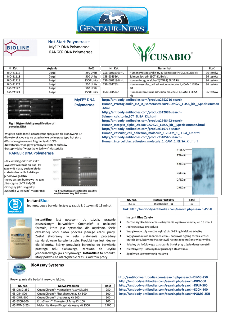 Hot-Start Polymerases MyFi™ DNA Polymerase RANGER DNA Polymerase Nr. Kat. BIO-21117 BIO-21118 BIO-21119 BIO-21121 BIO-21122 BIO-21123 stężenie 2u/µl 2u/µl 2u/µl 4u/µl 4u/µl 4u/µl Ilość 250 Units 500 Units 2500 Units 250 Units 500 Units 2500 Units MyFi™ DNA Polymerase -Wiąksza dokładność, opracowana specjalnie dla klonowania TA -Nowatorska, oparta na przeciwciele polimeraza typu hot start -Wzmacnia genomowe fragmenty do 10KB -Nowatorski, wiodący w przemyśle system buforów -Dostępny jako ”wszystko w jednym”MasterMix Nr. Kat. CSB-EL018969HU CSB-E08526s CSB-EL011864HU CSB-E04753h CSB-E04574h Numer kat. Human Prostaglandin-H2 D-isomerase(PTGDS) ELISA kit Salmon Secretin (SCT) ELISA kit Human Integrin alpha-2(ITGA2) ELISA kit Human vascular_cell adhesion molecule 1,VCAM 1 ELISA Kit Human intercellular adhesion molecule 1,ICAM-1 ELISA Kit Ilość 96 testów 96 testów 96 testów 96 testów 96 testów http://antibody-antibodies.com/product2652710-searchHuman_Prostaglandin_H2_D_isomerase%28PTGDS%29_ELISA_kit__SpeciesHuman .html http://antibody-antibodies.com/product312089-searchSalmon_calcitonin,SCT_ELISA_Kit.html http://antibody-antibodies.com/product2648492-searchHuman_Integrin_alpha_2%28ITGA2%29_ELISA_kit__SpeciesHuman.html http://antibody-antibodies.com/product310717-searchHuman_vascular_cell_adhesion_molecule_1,VCAM_1_ELISA_Kit.html http://antibody-antibodies.com/product310540-searchHuman_intercellular_adhesion_molecule_1,ICAM_1_ELISA_Kit.html RANGER DNA Polymerase - daleki zasięg od 10 do 25KB -wyższaw wierność niź Taq, by zapewnić niższy poziom błędu - zatwierdzona dla ludzkiego genomowego DNA - nowy system buforowy , w tym ultra-czyste dNTP i MgCl2 -Dostępny jako wygodny „wszystko w jednym” Master mix Nr. Kat. ISB1L InstantBlue Jednoetapowe barwienie żelu w czasie krótszym niż 15 minut. Nazwa Produktu InstantBlue - 1L Ilość 1L Link: http://antibody-antibodies.com/search.php?search=ISB1L InstantBlue jest gotowym do użycia, prawnie zastrzeżonym barwnikiem Coomasie® o unikalnej formule, która jest optymalna dla uzyskania ściśle określonej ilości białka podczas jednego etapu pracy. Został stworzony w celu ułatwienia procedury standardowego barwienia żelu. Produkt ten jest idealny dla klientów, którzy poszukują barwnika do barwienia prostego żelu białkowego, zarówno do użytku jendorazowego jak i rutynowego. InstantBlue to produkt, który pozwoli na oszczędzenie czasu i kosztów pracy. Instant Blue Zalety Bardzo szybkie barwienie – otrzymanie wyników w mniej niż 15 minut. Jednoetapowa procedura Wyjątkowo czuły – może wykryć ok. 5-25 ng białek na ściężkę. Wyjątkowo niskie zabarwienie tła – poprawia ogólną rozdzielczość i czułość żelu, który można zostawić na czas nieokreślony w barwniku. Idealny do ilościowego oznaczania białek przy użyciu densytometrii. Nietoksyczny – idealnydo regularnego stosowania. Zgodny ze spektrometrią masową BioAssay Systems Rozwiązania dla badań i rozwoju leków. Nr. Kat. 65-DIMG-250 65-DIPI-500 65-DIUR-500 65-ECCH-100 65-POMG-25H Nazwa Produktu QuantiChrom™ Magnesium Assay Kit 250 QuantiChrom™ Phosphate Assay Kit 500 QuantiChrom™ Urea Assay Kit 500 EnzyChrom™ Cholesterol Assay Kit 100 Malachite Green Phosphate Assay Kit 2500 Ilość 250 500 500 100 2500 http://antibody-antibodies.com/search.php?search=DIMG-250 http://antibody-antibodies.com/search.php?search=DIPI-500 http://antibody-antibodies.com/search.php?search=DIUR-500 http://antibody-antibodies.com/search.php?search=ECCH-100 http://antibody-antibodies.com/search.php?search=POMG-25H *Zapytania odnośnie cen produktów oraz wszelkie inne wątpliwości prosimy kierować na nasz adres mailowy: [email protected].
