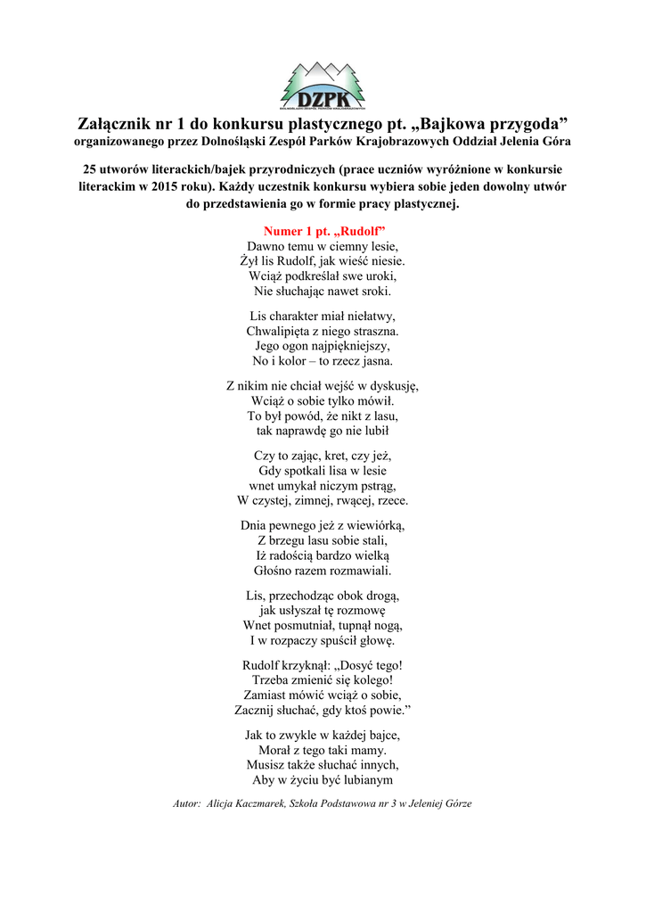 Załącznik nr 1 do konkursu plastycznego pt. „Bajkowa przygoda” organizowanego przez Dolnośląski Zespół Parków Krajobrazowych Oddział Jelenia Góra 25 utworów literackich/bajek przyrodniczych (prace uczniów wyróżnione w konkursie literackim w 2015 roku). Każdy uczestnik konkursu wybiera sobie jeden dowolny utwór do przedstawienia go w formie pracy plastycznej. Numer 1 pt. „Rudolf” Dawno temu w ciemny lesie, Żył lis Rudolf, jak wieść niesie. Wciąż podkreślał swe uroki, Nie słuchając nawet sroki. Lis charakter miał niełatwy, Chwalipięta z niego straszna. Jego ogon najpiękniejszy, No i kolor – to rzecz jasna. Z nikim nie chciał wejść w dyskusję, Wciąż o sobie tylko mówił. To był powód, że nikt z lasu, tak naprawdę go nie lubił Czy to zając, kret, czy jeż, Gdy spotkali lisa w lesie wnet umykał niczym pstrąg, W czystej, zimnej, rwącej, rzece. Dnia pewnego jeż z wiewiórką, Z brzegu lasu sobie stali, Iż radością bardzo wielką Głośno razem rozmawiali. Lis, przechodząc obok drogą, jak usłyszał tę rozmowę Wnet posmutniał, tupnął nogą, I w rozpaczy spuścił głowę. Rudolf krzyknął: „Dosyć tego! Trzeba zmienić się kolego! Zamiast mówić wciąż o sobie, Zacznij słuchać, gdy ktoś powie.” Jak to zwykle w każdej bajce, Morał z tego taki mamy. Musisz także słuchać innych, Aby w życiu być lubianym Autor: Alicja Kaczmarek, Szkoła Podstawowa nr 3 w Jeleniej Górze Numer 2 pt. „Nietoperek Franek” W pewnej polskiej wiosce, koło Jeleniej Góry, mieszkała grupa nietoperzy. Najmłodszym jej członkiem był zawsze optymistyczny Franek. Lubił on figle, zabawy, a jego ulubionym jedzeniem były świeżutkie żuczki. Franek musiał się często przeprowadzać, ponieważ ludzie nie lubili nietoperzy, choć są one bardzo pożyteczne, bo żywią się owadami. Pewnego razu kolonia została wygnana z najlepszej jak dotąd siedziby. Nietoperze przez miesiąc latały i latały w desperackich poszukiwaniach własnego lokum. W końcu znalazły piękną jaskinię. Niestety, miała ona już swoich lokatorów. Samiecprzywódca zdecydował, że trzeba walczyć. Starcie miało odbyć się za dwa dni. Mały Franek nie mógł znieść myśli, że trzeba będzie zabrać komuś dom żeby samemu go mieć. Poleciał więc na poszukiwania miejsca do zamieszkania. Następnego dnia znalazł obiecującą lokalizację, była to stara, opuszczona rudera. Franek wleciał do środka i się rozejrzał. Pomyślał, że to idealne miejsce do zamieszkania ponieważ miało wspaniały, drewniany, sufit do którego nietoperze będą mogły z łatwością przytwierdzić się pazurkami i zawisnąć głową w dół. Malec ekspresem poleciało swojej grupy aby poinformować ją o wspaniałym znalezisku. Powiedział z entuzjazmem: - „Słuchajcie, słuchajcie nie trzeba będzie walczyć. Znalazłem idealne miejsce do osiedlenia się na stałe”. Wszystkie nietoperze poleciały do owego idealnego miejsca aby mu się przyjrzeć. Kiedy tam dotarli ssaki zaczęły kręcić nosem. Zapanowało oburzenie na lokum pod pretekstem brzydkiego zapachu. Wszystkie nietoperze, oprócz rodziny Franka, odleciały na przygotowania do bitwy. Tymczasem Franek i jego rodzina zaczęli się zadamawiać w nowym domku. Nagle rozległ się okrzyk zachwytu – za domem, starym, i brzydkim, tata Franka znalazł przecudny ogród. Rosło tam wiele gatunków kwiatów, krzewów, a na samym środku rosła ogromna czereśnia z pięknymi różowo-białymi kwiatkami. Było oczywiste, że to wprost raj na ziemi pełen nie tylko wyjątkowych roślin ale i smakowitych owadów. A idealnym miejscem do spania były gęste gałęzie ogromnego drzewa. Przez „Tajemniczy ogród” ( bo tak nazwał to miejsce Franek) przebiegała kręta, brukowa ścieżka. Było tam też mnóstwo starych zabawek, a wśród nich ulubiona zabawka małego nietoperza, czyli piłka. Bardzo lubił się nią bawić zamykając oczy i używając swojej echolokacji turlać ją do bramki, którą stanowiły różne przedmioty. Następnego dnia Franek wraz z rodzicami polecieli zobaczyć kto wygrał bitwę. Widok pola walki był makabryczny – wszędzie leżały martwe ciała ich przyjaciół. Mora z tego taki – że’ Białego kruka darmo nietoperz szuka”. Autor: Alicja Hubert Żojdzik, Szkoła Podstawowa nr 3 w Lwówku Śląskim Numer 3 pt. „W dolnośląskim, gęstym borze...” W dolnośląskim, gęstym borze, A dokładnie w lisiej norze, Odbywała się biesiada- wielka impra, maskarada. Tu spotkały się – Lisica, pani borsuk, niedźwiedzica, Był też dzik, całkiem zdziczały, Wszystkie sowy z niego piały. Salamandra i ropucha Nastawiały tylko ucha I słuchały słów rzekotki, Bo ma z pierwszej ręki plotki: Ponoć tak pogłoska niesie, Że jest skarb ukryty w lesie. Jak to kuny usłyszały, Prawie się pozagryzały. Jak się zaczął wyścig szczurów, Chciwców oraz wielkich gburów. Pędzą na złamanie karku, By odnaleźć złoto w garnku. Locha szlocha – - jest na końcu, Jeleń pędzi w pełnym słońcu Lecz wyprzedził go jeż mały, Choć mu prawie wyszły gały. A Tchórz stchórzył i powiedział, Że pod drzewem będzie siedział. Bóbr wyciął orła jak długi, No i niestety był drugi. A pierwsza byłą lisica, bo to jest cwana samica. Znalazła w końcu te krzaki, gdzie miał być skarb. Ale jaki? I pcha tam łapy nachalni. I jak ją nagle coś palnie! Piecze i boli ją łapa, to żmija zygzakowata. I zamiast skarbu, cwaniara Dostała rejs do szpitala. Z tego morał taki: Nie pchaj łapy w gęste krzaki. Autor: Miłosz Ogonowski, Szkoła Podstawowa we Włodzicach Wielkich Numer 4 pt. „Pies i kot” W żółtym domu z białym płotem, mieszkał sobie piesek z kotem. I choć wszyscy z tego drwili, oni bardzo się lubili. Aż raz zbiegła się gromada: „Pies i kot razem !- to nie wypada.” I wciąż kota namawiali, by od pieska się oddalił. A więc kot, nie myśląc wiele, rzecze do n