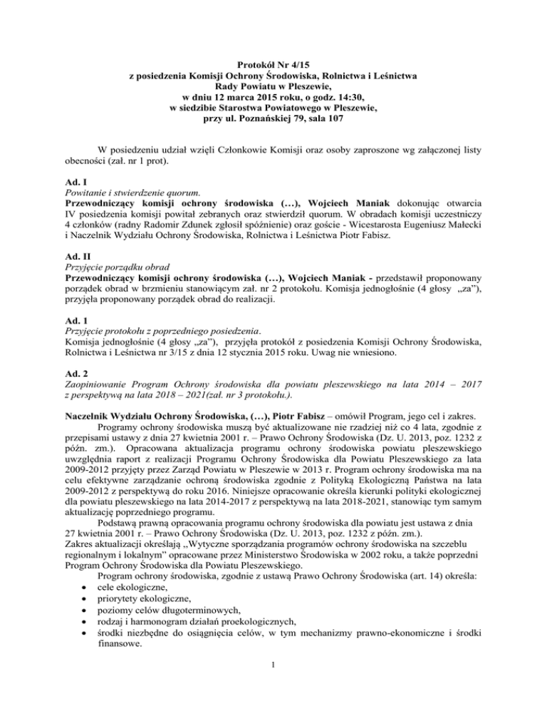 Protokół Nr 4/15 z posiedzenia Komisji Ochrony Środowiska, Rolnictwa i Leśnictwa Rady Powiatu w Pleszewie, w dniu 12 marca 2015 roku, o godz. 14:30, w siedzibie Starostwa Powiatowego w Pleszewie, przy ul. Poznańskiej 79, sala 107 W posiedzeniu udział wzięli Członkowie Komisji oraz osoby zaproszone wg załączonej listy obecności (zał. nr 1 prot). Ad. I Powitanie i stwierdzenie quorum. Przewodniczący komisji ochrony środowiska (…), Wojciech Maniak dokonując otwarcia IV posiedzenia komisji powitał zebranych oraz stwierdził quorum. W obradach komisji uczestniczy 4 członków (radny Radomir Zdunek zgłosił spóźnienie) oraz goście - Wicestarosta Eugeniusz Małecki i Naczelnik Wydziału Ochrony Środowiska, Rolnictwa i Leśnictwa Piotr Fabisz. Ad. II Przyjęcie porządku obrad Przewodniczący komisji ochrony środowiska (…), Wojciech Maniak - przedstawił proponowany porządek obrad w brzmieniu stanowiącym zał. nr 2 protokołu. Komisja jednogłośnie (4 głosy „za”), przyjęła proponowany porządek obrad do realizacji. Ad. 1 Przyjęcie protokołu z poprzedniego posiedzenia. Komisja jednogłośnie (4 głosy „za”), przyjęła protokół z posiedzenia Komisji Ochrony Środowiska, Rolnictwa i Leśnictwa nr 3/15 z dnia 12 stycznia 2015 roku. Uwag nie wniesiono. Ad. 2 Zaopiniowanie Program Ochrony środowiska dla powiatu pleszewskiego na lata 2014 – 2017 z perspektywą na lata 2018 – 2021(zał. nr 3 protokołu.). Naczelnik Wydziału Ochrony Środowiska, (…), Piotr Fabisz – omówił Program, jego cel i zakres. Programy ochrony środowiska muszą być aktualizowane nie rzadziej niż co 4 lata, zgodnie z przepisami ustawy z dnia 27 kwietnia 2001 r. – Prawo Ochrony Środowiska (Dz. U. 2013, poz. 1232 z późn. zm.). Opracowana aktualizacja programu ochrony środowiska powiatu pleszewskiego uwzględnia raport z realizacji Programu Ochrony Środowiska dla Powiatu Pleszewskiego za lata 2009-2012 przyjęty przez Zarząd Powiatu w Pleszewie w 2013 r. Program ochrony środowiska ma na celu efektywne zarządzanie ochroną środowiska zgodnie z Polityką Ekologiczną Państwa na lata 2009-2012 z perspektywą do roku 2016. Niniejsze opracowanie określa kierunki polityki ekologicznej dla powiatu pleszewskiego na lata 2014-2017 z perspektywą na lata 2018-2021, stanowiąc tym samym aktualizację poprzedniego programu. Podstawą prawną opracowania programu ochrony środowiska dla powiatu jest ustawa z dnia 27 kwietnia 2001 r. – Prawo Ochrony Środowiska (Dz. U. 2013, poz. 1232 z późn. zm.). Zakres aktualizacji określają ,,Wytyczne sporządzania programów ochrony środowiska na szczeblu regionalnym i lokalnym” opracowane przez Ministerstwo Środowiska w 2002 roku, a także poprzedni Program Ochrony Środowiska dla Powiatu Pleszewskiego. Program ochrony środowiska, zgodnie z ustawą Prawo Ochrony Środowiska (art. 14) określa: cele ekologiczne, priorytety ekologiczne, poziomy celów długoterminowych, rodzaj i harmonogram działań proekologicznych, środki niezbędne do osiągnięcia celów, w tym mechanizmy prawno-ekonomiczne i środki finansowe. 1 Poprzedni Program „Ochrony Środowiska…..” obowiązywał w latach 2009-2012 i zapadła decyzja o jego kontynuacji na kolejne lata tj. 2014-2017. Rozpoznano rynek pod względem wyboru firmy, która opracowałaby program. Wybrano firmę „EKOLOG” Sp. z o.o. z Poznania, która za kwotę 4.920 zł brutto opracowała niniejszy program. Oferty innych firm zdecydowanie odbiegały od wybranej. Wybrana oferta jest idealnym połączeniem jakości i ceny. Firma trzykrotnie podpisywała z powiatem aneks o przedłużenie umowy, gdyż do opracowania każdego programu, planów i innych tego typu analiz należy w pierwszej kolejności przygotować analizę ochrony środowiska i dlatego cała procedura przedłużyła się do 2015 r. W związku z tym uchwała dot. niniejszego programu będzie uchwalana z datą wsteczną. Sam program musiał być wysłany do zaopiniowania do Marszałka Województwa i tak uchwałą Zarządu Województwa Wielkopolskiego nr 250/2015 program został zaopiniowany pozytywnie. Program został także przedstawiony Zarządowi Powiatu w Pleszewie i także został przyjęty, w chwili obecnej przedstawiany jest Komisji Ochrony Środowiska, (…), a następnie będzie poddawany pod głosowanie na najbliższej sesji Rady Powiatu, 20 marca 2015 r. Opracowany Program odnosi się do dokumentów krajowych i wojewódzkich. Najistotniejszym dokumentem, który stanowi podstawę opracowania Programu ochrony środowiska, jest ,,Polityka Ekologiczna Państwa w latach 2009 - 2012 z perspektywą do roku 2016”. Dokumentem szczebla wojewódzkiego jest ,,Zaktualizowana strategia rozwoju województwa wielkopolskiego do 2020 r.”, która określa wytyczne do opracowania Programu ochrony środowiska. Dokumentem szczebla powiatowego jest ,,Strategia rozwoju powiatu pleszewskiego na lata 2007 - 2015” oraz ,,Raport z realizacja Programu Ochrony Środowiska dla powiatu pleszewskiego za lata 2009 - 2012”. Przedstawiono w nim ile zadań z zaplanowanych w Programie na lata 2009-2012 zostało zrealizowanych. Wiceprzewodniczący Komisji Ochrony Środowiska (…), Piotr Świderski – zapytał, czy zadania, które nie zostały zrealizowane w poprzednim Programie, będą realizowane w obecnym? Wicestarosta Pleszewski, Eugeniusz Małecki – odpowiedział, że zadania te nie dotyczą powiatu np. stawy rybne. Naczelnik Wydziału Ochrony Środowiska (…), Piotr Fabisz – przedstawił kolejne części programu strategii dot. ochrony dziedzictwa przyrodniczego, w tym ochrony przyrody i krajobrazu, zrównoważonego rozwoju lasów, ochrony powierzchni ziemi, zasobów kopalin i wód podziemnych oraz kształtowanie stosunków wodnych i ochrona przed powodzią (rozdział 4 Programu). Kolejny rozdział omawia temat poprawy jakości środowiska w tym jakości wody, racjonalną gospodarkę odpadami, jakość powietrza, poważne awarie pr