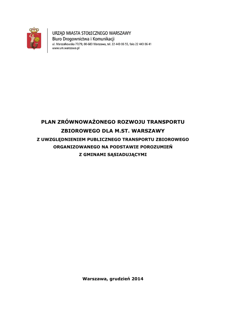 PLAN ZRÓWNOWAŻONEGO ROZWOJU TRANSPORTU ZBIOROWEGO DLA M.ST. WARSZAWY Z UWZGLĘDNIENIEM PUBLICZNEGO TRANSPORTU ZBIOROWEGO ORGANIZOWANEGO NA PODSTAWIE POROZUMIEŃ Z GMINAMI SĄSIADUJĄCYMI Warszawa, grudzień 2014 „Plan zrównoważonego rozwoju transportu zbiorowego dla m.st. Warszawy (…)” został przygotowany przez pracowników Biura Drogownictwa i Komunikacji oraz Zarządu Transportu Miejskiego. 2 SPIS TREŚCI 1. Cele i metodologia tworzenia planu transportowego 2. Determinanty rozwoju sieci publicznego transportu zbiorowego 2.1. Dokumenty strategiczne 2.2. Charakterystyka ogólna 2.3. Czynniki demograficzne i społeczne 2.4. Struktura ludności i ruch naturalny 2.5. Założenia demograficzno-społeczne 2.6. Czynniki gospodarcze 2.7. Zagospodarowanie przestrzenne i motoryzacja 2.8. Ochrona środowiska naturalnego 2.9. Infrastruktura transportowa 3. Ocena i prognoza potrzeb przewozowych 3.1. Charakterystyka ogólna 3.2. Popyt i praca przewozowa w roku bazowym 3.3. Przejazdy ulgowe i bezpłatne 3.4. Dostępność komunikacji miejskiej dla osób niepełnosprawnych 3.5. Prognozowane zapotrzebowanie na usługi transportu zbiorowego 4. Sieć komunikacyjna, na której planowane jest wykonywanie przewozów o charakterze użyteczności publicznej 4.1. Charakterystyka ogólna wraz z delimitacją obszaru 4.2. Charakterystyka istniejącej sieci komunikacyjnej 4.3. Charakterystyka planowanej sieci komunikacyjnej 5. Finansowanie usług przewozowych 5.1. Źródła finansowania usług przewozowych 5.2. Formy finansowania usług komunikacyjnych 6. Preferencje dotyczące wyboru rodzaju środka transportu 6.1. Podział zadań przewozowych 6.2. Rola środków transportu wynikająca z dokumentów strategicznych 7. Organizacja rynku przewozów 7.1. Podmioty rynku i zasady jego organizacji 7.1.1. Organizatorzy 7.1.2. Podmioty rynku 7.1.2.1. Operatorzy 7.1.2.2. Przewoźnicy 7.2. Integracja usług publicznego transportu zbiorowego 7.2.1. Integracja taryfowo-biletowa 7.2.2. Przystanki i węzły przesiadkowe 7.2.3. Integracja rozkładów jazdy 8. Pożądany standard usług przewozowych w przewozach o charakterze użyteczności publicznej z uwzględnieniem potrzeb osób niepełnosprawnych i o ograniczonej mobilności 9. Organizacja systemu informacji dla pasażerów 9.1. Rodzaje informacji pasażerskiej 9.2. Stan istniejący 9.3. Rozwój systemów informacji pasażerskiej 10. Kierunki rozwoju transportu publicznego 11. Zasady kształtowania układu komunikacyjnego 3 11.1. 11.2. 11.3. 11.4. 11.5. 11.6. Marszrutyzacja tras Struktura układu linii komunikacyjnych Kształtowanie układu komunikacyjnego Przystanki warunkowe („na żądanie”) Przystanki na trasach linii przyspieszonych i ekspresowych Koordynacja rozkładów jazdy 4 1. Cele i metodologia tworzenia planu transportowego Celem Planu Zrównoważonego Rozwoju Transportu Zbiorowego dla m.st. Warszawy (w skrócie Planu transportowego) jest stworzenie założeń dla organizowania usług użyteczności publicznej w zakresie publicznego transportu zbiorowego, którego organizatorem lub współorganizatorem jest m.st. Warszawa. Usługi te winny być organizowane na możliwie wysokim poziomie i cechować się jak największą dostępnością – zarówno przestrzenną, jak i funkcjonalną – uwzględniającą potrzeby osób niepełnosprawnych m.in. o ograniczonej mobilności. Przyjmuje się, że organizowany na podstawie Planu transportowego, publiczny transport zbiorowy z konieczności będzie wypadkową zidentyfikowanych, uzasadnionych potrzeb transportowych i postulatów społecznych oraz możliwości ich zaspokojenia przez Organizatora, biorąc pod uwagę uwarunkowania: finansowe, prawne, techniczne i organizacyjne. Całość działań opisanych w Planie transportowym ma służyć harmonijnemu rozwojowi obszaru, którego plan dotyczy, zgodnego z najnowszymi zdobyczami specjalistycznej wiedzy fachowej, a także tzw. dobrymi praktykami oraz przy założeniu ograniczania negatywnego wpływu transportu na środowisko naturalne. Przedmiotowy Plan transportowy powstał w wyniku realizacji zapisów Ustawy z dnia 16 grudnia 2010 r. o publicznym transporcie zbiorowym. Jego zakres ustala ww. Ustawa oraz rozporządzenie Ministra Infrastruktury z dnia 25 maja 2011 r w sprawie szczegółowego zakresu planu zrównoważonego rozwoju publicznego transportu zbiorowego (Dz. U. z 2011 r. nr 117 poz. 684). Przygotowany dokument swoim zakresem obejmuje podstawowe elementy obecnego systemu publicznego transportu zbiorowego organizowanego w ramach współpracy m.st. Warszawa z poszczególnymi jednostkami samorządu terytorialnego. Nie odnosi się do komunikacji miejskiej organizowanej samodzielnie przez poszczególne gminy sąsiadujące z Warszawą. Plan transportowy bazuje na rozstrzygnięciach strategicznych dokumentów programujących rozwój obszaru objętego planem, zachowując z nimi komplementarność i spójność. Oznacza to, że ma on charakter wtórny wobec obowiązujących zamierzeń inwestycyjnych, nie wyznacza też ram dla późniejszej realizacji przedsięwzięć mogących znacząco oddziaływać na środowisko. Uwzględnia zobowiązania sfery publicznej związane z finansowaniem wspólnych przewozów komunikacji miejskiej przez m.st. Warszawa we współpracy z zainteresowanymi gminami sąsiadującymi. Ponadto zbiera w jednym miejscu dotychczasowe ustalenia związane z funkcjonowaniem stołecznego publicznego transportu zbiorowego oraz uzupełnia niezbędne kwestie, które dotychczas nie znalazły umocowania w innych dokumentach. 5 2. Determinanty rozwoju sieci publicznego transportu zbiorowego 2.1. Dokumenty strategiczne Dokumenty strategiczne, z którymi Plan zachowuje komplementarność: 1) uchwały Rady Miasta st. Warszawy: - Strategia Rozwoju Miasta Stołecznego Warszawy do 2020 roku przyjęta uchwałą Rady m.st. Warszawy nr LXII/1789/2005 z 24.11.2005 r. - Studium uwarunkowań i kierunków zagospodarowania przestrzennego m.st. Warszawy - przyjęte uchw