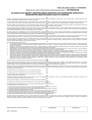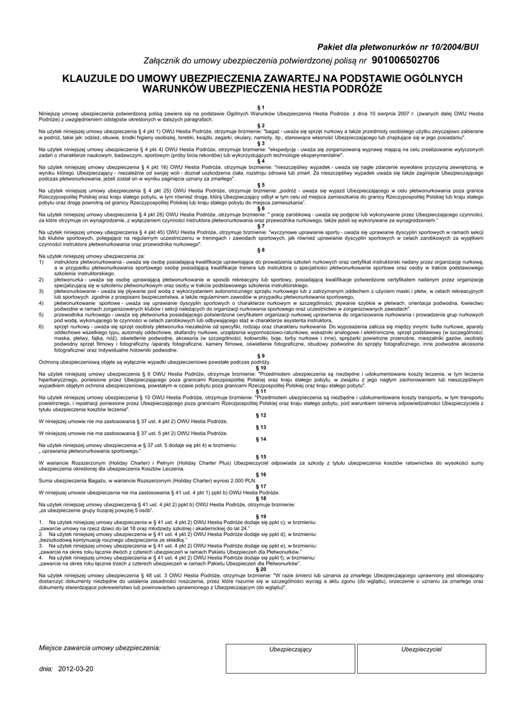 Pakiet dla płetwonurków nr 10/2004/BUI Załącznik do umowy ubezpieczenia potwierdzonej polisą nr 901006502706 KLAUZULE DO UMOWY UBEZPIECZENIA ZAWARTEJ NA PODSTAWIE OGÓLNYCH WARUNKÓW UBEZPIECZENIA HESTIA PODRÓŻE §1 Niniejszą umowę ubezpieczenia potwierdzoną polisą zawiera się na podstawie Ogólnych Warunków Ubezpieczenia Hestia Podróże. z dnia 10 sierpnia 2007 r. (zwanych dalej OWU Hestia Podróże) z uwzględnieniem odstępstw określonych w dalszych paragrafach. §2 Na użytek niniejszej umowy ubezpieczenia § 4 pkt 1) OWU Hestia Podróże, otrzymuje brzmienie: "bagaż - uważa się sprzęt nurkowy a także przedmioty osobistego użytku zwyczajowo zabierane w podróż, takie jak: odzież, obuwie, środki higieny osobistej, torebki, książki, zegarki, okulary, namioty, itp., stanowiące własność Ubezpieczającego lub znajdujące się w jego posiadaniu". §3 Na użytek niniejszej umowy ubezpieczenia § 4 pkt 4) OWU Hestia Podróże, otrzymuje brzmienie: "ekspedycję - uważa się zorganizowaną wyprawę mającą na celu zrealizowanie wytyczonych zadań o charakterze naukowym, badawczym, sportowym (próby bicia rekordów) lub wykorzystujących technologie eksperymentalne". §4 Na użytek niniejszej umowy ubezpieczenia § 4 pkt 16) OWU Hestia Podróże, otrzymuje brzmienie: "nieszczęśliwy wypadek - uważa się nagłe zdarzenie wywołane przyczyną zewnętrzną, w wyniku którego Ubezpieczający - niezależnie od swojej woli - doznał uszkodzenia ciała, rozstroju zdrowia lub zmarł. Za nieszczęśliwy wypadek uważa się także zaginięcie Ubezpieczającego podczas płetwonurkowania, jeżeli został on w wyniku zaginięcia uznany za zmarłego". §5 Na użytek niniejszej umowy ubezpieczenia § 4 pkt 25) OWU Hestia Podróże, otrzymuje brzmienie: „podróż - uważa się wyjazd Ubezpieczającego w celu płetwonurkowania poza granice Rzeczypospolitej Polskiej oraz kraju stałego pobytu, w tym również drogę, którą Ubezpieczający odbył w tym celu od miejsca zamieszkania do granicy Rzeczypospolitej Polskiej lub kraju stałego pobytu oraz drogę powrotną od granicy Rzeczypospolitej Polskiej lub kraju stałego pobytu do miejsca zamieszkania”. §6 Na użytek niniejszej umowy ubezpieczenia § 4 pkt 28) OWU Hestia Podróże, otrzymuje brzmienie: " pracę zarobkową - uważa się podjęcie lub wykonywanie przez Ubezpieczającego czynności, za które otrzymuje on wynagrodzenie, z wyłączeniem czynności instruktora płetwonurkowania oraz przewodnika nurkowego, także jeżeli są wykonywane za wynagrodzeniem.” §7 Na użytek niniejszej umowy ubezpieczenia § 4 pkt 45) OWU Hestia Podróże, otrzymuje brzmienie: "wyczynowe uprawianie sportu - uważa się uprawianie dyscyplin sportowych w ramach sekcji lub klubów sportowych, polegające na regularnym uczestniczeniu w treningach i zawodach sportowych, jak również uprawianie dyscyplin sportowych w celach zarobkowych za wyjątkiem czynności instruktora płetwonurkowania oraz przewodnika nurkowego". §8 Na użytek niniejszej umowy ubezpieczenia za: 1) instruktora płetwonurkowania - uważa się osobę posiadającą kwalifikacje uprawniające do prowadzenia szkoleń nurkowych oraz certyfikat instruktorski nadany przez organizację nurkową, a w przypadku płetwonurkowania sportowego osobę posiadającą kwalifikacje trenera lub instruktora o specjalności płetwonurkowanie sportowe oraz osoby w trakcie podstawowego szkolenia instruktorskiego. 2) płetwonurka - uważa się osobę uprawiającą płetwonurkowanie w sposób rekreacyjny lub sportowy, posiadającą kwalifikacje potwierdzone certyfikatem nadanym przez organizację specjalizującą się w szkoleniu płetwonurkowym oraz osoby w trakcie podstawowego szkolenia instruktorskiego. 3) płetwonurkowanie - uważa się pływanie pod wodą z wykorzystaniem autonomicznego sprzętu nurkowego lub z zatrzymanym oddechem z użyciem maski i płetw, w celach rekreacyjnych lub sportowych zgodnie z przepisami bezpieczeństwa, a także regulaminem zawodów w przypadku płetwonurkowania sportowego, 4) płetwonurkowanie sportowe - uważa się uprawianie dyscyplin sportowych o charakterze nurkowym w szczególności; pływanie szybkie w płetwach, orientacja podwodna, łowiectwo podwodne w ramach zorganizowanych klubów i sekcji należących do organizacji nurkowania sportowego oraz uczestnictwo w zorganizowanych zawodach". 5) przewodnika nurkowego - uważa się płetwonurka posiadającego potwierdzone ceryfikatem organizacji nurkowej uprawnienia do organizowania nurkowania i prowadzenia grup nurkowych pod wodą, wykonującego te czynności w celach zarobkowych lub odbywającego staż w charakterze asystenta instruktora, 6) sprzęt nurkowy - uważa się sprzęt osobisty płetwonurka niezależnie od specyfiki, rodzaju oraz charakteru nurkowania. Do wyposażenia zalicza się między innymi: butle nurkowe, aparaty oddechowe wszelkiego typu, automaty oddechowe, skafandry nurkowe, urządzenia wypornościowo-ratunkowe, wskaźniki analogowe i elektroniczne, sprzęt podstawowy (w szczególności; maska, płetwy, fajka, nóż), oświetlenie podwodne, akcesoria (w szczególności; kołowrotki, boje, torby nurkowe i inne), sprężarki powietrzne przenośne, mieszalniki gazów, osobisty podwodny sprzęt filmowy i fotograficzny /aparaty fotograficzne, kamery filmowe, oświetlenie fotograficzne, obudowy podwodne do sprzęty fotograficznego, inne podwodne akcesoria fotograficzne/ oraz indywidualne holowniki podwodne. §9 Ochroną ubezpieczeniową objęte są wyłącznie wypadki ubezpieczeniowe powstałe podczas podróży. § 10 Na użytek niniejszej umowy ubezpieczenia § 6 OWU Hestia Podróże, otrzymuje brzmienie: "Przedmiotem ubezpieczenia są niezbędne i udokumentowane koszty leczenia, w tym leczenia hiperbarycznego, poniesione przez Ubezpieczającego poza granicami Rzeczpospolitej Polskiej oraz kraju stałego pobytu, w związku z jego nagłym zachorowaniem lub nieszczęśliwym wypadkiem objętym
