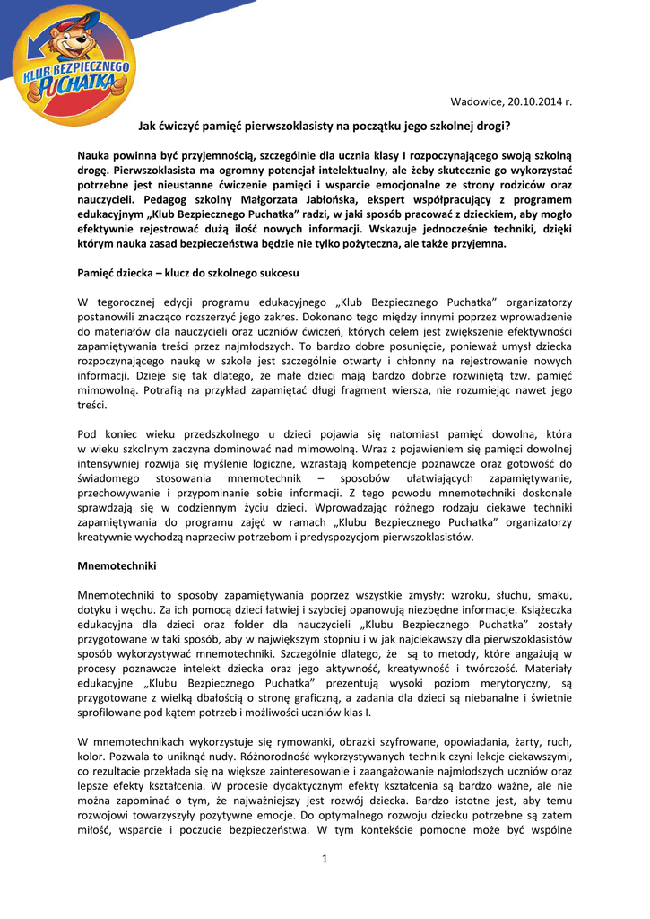 Wadowice, 20.10.2014 r. Jak ćwiczyć pamięć pierwszoklasisty na początku jego szkolnej drogi? Nauka powinna być przyjemnością, szczególnie dla ucznia klasy I rozpoczynającego swoją szkolną drogę. Pierwszoklasista ma ogromny potencjał intelektualny, ale żeby skutecznie go wykorzystać potrzebne jest nieustanne ćwiczenie pamięci i wsparcie emocjonalne ze strony rodziców oraz nauczycieli. Pedagog szkolny Małgorzata Jabłońska, ekspert współpracujący z programem edukacyjnym „Klub Bezpiecznego Puchatka” radzi, w jaki sposób pracować z dzieckiem, aby mogło efektywnie rejestrować dużą ilość nowych informacji. Wskazuje jednocześnie techniki, dzięki którym nauka zasad bezpieczeństwa będzie nie tylko pożyteczna, ale także przyjemna. Pamięć dziecka – klucz do szkolnego sukcesu W tegorocznej edycji programu edukacyjnego „Klub Bezpiecznego Puchatka” organizatorzy postanowili znacząco rozszerzyć jego zakres. Dokonano tego między innymi poprzez wprowadzenie do materiałów dla nauczycieli oraz uczniów ćwiczeń, których celem jest zwiększenie efektywności zapamiętywania treści przez najmłodszych. To bardzo dobre posunięcie, ponieważ umysł dziecka rozpoczynającego naukę w szkole jest szczególnie otwarty i chłonny na rejestrowanie nowych informacji. Dzieje się tak dlatego, że małe dzieci mają bardzo dobrze rozwiniętą tzw. pamięć mimowolną. Potrafią na przykład zapamiętać długi fragment wiersza, nie rozumiejąc nawet jego treści. Pod koniec wieku przedszkolnego u dzieci pojawia się natomiast pamięć dowolna, która w wieku szkolnym zaczyna dominować nad mimowolną. Wraz z pojawieniem się pamięci dowolnej intensywniej rozwija się myślenie logiczne, wzrastają kompetencje poznawcze oraz gotowość do świadomego stosowania mnemotechnik – sposobów ułatwiających zapamiętywanie, przechowywanie i przypominanie sobie informacji. Z tego powodu mnemotechniki doskonale sprawdzają się w codziennym życiu dzieci. Wprowadzając różnego rodzaju ciekawe techniki zapamiętywania do programu zajęć w ramach „Klubu Bezpiecznego Puchatka” organizatorzy kreatywnie wychodzą naprzeciw potrzebom i predyspozycjom pierwszoklasistów. Mnemotechniki Mnemotechniki to sposoby zapamiętywania poprzez wszystkie zmysły: wzroku, słuchu, smaku, dotyku i węchu. Za ich pomocą dzieci łatwiej i szybciej opanowują niezbędne informacje. Książeczka edukacyjna dla dzieci oraz folder dla nauczycieli „Klubu Bezpiecznego Puchatka” zostały przygotowane w taki sposób, aby w największym stopniu i w jak najciekawszy dla pierwszoklasistów sposób wykorzystywać mnemotechniki. Szczególnie dlatego, że są to metody, które angażują w procesy poznawcze intelekt dziecka oraz jego aktywność, kreatywność i twórczość. Materiały edukacyjne „Klubu Bezpiecznego Puchatka” prezentują wysoki poziom merytoryczny, są przygotowane z wielką dbałością o stronę graficzną, a zadania dla dzieci są niebanalne i świetnie sprofilowane pod kątem potrzeb i możliwości uczniów klas I. W mnemotechnikach wykorzystuje się rymowanki, obrazki szyfrowane, opowiadania, żarty, ruch, kolor. Pozwala to uniknąć nudy. Różnorodność wykorzystywanych technik czyni lekcje ciekawszymi, co rezultacie przekłada się na większe zainteresowanie i zaangażowanie najmłodszych uczniów oraz lepsze efekty kształcenia. W procesie dydaktycznym efekty kształcenia są bardzo ważne, ale nie można zapominać o tym, że najważniejszy jest rozwój dziecka. Bardzo istotne jest, aby temu rozwojowi towarzyszyły pozytywne emocje. Do optymalnego rozwoju dziecku potrzebne są zatem miłość, wsparcie i poczucie bezpieczeństwa. W tym kontekście pomocne może być wspólne 1 wykonywanie ćwiczeń przez dzieci i rodziców, np. podczas codziennych domowych zabaw. Nie mniej ważne jest również budowanie u dziecka poczucia własnej wartości poprzez dostrzeganie i docenianie jego sukcesów oraz nieszczędzenie mu przy tym pochwał i zachęt do dalszej pracy. Niewątpliwie, w przypadku pierwszoklasistów, doskonałym pomysłem jest uatrakcyjnianie zajęć lekcyjnych mnemotechnikami. „Klub Bezpiecznego Puchatka” to program, który proponuje uczniom i nauczycielom naukę poprzez różnorodne formy aktywności, zabawę, ruch, dźwięk. Z wieloletniego doświadczenia wiem, że taka forma prowadzenia zajęć przynosi najlepsze efekty poznawcze, a ponadto – jest dla dzieci przyjemnością, a nie przykrym obowiązkiem. Niezastąpionymi mnemotechnikami w procesie edukacji są piktogramy, wierszyki i rymowanki, mapy mentalne, łańcuchy skojarzeń, pantomimy. Wszystkie przykłady tych aktywizujących mnemotechnik oraz sposobów ich wykorzystania w atrakcyjnej dla dzieci formie, można znaleźć w materiałach edukacyjnych „Klubu Bezpiecznego Puchatka”. Mnemotechnika Piktogramy Wierszyki i rymowanki Mapy mentalne Łańcuchy skojarzeń Pantomimy „Haki” pamięciowe Opis Metoda kształcąca pamięć, wyobraźnię i kreatywność, polegająca na ilustrowaniu treści piosenek, wierszy, bajek, opowiadań. Uczniowie wykonują schematyczne rysunki, obrazujące tekst do zapamiętania. Podczas zajęć „Klubu Bezpiecznego Puchatka” za pomocą tej mnemotechniki pierwszoklasiści uczą się między innymi znaków drogowych. Do wskazanych nazw znaków, dzieci przygotowują ich rysunkowe odpowiedniki. Mnemotechnika kształcąca pamięć (głównie słuchową). Może być połączona z ruchem. Polega na uczeniu się przez dzieci tekstów rymowanek, które ułatwiają zapamiętywanie. Im wierszyk lub rymowanka bardziej zabawna i ciekawa, tym lepiej, ponieważ na dłużej pozostanie w pamięci dziecka. Przykładem jest tu rymowanka „Przejście przez jezdnię na drugą stronę, tylko na pasach jest dozwolone”. Więcej podobnych rymowanek, sprzyjających uczeniu się przez dzieci ważnych zasad ruchu drogowego znajduje się w folderze dla nauczycieli realizujących