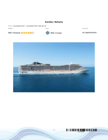 Karaiby i Bahamy Termin: 16 grudzień 2017 - 23 grudzień 2017 (ilość dni: 8) Statek: MSC Fantasia Linia: Cena od: MSC Cruises na zapytanie/os. 1/3 EV:45932 TRASA REJSU dzień 1 dzień 2 dzień 3 dzień 4 dzień 5 dzień 6 dzień 7 dzień 8 Data Port Wpłynięcie Wypłynięcie sobota 16.12.2017 Fort-de-France --:-- 23:00 niedziela 17.12.2017 Pointe-a-Pitre 08:00 21:00 08:00 18:00 08:00 20:00 09:00 18:00 09:00 18:00 08:00 18:00 08:00 --:-- Legenda Martynika Gwadelupa Roseau poniedziałek 18.12.2017 Dominika wtorek 19.12.2017 Bridgetown środa 20.12.2017 Port-of-Spain, Trinidad czwartek 21.12.2017 Saint George's Barbados piątek 22.12.2017 sobota 23.12.2017 Trinidad i Tobago Grenada Castries Saint Lucia Fort-de-France Martynika CENNIK Cena katalogowa Kabina wewnętrzna od €369.00 Kabina zewnętrzna z oknem od €499.00 Kabina zewnętrzna z balkonem od €679.00 Suite (apartament) na zapytanie MSC Yacht Club Suite na zapytanie Kabina jednoosobowa na zapytanie 3 i 4 osoba dorosła w kabinie na zapytanie dziecko od 12 do 17 lat jako 3 i 4 osoba w kabinie na zapytanie Cena promocyjna 2/3 EV:45932 dziecko od 2 do 11 lat jako 3 i 4 osoba w kabinie Opłaty portowe tylko opłaty portowe €130.00 Uwaga! Ceny za osobę w kabinie dwuosobowej. Cena zawiera: zakwaterowanie w kabinie wybranej kategorii; wyżywienie - 3 główne posiłki, przekąski między posiłkami, bufet lub przekąski o północy; napoje serwowane do śniadania i w bufetach samoobsługowych; serwis bagażowy podczas wejścia i zejścia ze statku; serwis kabinowy; korzystanie ze wszystkich urządzeń sportowo - rekreacyjnych znajdujących się na pokładzie statku (basen, jacuzzi, sala fitness, itp.); udział we wszystkich imprezach organizowanych na statku (przedstawienia w teatrze, koncerty, programy animacyjne itp.). Cena nie zawiera: kosztów dojazdu do portu; opłat portowych; ewentualnych noclegów w hotelu przed/po rejsie i transferów; wycieczek fakultatywnych w trakcie rejsu; korzystania z barów, mini baru w kabinie oraz napojów zamawianych w restauracji; korzystania z punktów usługowych (fryzjer, pralnia, fotograf, salon piękności i odnowy biologicznej, internet) i wydatków osobistych; napiwków dla obsługi na statku (kwota uzależniona od długości rejsu); ubezpieczenia KL, NNW i bagaż, kosztów wiz (tam gdzie wymagane). Uwagi: na wszystkich rejsach MSC Cruises można zarezerwować pakiety all inclusive: Allegrissimo 24h: 26€/os./dzień i 12€/dziecko/dzień; Allegrissimo Premium: 44€/os./dzień i 21€/dziecko/dzień (pakiet musi być wykupiony przez każdą osobę zakwaterowaną w kabinie - można zakupić w biurze przed rejsem). Na Państwa życzenie zarezerwujemy przelot, transfery do/z portu, parking, dodatkowe noclegi oraz zadbamy o odpowiednie ubezpieczenie podróżne. 3/3 EV:45932