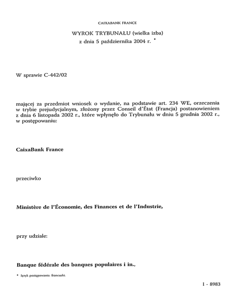 CAIXABANK FRANCE WYROK TRYBUNAŁU (wielka izba) z dnia 5 października 2004 r. W sprawie C-442/02 mającej za przedmiot wniosek o wydanie, na podstawie art. 234 WE, orzeczenia w trybie prejudycjalnym, złożony przez Conseil d'État (Francja) postanowieniem z dnia 6 listopada 2002 r., które wpłynęło do Trybunału w dniu 5 grudnia 2002 r., w postępowaniu: CaixaBank France przeciwko Ministère de l'Économie, des Finances et de l'Industrie, przy udziale: Banque fédérale des banques populaires i in., * Język postępowania: francuski. I - 8983 WYROK Z DNIA 5.10.2004 r. - SPRAWA C-442/02 TRYBUNAŁ (wielka izba), w składzie: V. Skouris, prezes, P. Jann, C. W. A. Timmermans, C. Gulmann, J.-P. Puissochet, J. N. Cunha Rodrigues (sprawozdawca), prezesi izb, oraz R. Schintgen, N. Colneric, S. von Bahr, R. Silva de Lapuerta i K. Lenaerts, sędziowie, rzecznik generalny: A. Tizzano, sekretarz: M. Mugica Arzamendi, główny administrator, uwzględniając procedurę pisemną i po przeprowadzeniu rozprawy w dniu 19 listopada 2003 r., rozważywszy uwagi przedstawione: — w imieniu CaixaBank France przez M. Dany'ego, avocat, oraz G. Castella, członka zarządu, dyrektora generalnego, — w imieniu Banque fédérale des banques populaires i in. przez A. Barava avocat i barrister, — w imieniu Republiki Francuskiej przez R. Abrahama, G. de Berguesa, D. Petrauscha i F. Alabrune'a, działających w charakterze pełnomocników, I - 8984 CAIXABANK FRANCE — w imieniu Komisji Wspólnot Europejskich przez M. Patakię i G. Zawosa, działających w charakterze pełnomocników, po zapoznaniu się z opinią rzecznika generalnego na posiedzeniu w dniu 25 marca 2004 r., wydaje następujący Wyrok 1 Wniosek o wydanie orzeczenia w trybie prejudycjalnym dotyczy wykładni art. 43 WE. Ramy prawa krajowego 2 Zgodnie z art. L. 312-3 code monétaire et financier (kodeksu pieniężnego i finansowego), w brzmieniu mającym zastosowanie w niniejszej sprawie: „Niezależnie od wszelkich przepisów stanowiących odmiennie zakazuje się instytucjom kredytowym, którym powierzono na rachunek, w jakikolwiek sposób, środki płatne a vista lub w okresie krótszym niż pięć lat, wypłaty oprocentowania wyższego od określonego rozporządzeniem wydanym przez comité de la réglementation bancaire et financière (komitet do spraw regulacji bankowej i finansowej) lub przez ministra do spraw gospodarki". I - 8985 WYROK Z DNIA 5.10.2004 r. — SPRAWA C-442/02 3 Rozporządzenie nr 86-13 wydane przez comité de la réglementation bancaire et financière, zatwierdzone decyzją ministra do spraw gospodarki z dnia 14 maja 1986 r. (JORF z dnia 15 maja 1986 r., str. 6330), zabrania oprocentowania rachunków a vista. 4 Zakaz ten ma zastosowanie do rachunków a vista wyrażonych w euro, otwartych przez osoby mające stałe miejsce zamieszkania we Francji, bez względu na ich przynależność państwową. Postępowanie przed sadem krajowym i pytania prejudycjalne 5 CaixaBank France (zwana dalej „CaixaBank"), spółka prawa francuskiego z siedzibą we Francji, będąca filią Caixa Holding, spółki prawa hiszpańskiego z siedzibą w Hiszpanii posiadającej udziały grupy Caixa w instytucjach kredytowych zarejestrowanych pod tą nazwą w Hiszpanii i innych państwach Unii Europejskiej, począwszy od 18 lutego 2002 r. oferuje rachunek depozytowy a vista oprocentowany według stawki 2 % rocznie powyżej kwoty depozytu 1500 euro. Decyzją commission bancaire et financière (komisji do spraw bankowych i finansowych) z dnia 16 kwietnia 2002 r., po pierwsze, zabroniono CaixaBank zawierania z osobami mającymi stałe miejsce zamieszkania we Francji nowych umów dotyczących wyrażonych w euro rachunków a vista, a po drugie, nakazano wypowiedzenie klauzul przewidujących oprocentowanie takich rachunków w umowach już zawartych. 6 CaixaBank zaskarżyła tę decyzję do Conseil d'État, która postanowiła zawiesić postępowanie i zwrócić się do Trybunału z następującymi pytaniami prejudycjalnymi: „1) Czy ustanowiony przez Państwo Członkowskie zakaz oprocentowania depozy tów a vista oraz innych środków pod tytułem zwrotnym przez instytucje bankowe mające stałą siedzibę na jego terytorium stanowi, wobec braku I - 8986 CAIXABANK FRANCE stosownego przepisu w dyrektywie 2000/12/WE Parlamentu Europejskiego i Rady, ograniczenie swobody przedsiębiorczości? 2) W przypadku pozytywnej odpowiedzi na pierwsze pytanie — jakie względy interesu publicznego mogłyby zostać wskazane w niniejszym przypadku na uzasadnienie takiego ograniczenia?". W przedmiocie pytań prejudycjalnych 7 Należy od razu stwierdzić, że dyrektywa 2000/12/WE Parlamentu Europejskiego i Rady z dnia 20 marca 2000 r. odnosząca się do podejmowania i prowadzenia działalności przez instytucje kredytowe (Dz.U. L 126, str. 1) nie znajduje zastosowania w przypadku, jaki ma miejsce w sprawie przed sądem krajowym, gdyż w szczególności dyrektywa ta nie ma za przedmiot ograniczeń zakładania spółek, które, jak CaixaBank, korzystają ze swobody przedsiębiorczości w Państwie Członkowskim jako filie instytucji kredytowych ustanowionych w innych Państwach Członkowskich. 8 Sąd krajowy zmierza w istocie do wyjaśnienia, czy art. 43 WE stoi na przeszkodzie stosowaniu przepisów prawa Państwa Członkowskiego zakazujących instytucji kredytowej, filii spółki z innego Państwa Członkowskiego, oprocentowania wyrażonych w euro rachunków a vista otwartych przez osoby mające stałe miejsce zamieszkania na terytorium tego pierwszego Państwa Członkowskiego. 9 Swoboda przedsiębiorczości przewidziana w art. 43 WE w związku z art. 48 WE przysługuje zarówno osobom fizycznym, obywatelom Państw Członkowskich, jak również osobom prawnym w rozumieniu tego ostatniego przepisu. Obejmuje ona, z zastrzeżeniem wyjątków i przewidzianych warunków, podejmowanie I - 8987 WYROK Z DNIA 5.10.2004 r. — SPRAWA C-442/02 i wykonywanie na terytorium każdego innego Pa