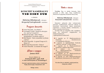 Instytut Edukacji Muzycznej Uniwersytetu Jana Kochanowskiego w Kielcach zaprasza na KONCERT KAMERALNY VIO-DION DUO w składzie: Malwina Mikołajczak – skrzypce Krzysztof Lutrzykowski – akordeon Program koncertu Astor Piazzolla - Ave Maria 7’ Arcangelo Corelli - Sonata na skrzypce i b.c. op.5 nr 7 d-moll 11’ Manuel de Falla - Suita "Pieśni hiszpańskich" (wybrane części) 4’ Bela Bartok - Tańce rumuńskie (wybrane części) 7’ Astor Piazzolla - Le grand Tango ed. E. Moser 12’ Sławomir Kaczorowski - Chain 6' Astor Piazzolla - La muerte del Angel 3’ Słowo o muzyce: Janusz Król Koncert odbędzie się 29 listopada 2012 r. godz. 18.00 w Auli Uniwersytetu ul. Żeromskiego 5 Koncert sponsorowany przez Uczelnianą Radę Samorządu Studentów UJK Wstęp wolny Notka o duecie Vio-dion Duo to młoda formacja, która powstała w 2011 roku. Duet współtworzą absolwenci bydgoskiej Akademii Muzycznej, Malwina Mikołajczak – skrzypce Krzysztof Lutrzykowski – akordeon Muzyków połączyła idea wykonywania utworów współczesnych. Pierwsze sukcesy na koncertach zaowocowały chęcią poszerzenia repertuaru o muzykę baroku, romantyzmu, a także o muzykę rozrywkową. Vio-dion Duo po niespełna roku współpracy może się poszczycić osiągnięciami na międzynarodowych i ogólnopolskich konkursach: II nagroda na 37 Międzynarodowym Konkursie Akordeonowym w Castelfidardo (Włochy), I nagroda na Ogólnopolskim Festiwalu „Zdrowia i muzyki” w Solcu-Zdroju, I nagroda na 8 Międzynarodowym Konkursie w Beltinci (Słowenia), IV miejsce na prestiżowym 49 Międzynarodowym Konkursie w Klingenthal (Niemcy), II nagroda na 37 Międzynarodowym Konkursie w Puli (Chorwacja), II nagroda na XVII Międzynarodowych Spotkaniach Akordeonowych „Sanok 2012” Vio-dion Duo to młodość, profesjonalizm, charyzma, radość