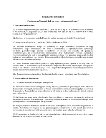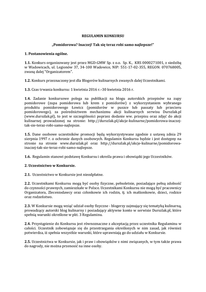 REGULAMIN KONKURSU „Pomidorowa? Inaczej! Tak się teraz robi samo najlepsze!” 1. Postanowienia ogólne. 1.1. Konkurs organizowany jest przez MGD-GMW Sp. z o.o. Sp. K., KRS 0000271001, z siedzibą w Wadowicach, ul. Legionów 37, 34-100 Wadowice, NIP: 551-17-02-355, REGON: 070768005, zwaną dalej "Organizatorem". 1.2. Konkurs przeznaczony jest dla Blogerów kulinarnych zwanych dalej Uczestnikami. 1.3. Czas trwania konkursu: 1 kwietnia 2016 r.–30 kwietnia 2016 r. 1.4. Zadanie konkursowe polega na publikacji na blogu autorskich przepisów na zupy pomidorowe (zupa pomidorowa lub krem z pomidorów) z wykorzystaniem wybranego produktu pomidorowego Łowicz (pomidorów w puszce lub passaty lub przecieru pomidorowego), za pośrednictwem mechanizmu akcji kulinarnych serwisu Durszlak.pl (www.durszlak.pl), to jest w szczególności poprzez dodanie ww. przepisu oraz zdjęć do akcji kulinarnej prowadzonej na stronie: http://durszlak.pl/akcje-kulinarne/pomidorowa-inaczejtak-sie-teraz-robi-samo-najlepsze. 1.5. Dane osobowe uczestników promocji będą wykorzystywane zgodnie z ustawą zdnia 29 sierpnia 1997 r. o ochronie danych osobowych. Regulamin Konkursu będzie i jest dostępny na stronie na stronie www.durszlak.pl oraz http://durszlak.pl/akcje-kulinarne/pomidorowainaczej-tak-sie-teraz-robi-samo-najlepsze. 1.6. Regulamin stanowi podstawę Konkursu i określa prawa i obowiązki jego Uczestników. 2. Uczestnictwo w Konkursie. 2.1. Uczestnictwo w Konkursie jest nieodpłatne. 2.2. Uczestnikami Konkursu mogą być osoby fizyczne, pełnoletnie, posiadające pełną zdolność do czynności prawnych, zamieszkałe w Polsce. Uczestnikami Konkursu nie mogą być pracownicy Organizatora, Zleceniodawcy oraz członkowie ich rodzin, tj. ich małżonkowie, dzieci, rodzice oraz rodzeństwo. 2.3. W Konkursie mogą wziąć udział osoby fizyczne - blogerzy zajmujący się tematyką kulinarną, prowadzący autorski blog kulinarny i posiadający aktywne konto w serwisie Durszlak.pl, które spełnią warunki określone w pkt. 3 Regulaminu. 2.4. Przystąpienie do Konkursu jest równoznaczne z akceptacją przez uczestnika Regulaminu w całości. Uczestnik zobowiązuje się do przestrzegania określonych w nim zasad, jak również potwierdza, iż spełnia wszystkie warunki, które uprawniają go do udziału w Konkursie. 2.5. Uczestnictwa w Konkursie, jak i praw i obowiązków z nimi związanych, w tym także prawa do nagrody, nie można przenosić na inne osoby. 3. Przebieg i warunki udziału w Konkursie. 3.1. Konkurs polega na przygotowaniu i przesłaniu autorskiego przepisu (określonego w punkcie 1.4 Regulaminu) na zupę pomidorową lub krem z pomidorów z wykorzystaniem wybranego produktu pomidorowego Łowicz (pomidory w puszce lub przecier pomidorowy lub passata), wraz z ilustrującym go zdjęciem według zasad zamieszczonych na stronie http://durszlak.pl/akcje-kulinarne/pomidorowa-inaczej-tak-sie-teraz-robi-samo-najlepsze. 3.2. Aby zgłosić przepis należy: 3.2.1. przygotować przepis na zupę pomidorową lub krem z pomidorów z wybranym produktem pomidorowym Łowicz (przecier pomidorowy lub pomidory w puszce lub passata). 3.2.2. zrobić zdjęcie potrawy, przy której widoczny będzie wykorzystany do jej przygotowania produkt pomidorowy Łowicz (przecier pomidorowy lub pomidory w puszce lub passata). 3.2.3. opublikować przepis wraz ze zdjęciem oraz banerkiem akcji w formie wpisu na prowadzonym przez Uczestnika blogu. 3.2.4. zgłosić wpis z daniem konkursowym oraz wraz ze stosownym zdjęciem do Konkursu za pośrednictwem strony: http://durszlak.pl/akcje-kulinarne/pomidorowainaczej-tak-sie-teraz-robi-samo-najlepsze. Jeden Uczestnik może zgłosić dowolną liczbę przepisów do akcji konkursowej. 3.2.5. w przepisie oraz na zdjęciach zgłoszonych do konkursu nie mogą być lokowane produkty żadnych innych marek, ze szczególnym wskazaniem firmy i marek produkujących i sprzedających jakiekolwiek produkty spożywcze, które mogą być potrzebne do przygotowania zupy pomidorowej lub kremu z pomidorów. 3.3. Jeden bloger może wygrać jedną nagrodę w danym konkursie. 3.4. Zgłoszony przepis do konkursu nie może brać udziału w innym konkursie lub akcji konkursowej. 3.5. Poprzez zgłoszenie przepisu do Konkursu w sposób wyżej określony, Uczestnik Konkursu oświadcza, że treść i forma każdej z zamieszczonych wypowiedzi konkursowych nie narusza przepisów prawa, ani prawem chronionych dóbr osób trzecich, a uczestnik Konkursu jest w pełni uprawniony do zgłoszenia każdej z wypowiedzi konkursowych. 3.6. Z tytułu złożonego powyżej oświadczenia Uczestnik przyjmuje na siebie pełną odpowiedzialność prawną. W przypadku jakichkolwiek roszczeń ze strony osób trzecich Uczestnik, po zawiadomieniu go przez Organizatora, nie uchyli się od niezwłocznego przystąpienia do wyjaśnienia sprawy oraz wystąpi przeciwko takim roszczeniom na własny koszt i ryzyko, a nadto zaspokoi wszelkie uzasadnione roszczenia, a w razie ich zasądzenia od Organizatora, regresowo zwróci całość pokrytych roszczeń oraz wszelkie związane z tym wydatki i opłaty, włączając w to koszty procesu i obsługi prawnej, a także naprawi wszelkie inne szkody wynikające z wyżej opisanych roszczeń osób trzecich. 3.7. Uczestnicy konkursu przenoszą na Organizatora konkursu i Zleceniodawcę autorskie prawa majątkowe do zgłoszonego przepisu a także wszelkich Utworów będących składnikami Zgłoszenia (w szczególności takich jak zdjęcia), w sytuacji gdy ich przepisy zostaną nagrodzone lub wyróżnione, bez ograniczeń terytorialnych i czasowych na następujących polach eksploatacji: 3.7.1. wprowadzanie do pamięci komputera, publiczne wykonanie albo publiczne odtwarzanie, publikacja w Internecie, w tym także na stronach www organizatora i stronach www marki Łowicz, na profilach Łowicz w mediach społecznościowych, a także na stronie www.durszlak.pl. 3.7.2. publikowanie, publiczne odtwarzanie i przedrukowywanie 