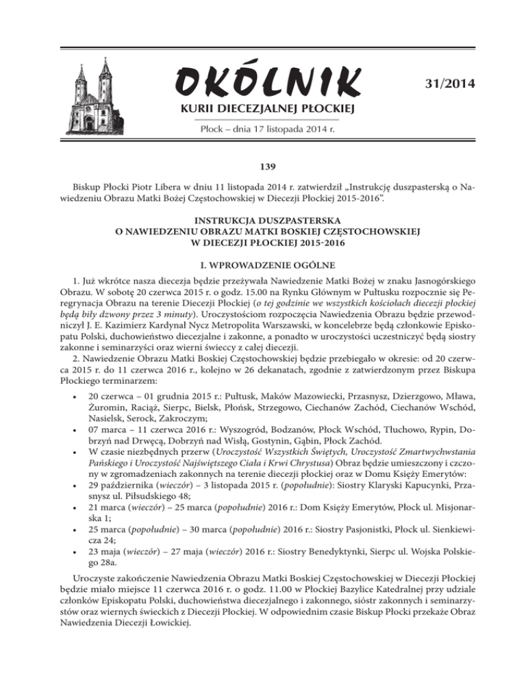 OKÓLNIK 31/2014 KURII DIECEZJALNEJ PŁOCKIEJ Płock – dnia 17 listopada 2014 r. 139 Biskup Płocki Piotr Libera w dniu 11 listopada 2014 r. zatwierdził „Instrukcję duszpasterską o Nawiedzeniu Obrazu Matki Bożej Częstochowskiej w Diecezji Płockiej 2015-2016”. INSTRUKCJA DUSZPASTERSKA O NAWIEDZENIU OBRAZU MATKI BOSKIEJ CZĘSTOCHOWSKIEJ W DIECEZJI PŁOCKIEJ 2015-2016 I. WPROWADZENIE OGÓLNE 1. Już wkrótce nasza diecezja będzie przeżywała Nawiedzenie Matki Bożej w znaku Jasnogórskiego Obrazu. W sobotę 20 czerwca 2015 r. o godz. 15.00 na Rynku Głównym w Pułtusku rozpocznie się Peregrynacja Obrazu na terenie Diecezji Płockiej (o tej godzinie we wszystkich kościołach diecezji płockiej będą biły dzwony przez 3 minuty). Uroczystościom rozpoczęcia Nawiedzenia Obrazu będzie przewodniczył J. E. Kazimierz Kardynał Nycz Metropolita Warszawski, w koncelebrze będą członkowie Episkopatu Polski, duchowieństwo diecezjalne i zakonne, a ponadto w uroczystości uczestniczyć będą siostry zakonne i seminarzyści oraz wierni świeccy z całej diecezji. 2. Nawiedzenie Obrazu Matki Boskiej Częstochowskiej będzie przebiegało w okresie: od 20 czerwca 2015 r. do 11 czerwca 2016 r., kolejno w 26 dekanatach, zgodnie z zatwierdzonym przez Biskupa Płockiego terminarzem: • 20 czerwca – 01 grudnia 2015 r.: Pułtusk, Maków Mazowiecki, Przasnysz, Dzierzgowo, Mława, Żuromin, Raciąż, Sierpc, Bielsk, Płońsk, Strzegowo, Ciechanów Zachód, Ciechanów Wschód, Nasielsk, Serock, Zakroczym; • 07 marca – 11 czerwca 2016 r.: Wyszogród, Bodzanów, Płock Wschód, Tłuchowo, Rypin, Dobrzyń nad Drwęcą, Dobrzyń nad Wisłą, Gostynin, Gąbin, Płock Zachód. • W czasie niezbędnych przerw (Uroczystość Wszystkich Świętych, Uroczystość Zmartwychwstania Pańskiego i Uroczystość Najświętszego Ciała i Krwi Chrystusa) Obraz będzie umieszczony i czczony w zgromadzeniach zakonnych na terenie diecezji płockiej oraz w Domu Księży Emerytów: • 29 października (wieczór) – 3 listopada 2015 r. (popołudnie): Siostry Klaryski Kapucynki, Przasnysz ul. Piłsudskiego 48; • 21 marca (wieczór) – 25 marca (popołudnie) 2016 r.: Dom Księży Emerytów, Płock ul. Misjonarska 1; • 25 marca (popołudnie) – 30 marca (popołudnie) 2016 r.: Siostry Pasjonistki, Płock ul. Sienkiewicza 24; • 23 maja (wieczór) – 27 maja (wieczór) 2016 r.: Siostry Benedyktynki, Sierpc ul. Wojska Polskiego 28a. Uroczyste zakończenie Nawiedzenia Obrazu Matki Boskiej Częstochowskiej w Diecezji Płockiej będzie miało miejsce 11 czerwca 2016 r. o godz. 11.00 w Płockiej Bazylice Katedralnej przy udziale członków Episkopatu Polski, duchowieństwa diecezjalnego i zakonnego, sióstr zakonnych i seminarzystów oraz wiernych świeckich z Diecezji Płockiej. W odpowiednim czasie Biskup Płocki przekaże Obraz Nawiedzenia Diecezji Łowickiej. – 174 – II. ZAŁOŻENIA I ZADANIA NAWIEDZENIA OBRAZU MATKI BOSKIEJ CZĘSTOCHOWSKIEJ 1. Nawiedzenie Obrazu Matki Boskiej Częstochowskiej w diecezji to czas, w którym wierni mogą złożyć swoje życie – troski i radości – przed łaskawym Obliczem Matki i Królowej oraz nabrać sił do pracy nad sobą. Nawiedzenie ma dopełnić dzieła Jasnogórskich Ślubów Narodu i przygotować do dobrego przeżycia 1050-lecia chrztu Polski oraz do 940 rocznicy założenia biskupstwa w Płocku. Będziemy też dziękować Bogu za duchowe owoce 43 Synodu Diecezji Płockiej. 2. Przez Nawiedzenie Obrazu ma się dokonać rzeczywiste spotkanie Maryi z całą rodziną diecezjalną. Owocem tego spotkania powinien być wzrost wiary, odrodzenie religijno-moralne, umocnienie więzi duchowej z Kościołem, rozbudzenie ducha i aktywności apostolskiej wśród wiernych. Nawiedzenie to także okazja do osobistego i wspólnotowego wyznania Chrystusa przed ludźmi, manifestacji wiary w Boga, do ukazania jedności Kościoła i oddania szczególnej czci Najświętszej Maryi Pannie jako Matce Chrystusa i Kościoła, Królowej Polski i Pani Jasnogórskiej. 3. Nawiedzenie Obrazu Jasnogórskiego będzie przebiegać w Diecezji Płockiej pod hasłem: Z Maryją ewangelizujemy Kościół Płocki. Hasło to uwydatnia i wyznacza szczegółowy cel i sposób przeżycia Nawiedzenia Obrazu Maryjnego, którego specyfiką jest nowa ewangelizacja. Realizacja tego hasła powinna się dokonywać poprzez: – przepowiadanie i słuchanie Słowa Bożego w kościele, – nawrócenie przez spotkanie z Bożym Miłosierdziem w sakramencie pokuty, – odnowione i gorliwe uczestnictwo w liturgii, – przekazywanie i przyswajanie prawd wiary i zasad moralnych na katechezie, – podawanie i poznawanie prawd religijnych i zasad chrześcijańskich w domu rodzinnym, – nauczanie i praktykowanie żywej wiary i ducha ewangelicznego w życiu osobistym i rodzinnym, środowiskowym i parafialno-społecznym. Nawiedzenie rodzin parafialnych przez Obraz Świętej Bożej Rodzicielki powinno przebiegać w atmosferze duchowego nawrócenia i pojednania z Bogiem i ludźmi, w nadziei „powrotu do domu Ojca” tych wszystkich, których wiara i więź z Kościołem uległy osłabieniu, a nawet zerwaniu. Ważnym elementem nawiedzenia powinno być poczucie wdzięczności całego Kościoła Płockiego wobec Chrystusa i Maryi za roztaczanie opieki nad całą diecezją przez 940 lat jej istnienia. III. PRAKTYCZNE WSKAZANIA DOTYCZĄCE PEREGRYNACJI KOPII OBRAZU MATKI BOŻEJ JASNOGÓRSKIEJ 1. Przygotowanie dalsze a) Poinformowanie wiernych o dokładnej dacie peregrynacji i rozpoczęcie nowenny na 9 miesięcy przed przybyciem obrazu do diecezji. b) Zaproszenie rekolekcjonisty, który poprowadzi trzydniowe rekolekcje lub misje święte tuż przed przebyciem Matki Bożej do parafii. c) Wysłać zaproszenie do księży pochodzących z parafii, bądź pracujących kiedyś w parafii do udziału w tzw. „Pasterce Maryjnej” w dniu nawiedzenia. d) Zaopatrzenie wiernych w lampiony, obrazy i obrazki z wizerunkiem Matki Bożej Często