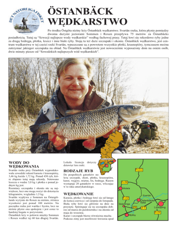 ÖSTANBÄCK W‰DKARSTWO Po 5rodku Östgöta niziny le¡y Östanbäck w´dkarstwo. Svartån rzeka, która p¬ynie pomi´dzy dwoma du¡ymi jeziorami Sommen i Roxen przep¬ywa 75 metrów za Östanbäcks posiad¬o5ci_. Tutaj s_ “Szwecji najlepsze wody w´dkarskie” wed¬ug fachowej prasy. Tutaj ¬owi si´ rekordowe ryby jedne za drug_ bzdr´ga, p¬otka, leszcz i inne bia¬e ryby. Stoj_ tu te¡ du¡e szczupaki i okonie. Östanbäck w´dkarstwo, jest centrum w´dkarstwa w tej cz´5ci rzeki Svartån, wpuszczane s_ z powrotem wszystkie p¬otki, krasnopióry, tymczasem mo¡na zatrzyma≤ jakiego5 szczupaka na obiad. Na Östanbäck w´dkarstwie jest nowocze5nie wyposa¡ony dom na osiem osób, dwie minuty pieszo od “Szwedzkich najlepszych wód w´dkarskich”. Stockholm WODY DO W‰DKOWANIA Lokala licencja dotyczy dziewi´≤ km rzeki. Svartån rzeka przy Östanbäck wyprodukowa¬a szwedzki rekord karasia i krasnopióry, 3,46 kg ka¡da 1,72 kg. Ponad 450 ryb, które z¬apano tutaj maj_ rekordy. Notowano leszcza o wadze 3,8 kg i p¬otka o ponad jednym kg jest. Rozmiary szczupaka i okonia nie s_ najwi´ksze, lecz one mog_ wa¡y≤ do dziesi´ciu kilogramów, wzgl´dnie 1,5 kg. Svartån wyp¬ywa z Sommen na Östergötlands wy¡ynie do Roxen na nizinie, ró¡nica wysoko5ci jest ponad 100 metrów. Na pocz_tku rzeka jest wartka i bystra, lecz na nizinie p¬ynie ona spokojnie i jest coraz to bardziej bogata w po¡ywienie. Östanbäck le¡y w po¬owie mi´dzy Sommen i Roxen wzd¬u¡ tej 60 km d¬ugiej Svartån. RODZAJE RYB Do pospolitych gatunków nale¡_ szczypak, oko~, p¬otka, krasnopióra, kara5, w´gorz, mi´tus, lin, bzdr´ga. Razem wyst´puje 20 gatunków w rzece, wliczaj_c w to raka ameryka~skiego. Rv211 Rv36 Motala W‰DKOWANIE Karasia, p¬otk´ i bzdr´g´ ¬owi si´ od lutego do ko~ca czerwca i od sierpnia do listopada. Bia¬_ ryb´ ¬owi si´ g¬ównie na dnie na przyn´t´. Spininguje si´ na szczupaka dobrze od marca do pa¡dziernika i na okonia od maja do wrze5nia. Kara5 i szczupak bierze równie¡na much´. Podczas zimy jest mo¡liwo5≤ ¬owienia spod Svartån Rv32 Östanbäcks fiske Skänninge 206 E4 Linköping Rv34 Mjölby rakowe po¬owy i jedzenie raków w kombinacji z konferencjami i kursami. Östgöta nizina i jeziora nizinne Tåkern i Roxen posiadaj_ du¡e bogactwo ptaków. %redniowieczne miejscowo5ci Skänninge i Vadstena, jak i historyczne miejsca jak Bjälbo i Alvastra, s_ warte obejrzenia. W Mantorp s_ gonitwy k¬usaków i tor samochodowy. Nizina odgraniczona jest od pó¬nocy Göta kana¬em pomi´dzy Roxen i Vättern. CENY 4-¬ó¡kowy lodu je5li jest gruby lód. Raki ¬owi si´ w sierpniu i wrze5niu. REGU…Y W‰DKOWANIA A¡eby ¬owi≤ ryby na rzece Svartån potrzeba siedem licencji. Licencja na Västerlösa–Älvestad rozci_ga si´ na dziew´≤ km i ca¬kiem wystarczy na w´dkowanie tygodniowe. Wszystkie p¬otki, krasnopióry, karasie i leszcze wypuszcza si´ z powrotem, tymczasem nie jednago szczupaka mo¡na zatrzyma≤ na obiad. osiem do dwunastu ¬ó¡ek, kuchnia, pokój dzienny z telewizorem, natrysk i wc. Na dziedzi~cu jest te¡ domek o pow. 25 metrów kwadratowych, cztery miejsca do spania, piecyk kuchenny, lodówka, natrysk, wc i telewizor. Domki s_ przeznaczone na w¬asne utrzymanie, jednak mo¡na uzgodni≤ 5niadanie i posi¬ki na przynos. Po5ciele mo¡na po¡yczy≤ i sprz_tanie op¬aci≤. After Fishing to poj´cie na Östanbäck. 2 500 kr/na tydzie~ 700 kr/dob´ Du¡y dom 6 000 kr/tydzie~ 1 800 kr/dob´ ¬ó¡ko 225 kr/dob´ jednoosobowy 325 kr/dob´ extra ¬ó¡ko 100 kr/dob´ Przewodnik w´dkarski – jedna godzina 450 kr, nast´pne 250 kr/godz Licencja 200 kr/na rok 140 kr/tydzie~ 50 kr/doba …ódka 75 kr/doba W´dka 50 kr/doba Spiningowa w´dka 75 kr/doba POZOSTA…Y SERWIS Trzy ¬odzie wios¬owe s_ do wypo¡yczenia. Równie¡ kamizelki ratunkowe i sprz´t w´dkarski s_ do wypo¡yczenia. Jest mapa odcinka rzeki. ZAMIESZKANIE Na Östanbäcks w´dkarstwie jet nowocze5nie wyposa¡ony dom o pow. 150 metrów kwadratowych z czterema sypialniami na Przy brzegu rzeki i Östanbäcks W´dkarstwa le¡y sauna drewnem opalana i wiatrochron z miejscem do grilowania. W Mantorp, 10 km, jest centrum handlowe, stacja benzynowa, apteka. Do Skänninge jest 15 km do lekarza, sklepu monopolowego i biura turystycznego a do centralnej miejscowo5ci Mjölby ze stacj_ kolejow_ 25 km. POZOSTA…E ZAJ‰CIA CZYNNE Na Östanbäcks w´dkarstwie organizujemy TAK DOJEDZIESZ DO ÖSTANBÄCK W‰DKARSTWA Od Skänninge drogi 206 na Linköping, po 6 km w prawo na Normlösa, po 5 km w lewo przy ko5ciele w Normlösa, po 200 m w prawo na Västerlösa, po 1 km w lewo na Nederlösa, po trzech km szyld Östanbäcks fiske. Od E4 przy Mantorp, droga 206 na Vadstena, w prawo po ca 500 m przy stacji benzynowej Statoil na Normlösa, po czterech km w lewo na Normlösa, po trzech km w prawo na Nederlösa, po dwóch km w prawo na Östanbäcks fiske. GOSPODARZE W‰DKARZY Anders Rockler Östanbäcks Fiske Nederlösa Östanbäck 596 93 Skänninge Telefon +46(0)142-36 01 79 Mobil +46(0)70-564 88 86 E-mail [email protected] Strona internetowa www.ostanbackfiske.com AB C O Ekblad & Co, Västervik 2003 …ÓDKI I SPRZ‰T W‰DKARSKI