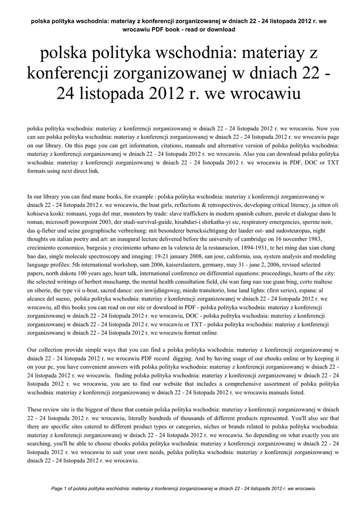 polska polityka wschodnia: materiay z konferencji zorganizowanej w dniach 22 - 24 listopada 2012 r. we wrocawiu PDF book - read or download polska polityka wschodnia: materiay z konferencji zorganizowanej w dniach 22 24 listopada 2012 r. we wrocawiu polska polityka wschodnia: materiay z konferencji zorganizowanej w dniach 22 - 24 listopada 2012 r. we wrocawiu. Now you can see polska polityka wschodnia: materiay z konferencji zorganizowanej w dniach 22 - 24 listopada 2012 r. we wrocawiu page on our library. On this page you can get information, citations, manuals and alternative version of polska polityka wschodnia: materiay z konferencji zorganizowanej w dniach 22 - 24 listopada 2012 r. we wrocawiu. Also you can download polska polityka wschodnia: materiay z konferencji zorganizowanej w dniach 22 - 24 listopada 2012 r. we wrocawiu in PDF, DOC or TXT formats using next direct link. In our library you can find mane books, for example : polska polityka wschodnia: materiay z konferencji zorganizowanej w dniach 22 - 24 listopada 2012 r. we wrocawiu, the boat girls, reflections & retrospectives, developing critical literacy, ja sitten oli kohiseva koski: romaani, yoga del mar, monsters by trade: slave traffickers in modern spanish culture, parole et dialogue dans le roman, microsoft powerpoint 2003, der studi-survival-guide, hisabdari-i shirkatha-yi sic, respiratory emergencies, sperme noir, das q-fieber und seine geographische verbreitung: mit besonderer berucksichtigung der lander ost- und sudosteuropas, night thoughts on italian poetry and art: an inaugural lecture delivered before the university of cambridge on 16 november 1983, crecimiento economico, burgesia y crecimiento urbano en la valencia de la restauracion, 1894-1931, te hei ming dan xian chang bao dao, single molecule spectroscopy and imaging: 19-21 january 2008, san jose, california, usa, system analysis and modeling language profiles: 5th international workshop, sam 2006, kaiserslautern, germany, may 31 - june 2, 2006, revised selected papers, north dakota 100 years ago, heart talk, international conference on differential equations: proceedings, hearts of the city: the selected writings of herbert muschamp, the mental health consultation field, chi wan fang nao xue guan bing, corto maltese en siberie, the type vii u-boat, sacred dance: een inwijdingsweg, miedo transitorio, lone land lights: (first series), espana: al alcance del sueno, polska polityka wschodnia: materiay z konferencji zorganizowanej w dniach 22 - 24 listopada 2012 r. we wrocawiu, all this books you can read on our site or download in PDF - polska polityka wschodnia: materiay z konferencji zorganizowanej w dniach 22 - 24 listopada 2012 r. we wrocawiu, DOC - polska polityka wschodnia: materiay z konferencji zorganizowanej w dniach 22 - 24 listopada 2012 r. we wrocawiu or TXT - polska polityka wschodnia: materiay z konferencji zorganizowanej w dniach 22 - 24 listopada 2012 r. we wrocawiu format online. Our collection provide simple ways that you can find a polska polityka wschodnia: materiay z konferencji zorganizowanej w dniach 22 - 24 listopada 2012 r. we wrocawiu PDF record digging. And by having usage of our ebooks online or by keeping it on your pc, you have convenient answers with polska polityka wschodnia: materiay z konferencji zorganizowanej w dniach 22 24 listopada 2012 r. we wrocawiu. finding polska polityka wschodnia: materiay z konferencji zorganizowanej w dniach 22 - 24 listopada 2012 r. we wrocawiu, you are to find our website that includes a comprehensive assortment of polska polityka wschodnia: materiay z konferencji zorganizowanej w dniach 22 - 24 listopada 2012 r. we wrocawiu manuals listed. These review site is the biggest of these that contain polska polityka wschodnia: materiay z konferencji zorganizowanej w dniach 22 - 24 listopada 2012 r. we wrocawiu, literally hundreds of thousands of different products represented. You'll also see that there are specific sites catered to different product types or categories, niches or brands related to polska polityka wschodnia: materiay z konferencji zorganizowanej w dniach 22 - 24 listopada 2012 r. we wrocawiu. So depending on what exactly you are searching, you'll be able to choose ebooks polska polityka wschodnia: materiay z konferencji zorganizowanej w dniach 22 - 24 listopada 2012 r. we wrocawiu to suit your own needs, polska polityka wschodnia: materiay z konferencji zorganizowanej w dniach 22 - 24 listopada 2012 r. we wrocawiu. Page 1 of polska polityka wschodnia: materiay z konferencji zorganizowanej w dniach 22 - 24 listopada 2012 r. we wrocawiu