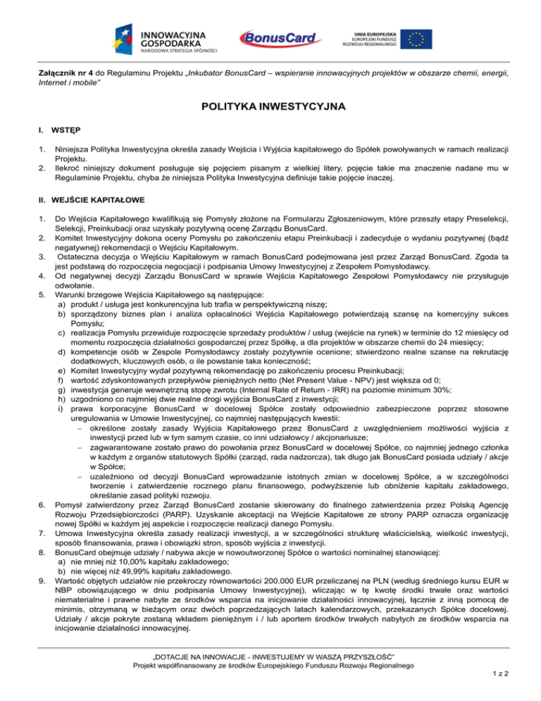 Załącznik nr 4 do Regulaminu Projektu „Inkubator BonusCard – wspieranie innowacyjnych projektów w obszarze chemii, energii, Internet i mobile” POLITYKA INWESTYCYJNA I. 1. 2. WSTĘP Niniejsza Polityka Inwestycyjna określa zasady Wejścia i Wyjścia kapitałowego do Spółek powoływanych w ramach realizacji Projektu. Ilekroć niniejszy dokument posługuje się pojęciem pisanym z wielkiej litery, pojęcie takie ma znaczenie nadane mu w Regulaminie Projektu, chyba że niniejsza Polityka Inwestycyjna definiuje takie pojęcie inaczej. II. WEJŚCIE KAPITAŁOWE 1. 2. 3. 4. 5. 6. 7. 8. 9. Do Wejścia Kapitałowego kwalifikują się Pomysły złożone na Formularzu Zgłoszeniowym, które przeszły etapy Preselekcji, Selekcji, Preinkubacji oraz uzyskały pozytywną ocenę Zarządu BonusCard. Komitet Inwestycyjny dokona oceny Pomysłu po zakończeniu etapu Preinkubacji i zadecyduje o wydaniu pozytywnej (bądź negatywnej) rekomendacji o Wejściu Kapitałowym. Ostateczna decyzja o Wejściu Kapitałowym w ramach BonusCard podejmowana jest przez Zarząd BonusCard. Zgoda ta jest podstawą do rozpoczęcia negocjacji i podpisania Umowy Inwestycyjnej z Zespołem Pomysłodawcy. Od negatywnej decyzji Zarządu BonusCard w sprawie Wejścia Kapitałowego Zespołowi Pomysłodawcy nie przysługuje odwołanie. Warunki brzegowe Wejścia Kapitałowego są następujące: a) produkt / usługa jest konkurencyjna lub trafia w perspektywiczną niszę; b) sporządzony biznes plan i analiza opłacalności Wejścia Kapitałowego potwierdzają szansę na komercyjny sukces Pomysłu; c) realizacja Pomysłu przewiduje rozpoczęcie sprzedaży produktów / usług (wejście na rynek) w terminie do 12 miesięcy od momentu rozpoczęcia działalności gospodarczej przez Spółkę, a dla projektów w obszarze chemii do 24 miesięcy; d) kompetencje osób w Zespole Pomysłodawcy zostały pozytywnie ocenione; stwierdzono realne szanse na rekrutację dodatkowych, kluczowych osób, o ile powstanie taka konieczność; e) Komitet Inwestycyjny wydał pozytywną rekomendację po zakończeniu procesu Preinkubacji; f) wartość zdyskontowanych przepływów pieniężnych netto (Net Present Value - NPV) jest większa od 0; g) inwestycja generuje wewnętrzną stopę zwrotu (Internal Rate of Return - IRR) na poziomie minimum 30%; h) uzgodniono co najmniej dwie realne drogi wyjścia BonusCard z inwestycji; i) prawa korporacyjne BonusCard w docelowej Spółce zostały odpowiednio zabezpieczone poprzez stosowne uregulowania w Umowie Inwestycyjnej, co najmniej następujących kwestii: − określone zostały zasady Wyjścia Kapitałowego przez BonusCard z uwzględnieniem możliwości wyjścia z inwestycji przed lub w tym samym czasie, co inni udziałowcy / akcjonariusze; − zagwarantowane zostało prawo do powołania przez BonusCard w docelowej Spółce, co najmniej jednego członka w każdym z organów statutowych Spółki (zarząd, rada nadzorcza), tak długo jak BonusCard posiada udziały / akcje w Spółce; − uzależniono od decyzji BonusCard wprowadzanie istotnych zmian w docelowej Spółce, a w szczególności tworzenie i zatwierdzenie rocznego planu finansowego, podwyższenie lub obniżenie kapitału zakładowego, określanie zasad polityki rozwoju. Pomysł zatwierdzony przez Zarząd BonusCard zostanie skierowany do finalnego zatwierdzenia przez Polską Agencję Rozwoju Przedsiębiorczości (PARP). Uzyskanie akceptacji na Wejście Kapitałowe ze strony PARP oznacza organizację nowej Spółki w każdym jej aspekcie i rozpoczęcie realizacji danego Pomysłu. Umowa Inwestycyjna określa zasady realizacji inwestycji, a w szczególności strukturę właścicielską, wielkość inwestycji, sposób finansowania, prawa i obowiązki stron, sposób wyjścia z inwestycji. BonusCard obejmuje udziały / nabywa akcje w nowoutworzonej Spółce o wartości nominalnej stanowiącej: a) nie mniej niż 10,00% kapitału zakładowego; b) nie więcej niż 49,99% kapitału zakładowego. Wartość objętych udziałów nie przekroczy równowartości 200.000 EUR przeliczanej na PLN (według średniego kursu EUR w NBP obowiązującego w dniu podpisania Umowy Inwestycyjnej), wliczając w tę kwotę środki trwałe oraz wartości niematerialne i prawne nabyte ze środków wsparcia na inicjowanie działalności innowacyjnej, łącznie z inną pomocą de minimis, otrzymaną w bieżącym oraz dwóch poprzedzających latach kalendarzowych, przekazanych Spółce docelowej. Udziały / akcje pokryte zostaną wkładem pieniężnym i / lub aportem środków trwałych nabytych ze środków wsparcia na inicjowanie działalności innowacyjnej. „DOTACJE NA INNOWACJE - INWESTUJEMY W WASZĄ PRZYSZŁOŚĆ” Projekt współfinansowany ze środków Europejskiego Funduszu Rozwoju Regionalnego 1z2 10. Zapisy Umowy Inwestycyjnej dopuszczają wypłacenie kapitału danej Spółce przez BonusCard w ustalonych transzach. 11. Zespół Pomysłodawcy obejmuje udziały / nabywa akcje w Spółce docelowej o wartości nominalnej określonej w Umowie Inwestycyjnej. Tytułem wkładu na pokrycie udziałów / akcji Zespół Pomysłodawcy jest zobligowany do wniesienia wkładu pieniężnego o wartości, nie mniejszej niż 1% w relacji do wkładu pieniężnego wnoszonego przez BonusCard. 12. Kapitał zakładowy Spółki docelowej musi być pokryty zgodnie ze stosownymi zapisami Ustawy z dnia 15 września 2000r. Kodeks spółek handlowych (Dz. U. z 2000r., Nr 94 poz. 1037 z późniejszymi zmianami). III. MONITOROWANIE, ROZWÓJ, DOKAPITALIZOWANIE SPÓŁKI 1. 2. 3. Monitorowaniem Spółki i udziałem w jej rozwoju zajmuje się Dyrektor Inwestycyjny dedykowany do jej nadzoru właścicielskiego lub inny członek zespołu BonusCard pod nadzorem Dyrektora Inwestycyjnego, który równocześnie może być członkiem jej organów statutowych. BonusCard, na każdym etapie rozwoju danej Spółki, będzie służył pomocą w obszarze kompetencji i know-how zgromadzonego w ramach BonusCard i spółek portfe