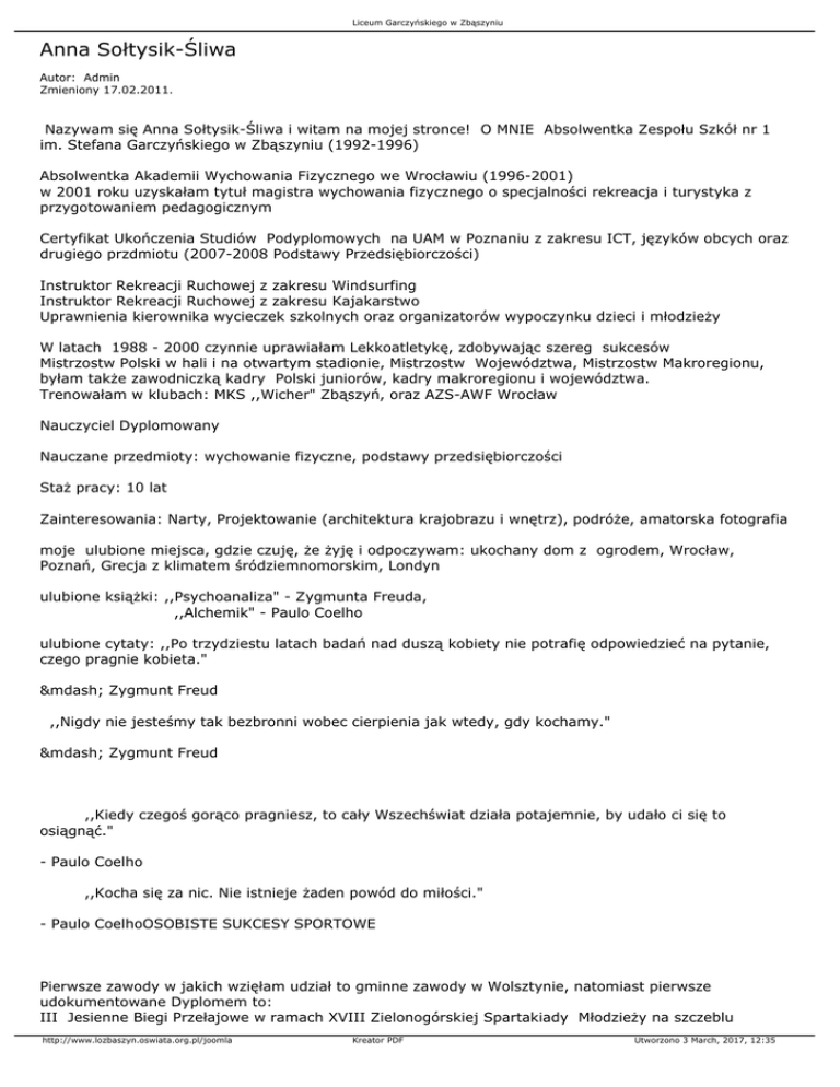 Liceum Garczyńskiego w Zbąszyniu Anna Sołtysik-Śliwa Autor: Admin Zmieniony 17.02.2011. Nazywam się Anna Sołtysik-Śliwa i witam na mojej stronce! O MNIE Absolwentka Zespołu Szkół nr 1 im. Stefana Garczyńskiego w Zbąszyniu (1992-1996) Absolwentka Akademii Wychowania Fizycznego we Wrocławiu (1996-2001) w 2001 roku uzyskałam tytuł magistra wychowania fizycznego o specjalności rekreacja i turystyka z przygotowaniem pedagogicznym Certyfikat Ukończenia Studiów Podyplomowych na UAM w Poznaniu z zakresu ICT, języków obcych oraz drugiego przdmiotu (2007-2008 Podstawy Przedsiębiorczości) Instruktor Rekreacji Ruchowej z zakresu Windsurfing Instruktor Rekreacji Ruchowej z zakresu Kajakarstwo Uprawnienia kierownika wycieczek szkolnych oraz organizatorów wypoczynku dzieci i młodzieży W latach 1988 - 2000 czynnie uprawiałam Lekkoatletykę, zdobywając szereg sukcesów Mistrzostw Polski w hali i na otwartym stadionie, Mistrzostw Województwa, Mistrzostw Makroregionu, byłam także zawodniczką kadry Polski juniorów, kadry makroregionu i województwa. Trenowałam w klubach: MKS ,,Wicher" Zbąszyń, oraz AZS-AWF Wrocław Nauczyciel Dyplomowany Nauczane przedmioty: wychowanie fizyczne, podstawy przedsiębiorczości Staż pracy: 10 lat Zainteresowania: Narty, Projektowanie (architektura krajobrazu i wnętrz), podróże, amatorska fotografia moje ulubione miejsca, gdzie czuję, że żyję i odpoczywam: ukochany dom z ogrodem, Wrocław, Poznań, Grecja z klimatem śródziemnomorskim, Londyn ulubione książki: ,,Psychoanaliza" - Zygmunta Freuda, ,,Alchemik" - Paulo Coelho ulubione cytaty: ,,Po trzydziestu latach badań nad duszą kobiety nie potrafię odpowiedzieć na pytanie, czego pragnie kobieta." — Zygmunt Freud ,,Nigdy nie jesteśmy tak bezbronni wobec cierpienia jak wtedy, gdy kochamy." — Zygmunt Freud ,,Kiedy czegoś gorąco pragniesz, to cały Wszechświat działa potajemnie, by udało ci się to osiągnąć." - Paulo Coelho ,,Kocha się za nic. Nie istnieje żaden powód do miłości." - Paulo CoelhoOSOBISTE SUKCESY SPORTOWE Pierwsze zawody w jakich wzięłam udział to gminne zawody w Wolsztynie, natomiast pierwsze udokumentowane Dyplomem to: III Jesienne Biegi Przełajowe w ramach XVIII Zielonogórskiej Spartakiady Młodzieży na szczeblu http://www.lozbaszyn.oswiata.org.pl/joomla Kreator PDF Utworzono 3 March, 2017, 12:35 Liceum Garczyńskiego w Zbąszyniu gminnym, na których zdobyłam I miejsce był to rok 1987!!! i tak się zaczęło...i tak to sport na ponad 13 lat stał się moją pasją, przygodą oraz sposobem na życie!!! Największe sukcesy, które pamiętam: MISTRZOSTWA POLSKI Wielokrotna Finalistka Mistrzostw Polski w Hali (200m), jak i na Otwartym Stadionie (100m, 300mppł, 400mppł, sztafeta) - najlepszych 8 zawodniczek. Zawodniczka KADRY POLSKI, MAKROREGIONU, WOJEWÓDZTWA - Złoty Medal Mistrzostw Polski w sztafecie: (4x100m), oraz na Akademickich Mistrzostwach Polski w sztafecie 4x200m - Srebrny Medal Mistrzostw Polski na 100m - Srebrny Medal Mistrzostw Polski na 300mppł - 2 x udział w Mistrzostwach Polski jako reprezentacja województwa w 4-boju LA - Ostrołęka, Zielona Góra MISTRZOSTWA WOJEWÓDZTWA ponad 8 razy - Złota Medalistka Mistrzostw Województwa m.in: na dystansach: 60m, 100m, 200mppł, 300m, 300mppł, 400mppł, biegi przełajowe ponad 3 razy - Srebrna Medalistka Mistrzostw Województwa m.in. na dystansach: 100m, 400mppł, wieloboju szybkościowym ppł, Brązowa Medalistka Mistrzostw Województwa w Biegach Przełajowych PLEBISCYT NA NAJLEPSZEGO SPORTOWCA ZBĄSZYNIA 1990 1992 1993 1994 1995 - I miejsce I miejsce I miejsce II miejsce I miejsce Oprócz tego co wyżej był cały szereg startów i sukcesów w zawodach rangi gminnej, powiatu, zawody zagranicą (Francja, Niemcy, Czechy). w rozgrywkach szkolnych reprezentowałam szkołę w takich dysyplinach jak: - tenis stołowy - 2 x III miejsce w Zawodach Ośrodkowych - piłka nożna - III miejsce w Województwie - koszykówka http://www.lozbaszyn.oswiata.org.pl/joomla Kreator PDF Utworzono 3 March, 2017, 12:35
