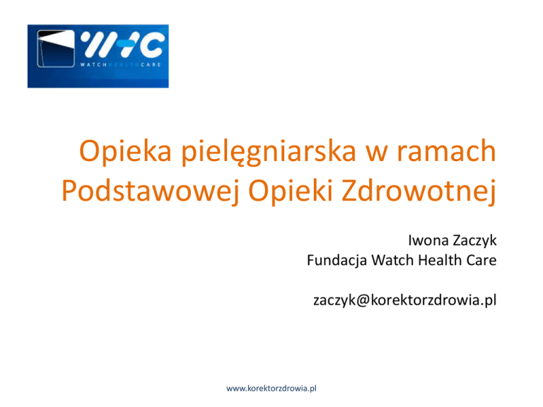 Opieka pielęgniarska w ramach Podstawowej Opieki Zdrowotnej Iwona Zaczyk Fundacja Watch Health Care [email protected] www.korektorzdrowia.pl Kilka słów na początek Do kompetencji pielęgniarki Podstawowej Opieki Zdrowotnej (POZ) należy udzielanie pielęgniarskich świadczeń opieki zdrowotnej w gabinecie pielęgniarki POZ oraz w miejscu zamieszkania pacjenta. Liczba pacjentów objętych opieką przez jedną pielęgniarkę POZ nie powinna przekroczyć 2 750 osób. www.korektorzdrowia.pl Do kogo kierowana jest opieka pielęgniarki POZ??? Pielęgniarka środowiskowa/rodzinna planuje i realizuje kompleksową opiekę pielęgniarską nad jednostką, rodziną, społecznością w środowisku zamieszkania z uwzględnieniem miejsca wykonywania świadczenia obejmując opieką: • zdrowych i chorych niezależnie od płci i wieku • osoby niepełnosprawne, • osoby w stanie terminalnym. www.korektorzdrowia.pl Zakres świadczeń udzielanych przez pielęgniarkę POZ • świadczenia pielęgnacyjne; • świadczenia diagnostyczne; • świadczenia lecznicze • świadczenia rehabilitacyjne; • promocja zdrowia i profilaktyki chorób Szczegółowy wykaz realizowanych świadczeń przez pielęgniarkę POZ można znaleźć w załączniku NFZ „ Wykaz czynności pielęgniarskich wykonywanych w ramach sprawowania pielęgniarskiej opieki środowiskowej” www.korektorzdrowia.pl Dostępność do świadczeń realizowanych w ramach opieki pielęgniarki POZ • Opieką mogą zostać objęci świadczeniobiorcy, którzy ze względu na swój stan zdrowia ( stany poszpitalne, występujące schorzenia przewlekle) wymagają systematycznej opieki pielęgniarskiej; • nie zostali objęci opieką długoterminową stacjonarną; nie kwalifikują się również do opieki hospicjum m domowego lub świadczeń opieki długoterminowej w przypadku konieczności wentylacji mechanicznej; • podstawą zakwalifikowania jest uzyskanie przez 60 pkt w zmodyfikowanej skali Barthel, którą przedstawia kolejny slajd; • niezbędnym warunkiem uzyskania świadczeń jest złożenie deklaracji wyboru pielęgniarki POZ www.korektorzdrowia.pl Skala Barthel www.korektorzdrowia.pl Tryb kierowania do uzyskania świadczeń pielęgniarki POZ Pacjenci mogą zgłaszać się samodzielnie bądź być zgłoszeni do objęcia opieką przez lekarza ubezpieczenia zdrowotnego lub pielęgniarkę POZ, położną, również przez rodzinę, opiekunów lub instytucje. www.korektorzdrowia.pl Zasady udzielania świadczeń przez pielęgniarkę POZ 1. 2. opieka nad pacjentami zakwalifikowanymi do opieki pielęgniarskiej POZ realizowana jest od poniedziałku do piątku, w godzinach od 08.00 do 18.00 ale w sytuacjach uzasadnionych również w sobotę i niedziele, w godzinach uzgodnionych z pacjentem; opieka realizowana jest według planu opieki ustalonego z pacjentem lub jego opiekunem prawnym ( Indywidualny plan opieki opracowany przez pielęgniarkę sprawującą opiekę) www.korektorzdrowia.pl Pielęgniarska opieka środowiskowa w domu pacjenta Pomoc pielęgniarki środowiskowej nie ma ograniczenia czasowego i jest adresowana do osób obłożnie i przewlekle chorych. Jeśli jednak chory potrzebuje na okres dłuższy niż 2 tygodnie dożylnej kroplówki, cewnikowania, zabiegów w przypadku stomii, przetoki; karmienia przez zgłębnik, płukania pęcherza moczowego bądź pielęgnacji ze względu na rurkę tracheotomijną kierowany jest do pielęgniarskiej opieki długoterminowej. www.korektorzdrowia.pl Do kogo kierowana jest opieka długoterminowa??? Tą opieką mogą zostać pacjenci: • chorzy przewlekle; • unieruchomieni z powodu występujących chorób przewlekłych bądź urazu www.korektorzdrowia.pl Tryb kierowania do uzyskania świadczeń realizowanych w ramach opieki długoterminowej Pacjent musi uzyskać od 0 do 40 pkt w skali Barthel oraz dodatkowo wymagać jednego z poniższych świadczeń pielęgniarskich: •Kroplowe wlewy dożylne będące wynikiem stałego zlecenia lekarza ; •Wykonywanie opatrunków na rany, odleżyny bądź występujące owrzodzenia troficzne podudzi; •Karmienie przez zgłębnik bądź przetokę; • pielęgnacja przetoki; •Założenie i usunięcie cewnika wynikające ze stałego zlecenia lekarza; •Płukanie pęcherza moczowego; •Pielęgnacja rurki tracheotomijnej www.korektorzdrowia.pl Warunki uzyskania świadczeń pielęgniarki POZ • Wniosek lekarza POZ lub lekarza prowadzącego pacjenta w ramach opieki szpitalnej, po zakończonej hospitalizacji oraz • Pisemna zgoda pacjenta, • Kwalifikacja pielęgniarska do objęcia opieką długoterminową i potrzeba wykonania u pacjenta jednego z wcześniej wykonanych świadczeń pielęgniarskich www.korektorzdrowia.pl Zasady udzielania świadczeń w ramach pielęgniarskiej opieki długoterminowej • • Opieka obejmuje również: edukacje zdrowotną pacjenta, jego rodziny; oraz pomoc w uzyskaniu potrzebnego sprzętu medycznego lub rehabilitacyjnego Pielęgniarska opieka długoterminowa realizowana jest od poniedziałku do piątku w godzinach od 08.00 do 20.00, a w sytuacjach koniecznych również w soboty, niedziele i dni ustawowo wolne. www.korektorzdrowia.pl Czas trwania pielęgniarskiej opieki długoterminowej Minimalny czas objęcia pielęgniarską opieką długoterminową pacjenta wynosi 1,5 godziny dziennie, jednak nie mniej niż 4 dni w tygodniu. Czas objęcia pacjenta taką formą opieki pielęgniarskiej determinowany jest jego stanem zdrowia, jednak nie może trwać dłuższej niż 6 miesięcy. Co miesiąc pielęgniarka prowadząca opiekę ocenia aktualny stan zdrowia pacjenta i w sytuacji uzyskania przez niego więcej niż 40 pkt w skali Barthel pacjent kierowany jest do opieki pielęgniarki POZ. www.korektorzdrowia.pl Inne formy opieki pielęgniarskiej POZ W ramach Podstawowej Opieki Zdrowotnej jest także nocna i świąteczna ambulatoryjna opieka pielęgniarska w POZ realizowana w przypadku nagłego zachorowania lub nagłego pogorszenia stanu zdrowia ora
