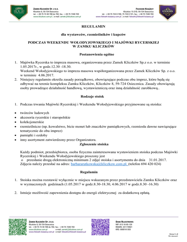 ZAMEK KLICZKÓW SP. Z O.O. FOLWARK KSIĄŻĘCY Kliczków 8, 59-724 Osiecznica tel.: +48 75 73 40 700 do 702, fax.: +48 75 7340 703 www.kliczkow.com.pl | e-mail: [email protected] Kliczków 15-21D, 59-724 Osiecznica tel.: +48 75 734 0 700, 75 734 0 721, fax.: +48 75 7340 703 www.folwark-ksiazecy.com.pl | e-mail: [email protected] REGULAMIN dla wystawców, rzemieślników i kupców PODCZAS WEEKENDU WOŁODYJOWSKIEGO I MAJÓWKI RYCERSKIEJ W ZAMKU KLICZKÓW Postanowienia ogólne 1. Majówka Rycerska to impreza masowa, organizowana przez Zamek Kliczków Sp.z o.o. w terminie 1.05.2017r., w godz.12.30 -18.30. Weekend Wołodyjowskiego to impreza masowa współorganizowana przez Zamek Kliczków Sp. z o.o. w terminie 4.06.2017. 2. Niniejszy regulamin określa zasady porządkowe, obowiązujące podczas obu imprez, które będą się odbywać na terenie kompleksu Zamku Kliczków, Kliczków 8, 59-724 Osiecznica. Zasady obowiązują osoby prowadzące działalność handlową, wystawienniczą oraz inną działalność zarobkową.. Rodzaje stoisk 1. Podczas trwania Majówki Rycerskiej i Weekendu Wołodyjowskiego przyjmowane są stoiska: twórców ludowych akcesoria rycerskie i staropolskie kolekcjonerskie rzemieślnicze (np.:kowalstwo, bicie monet lub znaczków pamiątkowych, rzemiosła dawne nawiązujące tematycznie do obu imprez) pamiątki i ozdoby inny asortyment zatwierdzony przez Organizatora. Zgłoszenie stoiska Każdy podmiot, przedsiębiorca, osoba fizyczna zainteresowana wystawieniem stoiska podczas Majówki Rycerskiej i Weekendu Wołodyjowskiego proszony jest o przesłanie drogą elektroniczną minimum 2 zdjęć stoiska i asortymentu do dnia 31.01.2017. Zdjęcia należy przesłać na adres: [email protected]. (telefon 694 420 024) Regulamin 1. Stoiska można rozstawić wyłącznie w miejscu wskazanym przez przedstawiciela Zamku Kliczków oraz w wyznaczonych godzinach (1.05.2017 w godz.8.30-18.30, 4.06.2017 w godz.8.30 -16.30) 2. Istnieje możliwość zapewnienia dostępu do energii elektrycznej za dodatkową opłatą. ZAMEK KLICZKÓW SP. Z O.O. DANE REJESTROWE: Kliczków 8, 59-724 Osiecznica tel.: +48 75 73 40 700 do 702, fax.: +48 75 7340 703 www.kliczkow.com.pl e-mail: [email protected] www.folwark-ksiazecy.com.pl e-mail: [email protected] NIP: 612-16-85-129 REGON: 231170921 KRS: 0000161303 Strona 1 z 2 Plik: dokument1 ZAMEK KLICZKÓW SP. Z O.O. Kliczków 8, 59-724 Osiecznica tel.: +48 75 73 40 700 do 702, fax.: +48 75 7340 703 www.kliczkow.com.pl | e-mail: [email protected] FOLWARK KSIĄŻĘCY Kliczków 15-21D, 59-724 Osiecznica tel.: +48 75 734 0 700, 75 734 0 721, fax.: +48 75 7340 703 www.folwark-ksiazecy.com.pl | e-mail: [email protected] 3. Sposób zagospodarowania oraz użytkowania stoiska musi być zgodny z obowiązującymi przepisami, w szczególności BHP i przeciw pożarowymi i nie może stwarzać zagrożenia dla osób lub mienia oraz nie może uniemożliwiać lub utrudniać: -- użytkowania stanowisk przez innych uczestników - korzystania z wytyczonych dróg wewnętrznych, - wykonywania obowiązków przez obsługę Zamku. 4. Zamek Kliczków nie ponosi żadnej odpowiedzialności za szkody i przedmioty pozostawione na stoisku. 5. Parkowanie na terenie należącym do Zamku dozwolone jest wyłącznie w miejscach wyznaczonych przez pracownika Zamku, a w szczególności nie dopuszcza się parkowania pojazdów przy stoiskach. 6. Po demontażu stoiska należy pozostawić po sobie należyty porządek, w szczególności usunąć śmieci, puste kartony itp. 7. Kwestie natury formalno-prawnej związane ze sprzedażą produktów, tj. zezwolenia, koncesje, licencje, podatki, leżą wyłącznie po stronie handlującego. Jednocześnie każdy winien ubezpieczyć swoją działalność, w tym posiadane mienie we własnym zakresie. 8. Organizator nie ponosi odpowiedzialności za: - produkty i eksponaty przechowywane na stoisku handlowym - za szkody powstałe na osobie (a także osób współpracujących) lub mieniu spowodowane kradzieżą oraz zdarzeniami losowymi, takimi jak wichura, deszcze, ogień, eksplozje, zalanie wodą, a także szkody wynikłe z przerwy w dostawie prądu. ZAMEK KLICZKÓW SP. Z O.O. DANE REJESTROWE: Kliczków 8, 59-724 Osiecznica tel.: +48 75 73 40 700 do 702, fax.: +48 75 7340 703 www.kliczkow.com.pl e-mail: [email protected] www.folwark-ksiazecy.com.pl e-mail: [email protected] NIP: 612-16-85-129 REGON: 231170921 KRS: 0000161303 Strona 2 z 2 Plik: dokument1