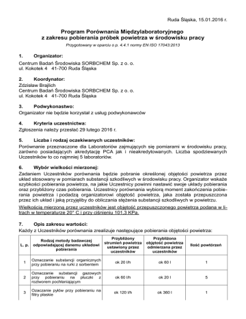 Ruda Śląska, 15.01.2016 r. Program Porównania Międzylaboratoryjnego z zakresu pobierania próbek powietrza w środowisku pracy Przygotowany w oparciu o p. 4.4.1 normy EN ISO 17043:2013 1. Organizator: Centrum Badań Środowiska SORBCHEM Sp. z o. o. ul. Kokotek 4 41-700 Ruda Śląska 2. Koordynator: Zdzisław Brajlich Centrum Badań Środowiska SORBCHEM Sp. z o. o. ul. Kokotek 4 41-700 Ruda Śląska 3. Podwykonastwo: Organizator nie będzie korzystał z usług podwykonawców 4. Kryteria uczestnictwa: Zgłoszenia należy przesłać 29 lutego 2016 r. 5. Liczba i rodzaj oczekiwanych uczestników: Porównanie przeznaczone dla Laboratoriów zajmujących się pomiarami w środowisku pracy, zarówno posiadających akredytację PCA jak i nieakredytowanych. Liczba spodziewanych Uczestników to co najmniej 5 laboratoriów. 6. Wybór wielkości mierzonej: Zadaniem Uczestników porównania będzie pobranie określonej objętości powietrza przez układ stosowany w pomiarach substancji szkodliwych w środowisku pracy. Organizator wskaże szybkości pobierania powietrza, na jakie Uczestnicy powinni nastawić swoje układy pobierania oraz przybliżony czas pobierania. Uczestnicy porównania wybiorą moment zakończenia pobierania powietrza i podadzą organizatorowi objętość powietrza, jaka została przepuszczona przez ich układ i jaką przyjęliby do obliczania stężenia substancji szkodliwych w powietrzu. Wielkością mierzoną przez uczestników jest objętość przepuszczonego powietrza podana w litrach w temperaturze 20° C i przy ciśnieniu 101,3 KPa. 7. Opis zakresu wartości: Każdy z Uczestników porównania zrealizuje następujące pobierania objętości powietrza: L. p. Rodzaj metody badawczej odpowiadającej danemu układowi pobierania Przybliżony strumień powietrza ustawiony przez uczestników Przybliżona objętość powietrza odmierzana przez uczestników Ilość powtórzeń 1 Oznaczanie substancji organicznych przy pobieraniu na rurki z sorbentem ok 20 l/h ok 60 l 1 2 Oznaczanie substancji gazowych przy pobieraniu na płuczki z roztworem pochłaniającym ok 60 l/h ok 20 l 5 3 Ozaczanie pyłów przy pobieraniu na filtry płaskie ok 120 l/h ok 360 l 1 8. Wartości przypisane i potencjalne główne źródła błędów Podane przez Uczestników wartości, zostaną porównane z wartościami przypisanymi odczytanymi przez Organizatora z wzorca odniesienia. Użytym wzorcem odniesienia będzie wzorcowany gazomierz. Wykonany przez Uczestników pomiar narażony jest na błędy spowodowane: 9. – ustawieniem strumienia objętości powietrza płynącego przez układ pomiarowy – stabilnością strumiania objętości powietrza płynącego przez układ pomiarowy w trakcie trwania przepuszczania powietrza do chwili zatrzymania układu – dokładnością odmierzenia czasu pobierania przez Uczestników Wymagania dotyczące obiektu porównania międzylaboratoryjnego Porównanie zostanie przeprowadzone w stabilnych warunkach atmosferycznych (typowe warunki pokojowe) monitorowanych przez Organizatora, zgodnie z jego procedurami jakościowymi. Stosowany wzorzec odniesienia posiada parametry stabilne w czasie, kontrolowane przez organizatora każdego dnia prowadzonych porównań. 10. Środki zapobiegania zmowie pomiędzy uczestnikami Każdy z Uczestników porównania wykonuje pobieranie objętości powietrza niezależnie, a wartość przypisana jest znana wyłącznie Organizatorowi. Wartości zmierzone i podane przez Uczestnika będą zapisywane bezpośrednio po zakończeniu pobierania objętości powietrza w protokole prowadzonym przez Uczestnika. Wartość przypisana będzie zczytana przez Organizatora po zakończeniu danego pobierania z wzorca odniesienia znajdującego się w zamkniętej komorze, bez obecności Uczestnika i zapisana w protokole prowadzonym przez Organizatora. Poszczególni Uczestnicy nie mają możliwości oraz interesu w informowaniu o wynikach innych Uczestników przed ogłoszeniem rezultatów porównania międzylaboratoryjnego. 11. Harmonogram realizacji kolejnych etapów programu Poszczególni Uczestnicy porównania otrzymają swoje numery kodowe i będą zapraszani indywidualnie do miejsca organizacji porównania (do siedziby organizatora), zgodnie z zaplanowanym przez Organizatora terminarzem. Badania rozpoczną się 7-go marca 2016 r. i będą trwały przez kolejne dni, zależnie od ilości zgłoszonych Uczestników. Wartości zmierzone przez Uczestnika, zanotowane w protokołach, będą przekazywane Organizatorowi od razu po wykonaniu przez Uczestnika wszystkich pobierań. Termin wykonania przez Organizatora analizy statystycznej rezultatów oraz opracowania raportów z porównania międzylaboratoryjnego to maksymalnie trzy tygodnie od zakończenia etapu eksperymentalnego. 12. Informacje o metodach lub procedurach, potrzebne uczestnikom do przeprowadzenia pomiarów Dla zachowania jak najlepszej reprezentatywności porównania międzylaboratoryjnego z rzeczywistymi pomiarami w środowisku pracy, Uczestnicy przygotują swoje układy pomiarowe w sposób identyczny z tym, jaki składa się na zestaw stosowany podczas rutynowej pracy. Dla odzwierciedlenia warunków przy poborze układ pomiarowy będzie składał się z odpowiedniego urządzenia zasysającego, wężyków oraz próbników uzależnionych od danego sposobu oznaczania, które podpięte zostaną szeregowo w układ, razem ze wzorcem odniesienia Organizatora. Procedura przygotowania przez Uczestników układu do porównania międzylaboratoryjnego będzie analogiczna do tej stosowanej rutynowo podczas pomiarów (np. sprawdzanie strumienia objętości powietrza przed i po pobieraniu), zgodnie z procedurami danego Uczestnika. Uczestnicy wykonują pomiary wyłącznie na posiadanych przez siebie przyrządach (Organizator zapewnia tylko niedostępny dla Uczestników wzorzec odniesienia, który podpina się do układu). Do poszczególnych pobierań Uczestnicy przygotują następujące próbniki: 13. L. p. Rodzaj metody ba