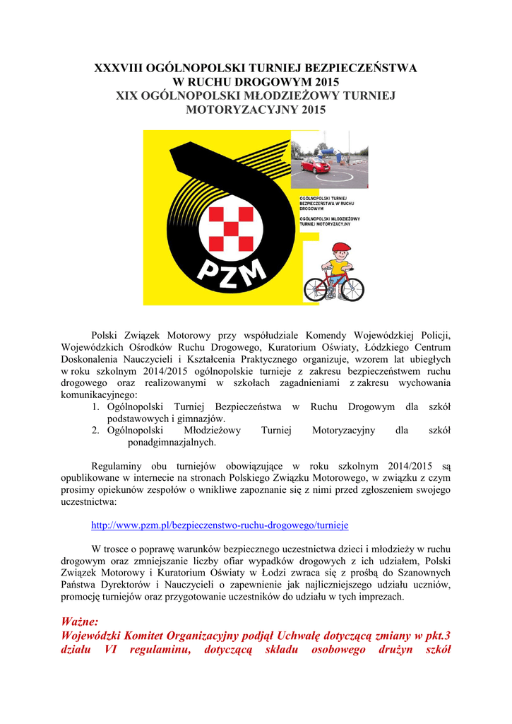 XXXVIII OGÓLNOPOLSKI TURNIEJ BEZPIECZEŃSTWA W RUCHU DROGOWYM 2015 XIX OGÓLNOPOLSKI MŁODZIEŻOWY TURNIEJ MOTORYZACYJNY 2015 Polski Związek Motorowy przy współudziale Komendy Wojewódzkiej Policji, Wojewódzkich Ośrodków Ruchu Drogowego, Kuratorium Oświaty, Łódzkiego Centrum Doskonalenia Nauczycieli i Kształcenia Praktycznego organizuje, wzorem lat ubiegłych w roku szkolnym 2014/2015 ogólnopolskie turnieje z zakresu bezpieczeństwem ruchu drogowego oraz realizowanymi w szkołach zagadnieniami z zakresu wychowania komunikacyjnego: 1. Ogólnopolski Turniej Bezpieczeństwa w Ruchu Drogowym dla szkół podstawowych i gimnazjów. 2. Ogólnopolski Młodzieżowy Turniej Motoryzacyjny dla szkół ponadgimnazjalnych. Regulaminy obu turniejów obowiązujące w roku szkolnym 2014/2015 są opublikowane w internecie na stronach Polskiego Związku Motorowego, w związku z czym prosimy opiekunów zespołów o wnikliwe zapoznanie się z nimi przed zgłoszeniem swojego uczestnictwa: http://www.pzm.pl/bezpieczenstwo-ruchu-drogowego/turnieje W trosce o poprawę warunków bezpiecznego uczestnictwa dzieci i młodzieży w ruchu drogowym oraz zmniejszanie liczby ofiar wypadków drogowych z ich udziałem, Polski Związek Motorowy i Kuratorium Oświaty w Łodzi zwraca się z prośbą do Szanownych Państwa Dyrektorów i Nauczycieli o zapewnienie jak najliczniejszego udziału uczniów, promocję turniejów oraz przygotowanie uczestników do udziału w tych imprezach. Ważne: Wojewódzki Komitet Organizacyjny podjął Uchwałę dotyczącą zmiany w pkt.3 działu VI regulaminu, dotyczącą składu osobowego drużyn szkół podstawowych z czteroosobowych na trzyosobowe i w związku z powyższym w XXXVIII Turnieju BRD dla szkół podstawowych na terenie województwa łódzkiego w wyniku eliminacji szkolnych tworzone mają być trzyosobowe drużyny danej szkoły reprezentujące ją w dalszych etapach turnieju. W przypadku szkół aspirujących do finału ogólnopolskiego i europejskiego opiekunowie drużyn mogą przygotowywać zespół w składzie 4 osobowym /2+2/ w wieku określonym w regulaminie turnieju dz.VI pkt 3.3. XXXVIII Ogólnopolski Turniej Bezpieczeństwa w Ruchu Drogowym 2015r. Terminy poszczególnych eliminacji: eliminacje klasowe/szkolne do końca marca, eliminacje powiatowe – 29 kwietnia 2015 r.(środa) Karty zgłoszeń szkolnych zespołów do eliminacji powiatowych powinny być przesłane do dnia 22 kwietnia 2015 r. (środa, decyduje data stempla pocztowego) odpowiednio do komend powiatowych Policji w danym powiecie odpowiedzialnych za przeprowadzenie eliminacji powiatowych. Uwaga: szkoły z terenu miasta Łodzi zgłoszenia do finału powiatowego przesyłają do Kuratorium Oświaty w Łodzi – sekretariat Wydziału Nadzoru Pedagogicznego, pok. 202, fax. (42) 636 - 61- 06 eliminacje miejskie Turnieju BRD na terenie Łodzi odbędą się 29 kwietnia 2015 r. (środa) na terenie -Motodromu przy ul. Drewnowskiej 147 Poszczególne komendy powiatowe określą miejsce eliminacji powiatowych Turnieju BRD oraz poinformują zainteresowane szkoły. Eliminacje wojewódzkie dla szkół podstawowych i gimnazjów Turnieju Bezpieczeństwa w Ruchu Drogowym odbędą się 08 maja 2015 r. (piątek) na terenie Wojewódzkiego Ośrodka Ruchu Drogowego w Piotrkowie Trybunalskim ul, Gliniana 17 XXXVIII Finał Ogólnopolskiego Turnieju Bezpieczeństwa w Ruchu Drogowym dla szkół podstawowych 8-10 czerwca 2015 Włoszczowa XXXVIII Finał Ogólnopolskiego Turnieju Bezpieczeństwa w Ruchu Drogowym dla szkół gimnazjalnych 10-12 czerwca 2015 Włoszczowa XIX Ogólnopolski Młodzieżowy Turniej Motoryzacyjny 2015r. Szkoły przesyłają zgłoszenia do eliminacji regionalnych w terminach podanych poniżej do Kuratorium Oświaty w Łodzi, sekretariat Wydziału Nadzoru Pedagogicznego, pok. 202 fax. (42) 636 - 61- 06 lub do odpowiedniej Delegatury Kuratorium Oświaty dla wskazanego poniżej terenu danego powiatu Wymienione regiony odpowiadają zakresom działania Wojewódzkich Ośrodków Ruchu Drogowego. Szkoły: - z Łodzi oraz powiatów: zgierskiego, łódzkiego wschodniego, pabianickiego, (WORD - - - w Łodzi); - zgłoszenia do WNP Kuratorium Oświaty w Łodzi w terminie do 10.04.2015r, z Piotrkowa Trybunalskiego oraz powiatów: piotrkowskiego, bełchatowskiego, radomszczańskiego, opoczyńskiego, tomaszowskiego, (WORD w Piotrkowie Trybunalskim); - zgłoszenia do Delegatury Kuratorium Oświaty w Piotrkowie Trybunalskim w terminie do 10.04.2015r, ze Skierniewic oraz powiatów: skierniewickiego, rawskiego, łowickiego, kutnowskiego, łęczyckiego i brzezińskiego, (WORD w Skierniewicach); - zgłoszenia do Delegatury Kuratorium Oświaty w Skierniewicach, w terminie do 10 .04.2014r - z powiatów: sieradzkiego, wieruszowskiego, wieluńskiego, pajęczańskiego, zduńskowolskiego, poddębickiego i łaskiego (WORD w Sieradzu); - zgłoszenia do Delegatury Kuratorium Oświaty w Sieradzu w terminie do 10.04.2015r. Zmiany: Uwaga szkoły mogą wystawić tylko po jednej drużynie z danego typu szkoły (dotyczy szkół zawodowych i liceów). Eliminacje regionalne Ogólnopolskiego Młodzieżowego Turnieju Motoryzacyjnego będą przeprowadzone w dniu 17 kwietnia /piątek/ 2015 r. W Łodzi eliminacje będą przeprowadzone na terenie – Motodromu ul. Drewnowska 147 Finał wojewódzki Ogólnopolskiego Młodzieżowego Turnieju Motoryzacyjnego odbędzie się 22 maja 2015 r. (piątek). WORD w Skierniewicach ul. Kaczyńskiego 7 XIX Finał Ogólnopolskiego Młodzieżowego Turnieju Motoryzacyjnego 12-13 czerwiec 2015 Żarnowiec Prosimy o podanie dokładnych adresów emaliowych szkoły lub opiekuna w zgłoszeniu- w celu poinformowania i przekazania harmonogramu turnieju finałowego. Informujemy również, że w przypadku nie otrzymania informacji do szkoły w terminie 7 dni przed planowanym terminem imprezy prosimy o zainteresowanie opiekunów i kontakt z Zarządem Okręgowym ZO PZM w Łodzi Kontakt ze strony Zarządu Okręgowego Polskiego Związ