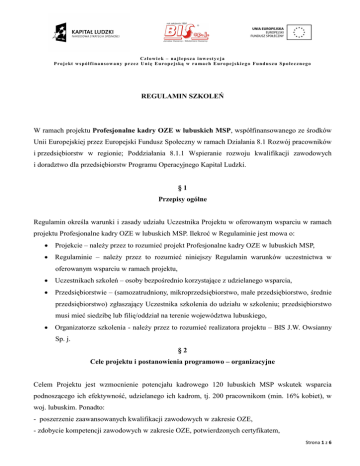 Człowiek – najlepsza inwestycja P r o j e kt w s p ó ł f i n a n s o w a n y p r z e z U n i ę E u r o p e j s ką w r a ma c h E u r o p e j s ki e g o F u n d u s z u S p o ł e c z n e g o REGULAMIN SZKOLEŃ W ramach projektu Profesjonalne kadry OZE w lubuskich MSP, współfinansowanego ze środków Unii Europejskiej przez Europejski Fundusz Społeczny w ramach Działania 8.1 Rozwój pracowników i przedsiębiorstw w regionie; Poddziałania 8.1.1 Wspieranie rozwoju kwalifikacji zawodowych i doradztwo dla przedsiębiorstw Programu Operacyjnego Kapitał Ludzki. §1 Przepisy ogólne Regulamin określa warunki i zasady udziału Uczestnika Projektu w oferowanym wsparciu w ramach projektu Profesjonalne kadry OZE w lubuskich MSP. Ilekroć w Regulaminie jest mowa o: • Projekcie – naleŜy przez to rozumieć projekt Profesjonalne kadry OZE w lubuskich MSP, • Regulaminie – naleŜy przez to rozumieć niniejszy Regulamin warunków uczestnictwa w oferowanym wsparciu w ramach projektu, • Uczestnikach szkoleń – osoby bezpośrednio korzystające z udzielanego wsparcia, • Przedsiębiorstwie – (samozatrudniony, mikroprzedsiębiorstwo, małe przedsiębiorstwo, średnie przedsiębiorstwo) zgłaszający Uczestnika szkolenia do udziału w szkoleniu; przedsiębiorstwo musi mieć siedzibę lub filię/oddział na terenie województwa lubuskiego, • Organizatorze szkolenia - naleŜy przez to rozumieć realizatora projektu – BIS J.W. Owsianny Sp. j. §2 Cele projektu i postanowienia programowo – organizacyjne Celem Projektu jest wzmocnienie potencjału kadrowego 120 lubuskich MSP wskutek wsparcia podnoszącego ich efektywność, udzielanego ich kadrom, tj. 200 pracownikom (min. 16% kobiet), w woj. lubuskim. Ponadto: - poszerzenie zaawansowanych kwalifikacji zawodowych w zakresie OZE, - zdobycie kompetencji zawodowych w zakresie OZE, potwierdzonych certyfikatem, Strona 1 z 6 Człowiek – najlepsza inwestycja P r o j e kt w s p ó ł f i n a n s o w a n y p r z e z U n i ę E u r o p e j s ką w r a ma c h E u r o p e j s ki e g o F u n d u s z u S p o ł e c z n e g o - podniesienie samooceny i wzrost motywacji zawodowych, w tym niwelowanie róŜnic między kobietami i męŜczyznami zatrudnianymi na podobnych stanowiskach przez wzmocnienie kwalifikacji kobiet. ZałoŜenia organizacyjne: Projekt jest realizowany od 02.11.2013 r. do 31.03.2015 r. Obszarem działania jest województwo lubuskie. Zakres dotyczy świadczenia usług szkoleniowych dotyczących rozwiązań proekologicznych w zakresie odnawialnych źródeł energii. Mianowicie: ŚcieŜka A: FOTOWOLTAIKA 1. CZĘŚĆ WSPÓLNA (22h) - moduł wprowadzający (10h) - moduł administracyjno - społeczny (12h) 2. CZĘŚĆ SPECJALIZACYJNA (40h) 3. CZĘŚĆ ZALICZENIOWA – egzamin końcowy – uzyskanie certyfikatu ŚcieŜka B: BIOGAZOWNIE 1. CZĘŚĆ WSPÓLNA (22h) - moduł wprowadzający (10h) - moduł administracyjno - społeczny (12h) 2. CZĘŚĆ SPECJALIZACYJNA (40h) 3. CZĘŚĆ ZALICZENIOWA – egzamin końcowy – uzyskanie certyfikatu ŚcieŜka C: SYSTEMY WIATROWE 1. CZĘŚĆ WSPÓLNA (22h) - moduł wprowadzający (10h) - moduł administracyjno - społeczny (12h) 2. CZĘŚĆ SPECJALIZACYJNA (40h) 3. CZĘŚĆ ZALICZENIOWA – egzamin końcowy – uzyskanie certyfikatu Strona 2 z 6 Człowiek – najlepsza inwestycja P r o j e kt w s p ó ł f i n a n s o w a n y p r z e z U n i ę E u r o p e j s ką w r a ma c h E u r o p e j s ki e g o F u n d u s z u S p o ł e c z n e g o Nauka będzie odbywać się w grupach liczących 10 osób. Szkolenia będą realizowane w czasie i miejscu określonym przez Organizatora Szkolenia w harmonogramie szkoleń, w salach przystosowanych do specyfiki zajęć. Harmonogramy szkoleń będą ustalane w oparciu o moŜliwości operacyjne firm i ich kadry. Zajęcia będą prowadzone przez wykładowców zweryfikowanych przez Organizatora Szkolenia, posiadających udokumentowaną wiedzę, doświadczenie trenerskie oraz praktyczną znajomość problematyki/branŜy. Metody szkoleniowe obejmują wykłady, warsztaty, analizę przypadków, ćwiczenia umiejętności i interaktywność zajęć intensyfikujące przekaz wiedzy. Uczestnicy otrzymają: - profesjonalne materiały edukacyjne adekwatne do programu szkolenia i zakresu egzaminu certyfikacyjnego, - poczęstunek, - zaświadczenie o ukończeniu szkolenia i właściwy certyfikat. §3 Uczestnicy szkoleń 1. Do udziału w projekcie upowaŜnione mikroprzedsiębiorstw, małych przedsiębiorstw i współwłaściciel, wspólnik przedsiębiorstwa lub są osoby samozatrudnione, pracownicy średnich przedsiębiorstw (tj. właściciel, osoba delegowana na szkolenie przez Przedsiębiorstwo, przy czym moŜe być to tylko pracownik wydelegowany przez swojego pracodawcę na szkolenie), nie korzystające do czasu ogłoszenia konkursu ze wsparcia szkoleniowego udzielanego z EFS w latach 2007 - 2012. Za pracowników uznawane są osoby pracujące dla przedsiębiorstwa, podlegające mu i uwaŜane za pracowników na mocy prawa krajowego, zatrudnieni na umowę o pracę na czas określony lub czas nieokreślony (z wyłączeniem pracowników będących w okresie wypowiedzenia oraz zatrudnionych na podstawie umów cywilno-prawnych). 2. Projekt zakłada objęcie wsparciem 200 pracowników, w tym 80 osób samozatrudnionych, 60 pracowników z zatrudnionych w mikroprzedsiębiorstwach, 40 pracowników zatrudnionych w małych przedsiębiorstwach , 20 pracowników zatrudnionych w średnich przedsiębiorstwach, w tym co najmniej 32 kobiet. Strona 3 z 6 Człowiek – najlepsza inwestycja P r o j e kt w s p ó ł f i n a n s o w a n y p r z e z U n i ę E u r o p e j s ką w r a ma c h E u r o p e j s ki e g o F u n d u s z u S p o ł e c z n e g o 3. Zgłoszenie uczestników następuje w odpowiedzi na ogłoszony nabór przez Organizatora szkolenia według procedury opisanej w §4. Zgłoszenia dokonuje się na podstawie delegacji przez pracodawcę i zawarcia umowy szkoleniowej. Zgłoszenia do