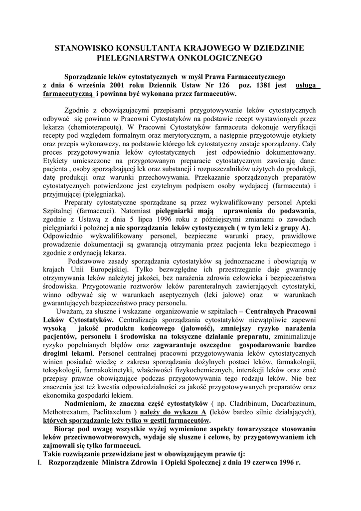 STANOWISKO KONSULTANTA KRAJOWEGO W DZIEDZINIE PIELEGNIARSTWA ONKOLOGICZNEGO Sporządzanie leków cytostatycznych w myśl Prawa Farmaceutycznego z dnia 6 września 2001 roku Dziennik Ustaw Nr 126 poz. 1381 jest usługą farmaceutyczną i powinna być wykonana przez farmaceutów. Zgodnie z obowiązujacymi przepisami przygotowywanie leków cytostatycznych odbywać się powinno w Pracowni Cytostatyków na podstawie recept wystawionych przez lekarza (chemioterapeutę). W Pracowni Cytostatyków farmaceuta dokonuje weryfikacji recepty pod względem formalnym oraz merytorycznym, a następnie przygotowuje etykiety oraz przepis wykonawczy, na podstawie którego lek cytostatyczny zostaje sporządzony. Cały proces przygotowywania leków cytostatycznych jest odpowiednio dokumentowany. Etykiety umieszczone na przygotowanym preparacie cytostatycznym zawierają dane: pacjenta , osoby sporządzającej lek oraz substancji i rozpuszczalników użytych do produkcji, datę produkcji oraz warunki przechowywania. Przekazanie sporządzonych preparatów cytostatycznych potwierdzone jest czytelnym podpisem osoby wydajacej (farmaceuta) i przyjmującej (pielęgniarka). Preparaty cytostatyczne sporządzane są przez wykwalifikowany personel Apteki Szpitalnej (farmaceuci). Natomiast pielęgniarki mają uprawnienia do podawania, zgodnie z Ustawą z dnia 5 lipca 1996 roku z późniejszymi zmianami o zawodach pielęgniarki i położnej a nie sporządzania leków cytostycznych ( w tym leki z grupy A). Odpowiednio wykwalifikowany personel, bezpieczne warunki pracy, prawidłowe prowadzenie dokumentacji są gwarancją otrzymania przez pacjenta leku bezpiecznego i zgodnie z ordynacją lekarza. Podstawowe zasady sporządzania cytostatyków są jednoznaczne i obowiązują w krajach Unii Europejskiej. Tylko bezwzględne ich przestrzeganie daje gwarancję otrzymywania leków należytej jakości, bez narażenia zdrowia człowieka i bezpieczeństwa środowiska. Przygotowanie roztworów leków parenteralnych zawierających cytostatyki, winno odbywać się w warunkach aseptycznych (leki jałowe) oraz w warunkach gwarantujących bezpieczeństwo pracy personelu. Uważam, za słuszne i wskazane organizowanie w szpitalach – Centralnych Pracowni Leków Cytostatyków. Centralizacja sporządzania cytostatyków niewątpliwie zapewni wysoką jakość produktu końcowego (jałowość), zmniejszy ryzyko narażenia pacjentów, personelu i środowiska na toksyczne działanie preparatu, zminimalizuje ryzyko popełnianych błędów oraz zagwarantuje oszczędne gospodarowanie bardzo drogimi lekami. Personel centralnej pracowni przygotowywania leków cytostatycznych winien posiadać wiedzę z zakresu sporządzania dożylnych postaci leków, farmakologii, toksykologii, farmakokinetyki, właściwości fizykochemicznych, interakcji leków oraz znać przepisy prawne obowiązujące podczas przygotowywania tego rodzaju leków. Nie bez znaczenia jest też kwestia odpowiedzialności za jakość przygotowywanych preparatów oraz ekonomika gospodarki lekiem. Nadmieniam, że znaczna część cytostatyków ( np. Cladribinum, Dacarbazinum, Methotrexatum, Paclitaxelum ) należy do wykazu A (leków bardzo silnie działających), których sporządzanie leży tylko w gestii farmaceutów. Biorąc pod uwagę wszystkie wyżej wymienione aspekty towarzyszące stosowaniu leków przeciwnowotworowych, wydaje się słuszne i celowe, by przygotowywaniem ich zajmowali się tylko farmaceuci. Takie rozwiązanie przewidziane jest w obowiązującym prawie tj: I. Rozporządzenie Ministra Zdrowia i Opieki Społecznej z dnia 19 czerwca 1996 r. z późniejszymi zmianami. II. Ustawa Prawo Farmaceutyczne z dnia 6 września 2001 r. (Dz. U. Nr 126 poz. 1381) wprowadziła w rozdziale 7 Art. 86 p. 3 zapis : W odniesieniu do aptek szpitalnych usługą farmaceutyczną jest również: (... ) 3.)przygotowywanie leków w dawkach dziennych, w tym leków cytostatycznych. III. Dyrektywa 91/356/EEC. Przyjęta w 1991 r. Dyrektywa 91/356/EEC ustala zasady i instrukcje Dobrej Praktyki Wytwarzania (GMP) dla produktów farmaceutycznych. Dobra Praktyka Wytwarzania, jako część Systemu Zapewnienia Jakości, gwarantuje, że produkty są zawsze produkowane i kontrolowane wg standardów jakości, odpowiednio do ich zamierzonego użycia i według wymagań zgodnych z dokumentacją. Reasumując: 1. Niezaprzeczalnym jest fakt, że przygotowywanie leków cytostatycznych w dawkach indywidualnych jest usługą farmaceutyczną (art. 86 ust. 3 pkt 3 ustawy z dnia 6 września 2001 roku – Prawo Farmaceutyczne) a nie usługą pielęgniarską (Ustawa o zawodzie pielęgniarki i położnej). 2. Miejscem, w którym świadczone są usługi farmaceutyczne przez osoby uprawnione jest apteka, a nie np. oddział szpitalny (art. 86 ust. 1 w/w ustawy). To apteka świadczy usługi w stosunku do np. oddziałów. 3. Przy wykonywaniu w aptece czynności fachowych (usług farmaceutycznych) mogą być zatrudnieni wyłącznie farmaceuci i technicy farmaceutyczni (art. 90 w/w ustawy). 4. Leki cytostatyczne ze względu na swoje właściwości (karcynogenność, mutagenność, teratogenność i inne) muszą być przygotowywane przez farmaceutów w aptekach szpitalnych. Wiele z nich należy do wykazu A (leków bardzo silnie działających) jak np.: Cyclophosphamidum, Cytarabinum, Dactinomycinum, Dacarbazinum, Doxorubicinum, Fluorouracilum, Vinblastinum, Vincristinum). 5. Roztwory cytostatyków muszą spełniać wymogi stawiane lekom parenteralnym. Muszą być przygotowywane zgodnie z zasadami GMP. 6. Jedynie farmaceuci posiadają merytoryczne przygotowanie do sporządzania leków, w tym parenteralnych. Poza znajomością technik przygotowywania leków (w tym cytostatyków) pozyskiwaną w trakcie studiów farmaceutycznych, posiadają też wiedzę merytoryczną obejmującą znajomość farmakologii, farmakokinetyki, właściwości fizycznochemiczne cytostatyków. Każda z postaci leku (roztwór, liofilizat) wymaga innego sposobu przygot
