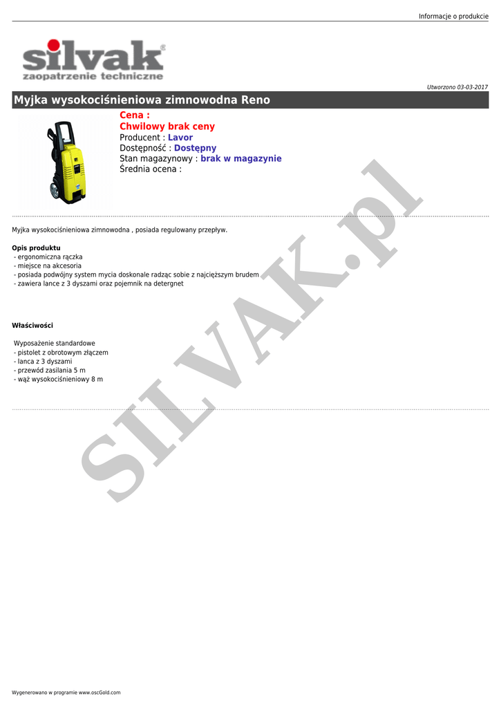 Informacje o produkcie Utworzono 03-03-2017 Myjka wysokociśnieniowa zimnowodna Reno Cena : Chwilowy brak ceny AK .p l Producent : Lavor Dostępność : Dostępny Stan magazynowy : brak w magazynie Średnia ocena : Myjka wysokociśnieniowa zimnowodna , posiada regulowany przepływ. Opis produktu - ergonomiczna rączka - miejsce na akcesoria - posiada podwójny system mycia doskonale radząc sobie z najcięższym brudem - zawiera lance z 3 dyszami oraz pojemnik na detergnet Właściwości SI LV Wyposażenie standardowe - pistolet z obrotowym złączem - lanca z 3 dyszami - przewód zasilania 5 m - wąż wysokociśnieniowy 8 m Wygenerowano w programie www.oscGold.com