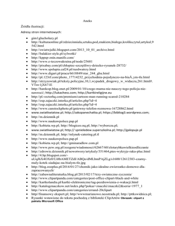 Aneks Źródła ilustracji: Adresy stron internetowych: gim1glucholazy.pl http://kulturaonline.pl/zdziecinniala,sztuka,pod,znakiem,bialego,krolika,tytul,artykul,9 542.html http://swiatwjulki.blogspot.com/2013_10_01_archive.html http://balakier-style.pl/sylwetki/ http://kppsp-znin.manifo.com/ http://www.e-teczowakraina.pl/node/25681 http://pixabay.com/pl/chłopiec-szczęśliwy-dziecko-rysunek-28732/ http://www.spslupia.cal24.pl/razdwatrzy.html http://www.digart.pl/praca/6618849/star_244_gba.html http://pl.123rf.com/photo_17714232_przychodnia-pojedynczo-na-biaÅ‚ym-tle.html http://strzyzowiak.pl/teksty,policyjne,10,1,wypadek_drogowy_w_widaczu,261.html#. VTnv1jX671E http://hardcop.blog.onet.pl/2009/01/10/czego-mama-nie-nauczy-tego-policja-nienawroci/; http://lukachess.com; http://kartkireligijne.eu http://pl.vectorhq.com/premium/cartoon-man-running-scared-210284 http://osp.zajaczki.interka.pl/articles.php?id=4 http://osp.zajaczki.interka.pl/articles.php?id=4 http://www.canstockphoto.pl/gniewny-telefon-rozmowa-16728862.html www.swiatkwiatow.pl; http://zakopanechatka.pl; https://bibliog3.wordpress.com; http://m.dziennik.pl http://www.naukawpolsce.pap.pl http://kobieta.wp.pl; http://blogiceo.nq.pl; http://wyborcza.pl; www.swiatkwiatow.pl; http:// spnieledew.superszkolna.pl; http://galopuje.pl http://m.dziennik.pl; http://mlynek-catering.pl.tl http://www.naukawpolsce.pap.pl http://kobieta.wp.pl; http://gminaradlow.com.pl http://www.pzw.org.pl/zozgora/wiadomosci/62667/60/zlotarybkawielkieodliczanie http://zdrowie.dziennik.pl/nowotwory/artykuly/351464,pies-wykryje-raka-pluc.html http://4.bp.blogspot.com/uUqJhX4OXr0/Ui8bAMETZdI/ABQo/dMLbmPAjZLg/s1600/12612383-czarnymaly-kotek-siadajac-na-bialym-tle.jpg http://blog.zooplus.pl/2014/01/27/chomik-jako-idealne-zwierzatko-domowe-dlazapracowanych/ http://zabawnaliteraturka.blog.pl/2013/02/17/trzy-swiateczne-zyczenia/ http://www.clipartpanda.com/categories/post-office-clipart-black-and-white http://kartkolandia.pl/kartki-elektroniczne/tag-pozdrowienia-z-wakacji.html http://katalogznaczkow.net/index.php?pokaz=znaczki/znaczki2&seria=1977_1 http://www.clipartpanda.com/categories/errand-20clipart http//finansowy ekspert.pl; http//wwwmarianowo.neostrada.pl; http://pttkswidnica.pl; Rysunki wstawione do tekstu pochodzą z biblioteki ClipArtów Obrazek: clipart z pakietu Microsoft Office