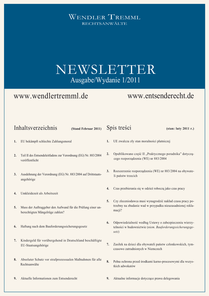 W ENDLER T REMML RECHTSANWÄLTE NEWSLETTER Ausgabe/Wydanie 1/2011 www.entsenderecht.de www.wendlertremml.de Inhaltsverzeichnis (Stand Februar 2011) Spis treści (stan: luty 2011 r.) 1. EU bekämpft schlechte Zahlungsmoral 1. UE zwalcza zły stan moralności płatniczej 2. Teil II des Entsendeleitfadens zur Verordnung (EG) Nr. 883/2004 veröffentlicht 2. Opublikowano część II „Praktycznego poradnika” dotyczącego rozporządzenia (WE) nr 883/2004 3. Ausdehnung der Verordnung (EG) Nr. 883/2004 auf Drittstaatsangehörige 3. Rozszerzenie rozporządzenia (WE) nr 883/2004 na obywateli państw trzecich 4. Czas przebierania się w odzież roboczą jako czas pracy 5. Czy zleceniodawca musi wynagrodzić nakład czasu pracy potrzebny na zbadanie wad w przypadku nieuzasadnionej reklamacji? 6. Odpowiedzialność według Ustawy o zabezpieczeniu wierzytelności w budownictwie (niem. Bauforderungssicherungsgesetz) 4. Umkleidezeit als Arbeitszeit 5. Muss der Auftraggeber den Aufwand für die Prüfung einer unberechtigten Mängelrüge zahlen? 6. Haftung nach dem Bauforderungssicherungsgesetz 7. Kindergeld für vorübergehend in Deutschland beschäftigte EU-Staatsangehörige 7. Zasiłek na dzieci dla obywateli państw członkowskich, tymczasowo zatrudnionych w Niemczech 8. Absoluter Schutz vor strafprozessualen Maßnahmen für alle Rechtsanwälte 8. Pełna ochrona przed środkami karno-procesowymi dla wszystkich adwokatów 9. Aktuelle Informationen zum Entsenderecht 9. Aktualne informacje dotyczące prawa delegowania Seite 2 NEWSLETTER 1/2011 WENDLER TREMML 1. EU bekämpft schlechte Zahlungsmoral 1. UE zwalcza zły stan moralności płatniczej Der Rat der Europäischen Union hat am 24. Januar 2011 eine überarbeitete Richtlinie zur Bekämpfung von Zahlungsverzug im Geschäftsverkehr verabschiedet (Neufassung der Richtlinie 2000/35/EG). Das EU-Parlament hatte die Neufassung der Richtlinie am 20. Oktober 2010 angenommen. Rada Unii Europejskiej uchwaliła w dniu 24 stycznia 2011 roku opracowaną na nowo wersję dyrektywy w sprawie zwalczania opóźnień w płatnościach w transakcjach handlowych (nowa wersja dyrektywy 2000/35/WE). Parlament UE przyjął nową wersję dyrektywy w dniu 20 października 2010 roku. Die Richtlinie legt spezielle Fristen für die Bezahlung von Rechnungen fest. Rechnungen sind danach grundsätzlich sowohl von privaten Unternehmen als auch von öffentlichen Akteuren innerhalb von 30 Tagen zu bezahlen. Öffentliche Auftraggeber haben in Ausnahmefällen bis zu 60 Tage Zeit. Hinzu kommen Säumniszinsen von 8 Prozentpunkten über dem Referenzsatz der Europäischen Zentralbank. Außerdem gibt die Richtlinie ein Recht auf Entschädigung bei Zahlungsverzug im gesamten Geschäftsverkehr - sobald Verzugszinsen anfallen, stehen dem Gläubiger mindestens 40 € zur Deckung der Beitreibungskosten zu. Dieses Recht besteht unabhängig davon, ob der Zahlungsverzug zwischen privaten oder öffentlichen Unternehmen oder zwischen Unternehmen und öffentlichen Stellen eingetreten ist. Dyrektywa przewiduje terminy płatności faktur. Według dyrektywy faktury powinny być regulowane zasadniczo zarówno przez przedsiębiorstwa prywatne jak i publiczne w przeciągu 30 dni. Zleceniodawcy publiczni mogą w wyjątkowych przypadkach wyrównywać faktury w terminie do 60 dni. Do tego dochodzą odsetki za zwłokę w wysokości 8 punktów procentowych powyżej stopy referencyjnej Europejskiego Banku Centralnego. Dyrektywa daje także prawo do ubiegania się o odszkodowanie w przypadku opóźnień w płatnościach we wszystkich transakcjach handlowych – jak tylko wierzycielowi przysługują odsetki, należy mu się też kwota w wysokości co najmniej 40,00 EUR na pokrycie kosztów dochodzenia należności. Roszczenie to istnieje niezależnie od tego, czy opóźnienie w płatności nastąpiło w stosunku pomiędzy prywatnymi lub publicznymi przedsiębiorstwami czy też w stosunku pomiędzy przedsiębiorstwami a władzami publicznymi. Die Richtlinie soll die Zahlungsmoral im europäischen Geschäftsleben verbessern, den Unternehmen Rechtssicherheit geben und ihre Liquidität stärken. Sie erhöht damit den Schutz der Gläubiger und soll zum besseren Funktionieren des EU-Binnenmarktes beitragen. Die Wettbewerbsfähigkeit der Unternehmen, insbesondere von kleinen und mittleren Unternehmen (KMU), soll gefördert werden. 2. Teil II des Entsendeleitfadens zur Verordnung (EG) Nr. 883/2004 veröffentlicht Um eine einheitliche Anwendung der Verordnung (EG) Nr. 883/2004 über die Koordinierung der Sozialversicherungsvorschriften zu erleichtern, hat die Europäische Kommission einen praktischen Leitfaden zu den Rechtsvorschriften, die für Erwerbstätige in der Europäischen Union (EU), im Europäischen Wirtschaftsraum (EWR) und in der Schweiz gelten, herausgegeben. Nachdem zunächst nur Teil I über die Entsendung von Erwerbstätigen veröffentlicht wurde, liegt seit Januar 2011 Teil II über die Tätigkeit eines Arbeitnehmers in zwei oder mehr EU-Mitgliedstaaten in englischer Sprache vor. Die wichtigsten Fragen zur Entsendung und Selbständigkeit in zwei oder mehr Mitgliedstaaten werden beantwortet und anhand von Beispielsfällen erläutert. Den aktuellen Leitfaden in englischer Sprache können Sie sowohl unter der Rubrik „News & Aktuelles“ auf unserer Homepage www.wendlertremml.de sowie auf unserem neuen Informationsportal www.entsenderecht.de aufrufen. Sobald Teil II des Leitfadens auf deutsch bzw. in anderen Sprachen der EU-Mitgliedstaaten Dyrektywa ma polepszyć moralność płatniczą w obrębie europejskich transakcji handlowych, zapewnić przedsiębiorstwom bezpieczeństwo prawne oraz polepszyć ich wypłacalność. Dyrektywa ta zwiększa tym samym ochronę wierzycieli i ma się przyczynić do lepszego funkcjonowania europejskiego rynku wewnętrznego. Ma ona też polepszyć konkurencyjność przedsiębiorstw, zwłaszcza małych i średnich. 2. Opublikowano część II „Praktycznego poradnika” dotyczą