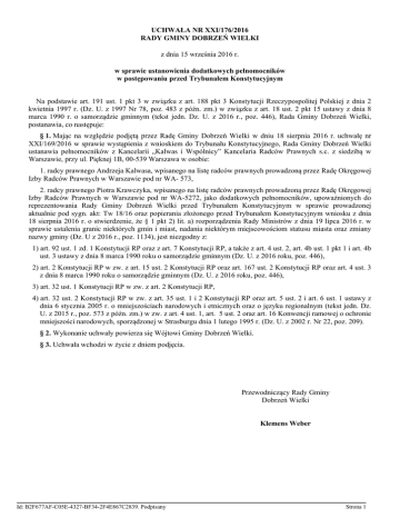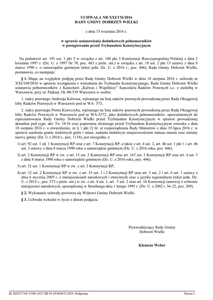 UCHWAŁA NR XXI/176/2016 RADY GMINY DOBRZEŃ WIELKI z dnia 15 września 2016 r. w sprawie ustanowienia dodatkowych pełnomocników w postępowaniu przed Trybunałem Konstytucyjnym Na podstawie art. 191 ust. 1 pkt 3 w związku z art. 188 pkt 3 Konstytucji Rzeczypospolitej Polskiej z dnia 2 kwietnia 1997 r. (Dz. U. z 1997 Nr 78, poz. 483 z późn. zm.) w związku z art. 18 ust. 2 pkt 15 ustawy z dnia 8 marca 1990 r. o samorządzie gminnym (tekst jedn. Dz. U. z 2016 r., poz. 446), Rada Gminy Dobrzeń Wielki, postanawia, co następuje: § 1. Mając na względzie podjętą przez Radę Gminy Dobrzeń Wielki w dniu 18 sierpnia 2016 r. uchwałę nr XXI/169/2016 w sprawie wystąpienia z wnioskiem do Trybunału Konstytucyjnego, Rada Gminy Dobrzeń Wielki ustanawia pełnomocników z Kancelarii „Kalwas i Wspólnicy” Kancelaria Radców Prawnych s.c. z siedzibą w Warszawie, przy ul. Pięknej 1B, 00-539 Warszawa w osobie: 1. radcy prawnego Andrzeja Kalwasa, wpisanego na listę radców prawnych prowadzoną przez Radę Okręgowej Izby Radców Prawnych w Warszawie pod nr WA- 573, 2. radcy prawnego Piotra Krawczyka, wpisanego na listę radców prawnych prowadzoną przez Radę Okręgowej Izby Radców Prawnych w Warszawie pod nr WA-5272, jako dodatkowych pełnomocników, upoważnionych do reprezentowania Rady Gminy Dobrzeń Wielki przed Trybunałem Konstytucyjnym w sprawie prowadzonej aktualnie pod sygn. akt: Tw 18/16 oraz popierania złożonego przed Trybunałem Konstytucyjnym wniosku z dnia 18 sierpnia 2016 r. o stwierdzenie, że § 1 pkt 2) lit. a) rozporządzenia Rady Ministrów z dnia 19 lipca 2016 r. w sprawie ustalenia granic niektórych gmin i miast, nadania niektórym miejscowościom statusu miasta oraz zmiany nazwy gminy (Dz. U z 2016 r., poz. 1134), jest niezgodny z: 1) art. 92 ust. 1 zd. 1 Konstytucji RP oraz z art. 7 Konstytucji RP, a także z art. 4 ust. 2, art. 4b ust. 1 pkt 1 i art. 4b ust. 3 ustawy z dnia 8 marca 1990 roku o samorządzie gminnym (Dz. U. z 2016 roku, poz. 446), 2) art. 2 Konstytucji RP w zw. z art. 15 ust. 2 Konstytucji RP oraz art. 167 ust. 2 Konstytucji RP oraz art. 4 ust. 3 z dnia 8 marca 1990 roku o samorządzie gminnym (Dz. U. z 2016 roku, poz. 446), 3) art. 32 ust. 1 Konstytucji RP w zw. z art. 2 Konstytucji RP, 4) art. 32 ust. 2 Konstytucji RP w zw. z art. 35 ust. 1 i 2 Konstytucji RP oraz art. 5 ust. 2 i art. 6 ust. 1 ustawy z dnia 6 stycznia 2005 r. o mniejszościach narodowych i etnicznych oraz o języku regionalnym (tekst jedn. Dz. U. z 2015 r., poz. 573 z późn. zm.) w zw. z art. 4 ust. 1, art. 5 ust. 2 oraz art. 16 Konwencji ramowej o ochronie mniejszości narodowych, sporządzonej w Strasburgu dnia 1 lutego 1995 r. (Dz. U. z 2002 r. Nr 22, poz. 209). § 2. Wykonanie uchwały powierza się Wójtowi Gminy Dobrzeń Wielki. § 3. Uchwała wchodzi w życie z dniem podjęcia. Przewodniczący Rady Gminy Dobrzeń Wielki Klemens Weber Id: B2F677AF-C05E-4327-BF34-2F4E867C2839. Podpisany Strona 1