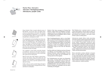 Market Place Alternative Alternative Marktplatzgestaltung Alternatynwy projekt rynku pavement relations Prince Puckler’s Park is located within the town of Bad Muskau. In previous times, the Market Place served as a main entrance to the park. This entrance has been diminished in importance, so it is important to redesign the Market Place to connect people with the park and as a destination in itself. The existing plaza and surroundings have been analysed. This design proposes to reshape the plaza creating one well-defined space. This reshaping will allow a rich texture of experience, giving the sense of space, and adding new events for people, providing the basis of the concept for the marketplace. Parking places have been relocated to the main street in order to maintain the plaza for people. New vegetation, a water surface, and other elements are introduced. On the axis to the park some places have been created for human uses such as small shops and a green area for hotel guests. elements vegetation PROJECTS 28 Special events such as like markets on special days, concerts and cinemas, along with outdoor bars and cafes have been introduced. The design of the plaza includes a row of trees to provide separation for the adjacent housing. Finally, with new activity and the linkage through to the park, the Market Square will again become a lively and attractive marketplace. Pückler’s Park liegt sozusagen im Zentrum Bad Muskaus. Früher diente der Marktplatz als Hauptzugang zum Park, es ist wichtig, ihm diese Funktion wiederzugeben und den Marktplatz selbst zu einem Anziehungspunkt zu machen. Park Pücklera leży w pewnym sensie w samym centrum Bad Muskau. Dawniej główne dojście do Parku prowadziło przez rynek, ważne więc byłoby przywrócenie mu tej funkcji, a sam rynek winien również zyskać na atrakcyjności. Diese Gestaltungsalternative sieht vor, den Marktplatz zu einem klar definierten Raum umzuformen. Die Umformung wird es ermöglichen, den Platz mit einem abwechlsungsreichen Muster zu überziehen und diesen Freiraum für vielfältige Nutzung zur Verfügung zu stellen. Die Parkplätze werden an die Hauptstraße verlegt, um den Platz für Menschen freizuhalten. Alternatywny projekt oblicza rynku przewiduje stworzenie zeń jasno ograniczonej przestrzeni. Sprawi to, że na rynku pojawi się zróżnicowany wzór oraz można będzie różnorodnie użytkować jego przestrzeń. Miejsca parkingowe przeniesione zostaną na Hauptstraße, by przestrzeń rynku pozostała dla ludzi. Rynek wyposażony zostanie w nowe elementy – rośliny, powierzchnię wodną oraz inne elementy łączące. Zaplanowano stworzenie nowych sklepów, a także skwerku przed hotelem. Der Platz erhält neue Funktionen und neue Elemente wie Pflanzen, eine Wasserfläche und weitere verbindende Elemente wurden hinzugefügt. Auf dem Weg sind neue Läden und eine Grünfläche zur Nutzung durch das Hotel geplant. Die Wohnbebauung wird durch eine Baumreihe abge-schirmt. Auf dem Markt sind Wochen- und Themenmärkte, Freiluftkino, Konzerte und Festivitäten geplant. So bekommt dieser Platz wieder einen Stadtplatzcharakter und wird außerdem zu einem besseren Eingang zum Schloßpark und einer guten Verbindung zum Bergpark. Domy mieszkalne zostaną osłonięte szeregiem drzew. Na rynku odbywać się będzie cotygodniowy targ i targi tematyczne, będzie tu miejsce na kino na wolnym powietrzu, koncerty oraz festyny. W ten sposób rynek uzyska ponownie miejski charakter, stanowić będzie rodzaj dojścia do parku pałacowego, a także połączenie z parkiem górskim. 2002 Bad Muskau Market Place 2010 2030 PROJECTS 29
