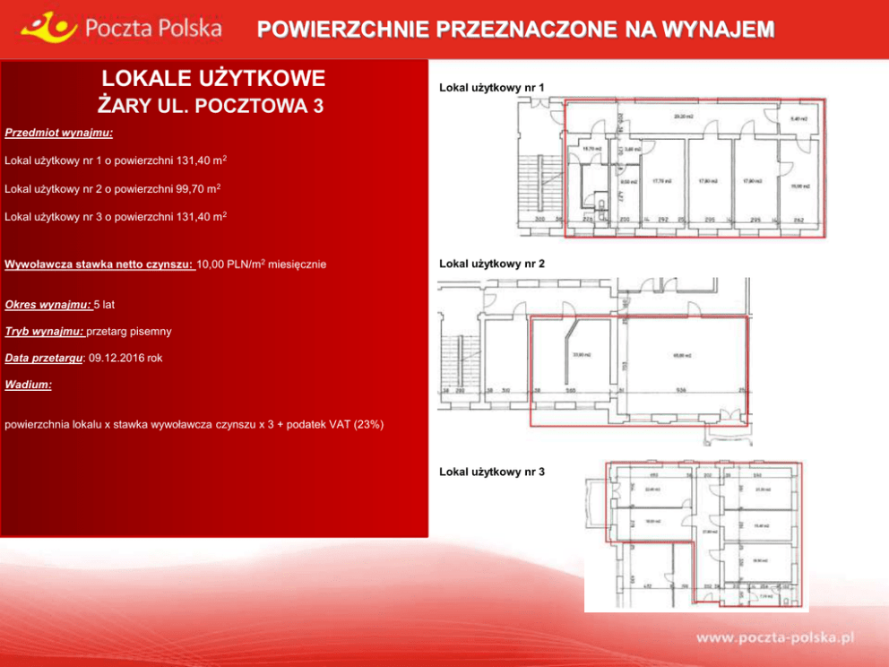 POWIERZCHNIE PRZEZNACZONE NA WYNAJEM - LOKALE UŻYTKOWE ŻARY UL. POCZTOWA 3 Przedmiot wynajmu: Lokal użytkowy Kliknij nr 1 i zlokalizuj na mapie Lokal użytkowy nr 1 o powierzchni 131,40 m 2 Lokal użytkowy nr 2 o powierzchni 99,70 m 2 Lokal użytkowy nr 3 o powierzchni 131,40 m2 Wywoławcza stawka netto czynszu: 10,00 PLN/m2 miesięcznie Lokal użytkowy nr 2 Okres wynajmu: 5 lat Tryb wynajmu: przetarg pisemny Data przetargu: 09.12.2016 rok Wadium: powierzchnia lokalu x stawka wywoławcza czynszu x 3 + podatek VAT (23%) Lokal użytkowy nr 3 Opis przedmiotu wynajmu: Lokal Użytkowy nr 1 Korytarz na powierzchnię 131,40 m2, składa się 10 pomieszczeń: 2 pomieszczenia WC o łącznej powierzchni 15,70 m2, pomieszczenia biurowe: nr 1 o powierzchni 8,50 m2, nr 2 o powierzchni 17,70 m2, nr 3o powierzchni 17,80 m2, nr 4 o powierzchni 17,80 m2, nr 5 o powierzchni 15,90 m2, 2 korytarze o łącznej powierzchni 34,60 m2 oraz przedsionek o powierzchni 3,40 m2. Pomieszczenia biurowe WC Opis przedmiotu wynajmu: Lokal Użytkowy nr 2 na powierzchnię 99,70 m2, składają się 2 pomieszczenia biurowe: nr 1 o powierzchni 33,90 m2, nr 2 o powierzchni 65,80 m2. WC wspólne. Pomieszczenia biurowe Opis przedmiotu wynajmu: Lokal Użytkowy nr 3 Korytarz na powierzchnię 131,50 m2, składa się 7 pomieszczeń: WC o powierzchni 7,10 m2, pomieszczenia biurowe: nr 1 o powierzchni 19,50 m2, nr 2 o powierzchni 15,40 m2, nr 3 o powierzchni 21,30 m2, nr 4 o powierzchni 22,40 m2, nr 5 o powierzchni 18,00 m2, korytarz o powierzchni 27,80 m2 Pomieszczenia biurowe WC Budynek od strony ul. Pocztowej Dworzec kolejowy w bliskim sąsiedztwie Opis nieruchomości: Miejscowość Żary Ulica, nr budynku Pocztowa 3 Powierzchnia budynku, w których zlokalizowany jest przedmiot wynajmu 2725,36 m2 Nr działki ewidencyjnej, obręb 210/3, 210/4 Żary Księga wieczysta, Sąd Rejonowy, Nr Wydziału Nr ZG1R/00033860/4 prowadzona przez Sąd Rejonowy w Żarach Stan prawny gruntu Użytkowanie wieczyste Lokalizacja i dostępność komunikacyjna: Nieruchomość położona jest w Żarach, obręb Żary przy ul. Pocztowej 3 – w centrum miejscowości. Działka graniczy z ulicą Pocztową i ulicą Długosza. • Mapa sytuacyjna miejscowości Żary Opis nieruchomości: Nieruchomość zabudowana jest budynkiem głównym usługowo-mieszkalnym. Na terenie posesji z przodu budynku znajduje się chodnik, z tyłu nieruchomości znajduje się plac manewrowy dla potrzeb Urzędu Pocztowego. • Zdjęcia nieruchomości OBWIESZCZENIE O PRZETARGU NA WYNAJEM LOKALI UŻYTKOWYCH Wynajmujący: POCZTA POLSKA S.A. z siedzibą w Warszawie, 00-940 Warszawa, ul. Rodziny Hiszpańskich 8. Prowadzący przetarg: Poczta Polska S.A., Pion Infrastruktury Obszar Operacyjny ds. Nieruchomości w Poznaniu, ul. Głogowska 17, 60 943 Poznań. Miejsce przetargu: Poczta Polska S.A. Pion Infrastruktury, Obszar Operacyjny ds. Nieruchomości w Poznaniu Dział Administrowania Nieruchomościami i Konserwacji, ul. Elektronowa 1, 65-900 Zielona Góra, pokój nr 213. Poczta Polska S.A. Pion Infrastruktury Obszar Operacyjny ds. Nieruchomości w Poznaniu ogłasza przetarg pisemny na wynajem lokalu mieszkalnego o powierzchni użytkowej 51,60 m², lokalu użytkowego nr1 o powierzchni 131,40 m2, lokalu użytkowego nr 2 o powierzchni 99,70 m2 oraz lokalu użytkowego nr 3 o powierzchni 131,50 m2 zlokalizowanych na I piętrze budynku mieszkalno-usługowego położonego na nieruchomości gruntowej zabudowanej w miejscowości Żary przy ul. Pocztowej 3. Okres trwania umowy: Lokale użytkowe – 5 lat Charakterystyka nieruchomości: Nieruchomość znajduje się w centrum miasta Żary. W sąsiedztwie nieruchomości znajduje się zabudowa usługowohandlowa, mieszkalna oraz dworzec PKP. Na parterze budynku znajduje się Urząd Pocztowy Żary 1. Dostęp do wszystkich lokali przeznaczonych do wynajmu jest przez całą dobę, niezależnie od godzin otwarcia Urzędu Pocztowego. Przedmiot najmu: Lokal użytkowy nr 1 – na powierzchnię 131,40 m2, składa się 10 pomieszczeń: 2 pomieszczenia WC o łącznej powierzchni 15,70 m2, pomieszczenia biurowe: nr 1 o powierzchni 8,50 m2, nr 2 o powierzchni 17,70 m2, nr 3 o powierzchni 17,80 m2, nr 4 o powierzchni 17,80 m2, nr 5 o powierzchni 15,90 m2, 2 korytarze o łącznej powierzchni 34,60 m2 oraz przedsionek o powierzchni 3,40 m2. Lokal użytkowy nr 2 – na powierzchnię 99,70 m2, składają się 2 pomieszczenia biurowe: nr 1 o powierzchni 33,90 m2, nr 2 o powierzchni 65,80 m2. WC wspólne. Lokal użytkowy nr 3 – na powierzchnię 131,50 m2, składa się 7 pomieszczeń: WC o powierzchni 7,10 m2, pomieszczenia biurowe: nr 1 o powierzchni 19,50 m2, nr 2 o powierzchni 15,40 m2, nr 3 o powierzchni 21,30 m2, nr 4 o powierzchni 22,40 m2, nr 5 o powierzchni 18,00 m2, korytarz o powierzchni 27,80 m2. Wywoławcza stawka czynszu za lokal użytkowy nr 1 wynosi: 10,00 zł netto/m2 miesięcznie. Wywoławcza stawka czynszu za lokal użytkowy nr 2 wynosi: 10,00 zł netto/m2 miesięcznie. Wywoławcza stawka czynszu za lokal użytkowy nr 3 wynosi: 10,00 zł netto/m2 miesięcznie. Szczegółowe informacje na temat przetargu i warunków najmu zostały zawarte w projektach umów najmu, z którymi można się zapoznać siedzibie Poczta Polska S.A. Pion Infrastruktury, Obszar Operacyjny ds. Nieruchomości w Poznaniu Dział Administrowania Nieruchomościami i Konserwacji, ul. Elektronowa 1, 65-900 Zielona Góra pok. 213. tel. 502 016 543 w godzinach od 8.00 do 14.00. Termin i miejsce składania ofert: 08.12.2016 rok do godz. 14.00. Miejsce: Poczta Polska S.A. Pion Infrastruktury, Obszar Operacyjny ds. Nieruchomości w Poznaniu Dział Administrowania Nieruchomościami i Konserwacji, ul. Elektronowa 1, 65-900 Zielona Góra pok. 213. Termin otwarcia ofert: 09.12.2016 rok godz. 10.00. Miejsce: Poczta Polska S.A. Pion Infrastruktury, Obszar Operacyjny ds. Nieruchomości w Poznaniu Dział Administrowania Nieruchomościami i Konserwacji, ul. Elektronowa 1, 65-900 Zielona Góra pok. 213. Wa